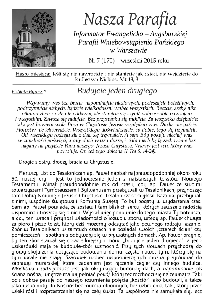 Nasza Parafia Informator Ewangelicko – Augsburskiej Parafii Wniebowstąpienia Pańskiego w Warszawie Nr 7 (170) – wrzesień 2015 roku Hasło miesiąca: Jeśli się nie nawrócicie i nie staniecie jak dzieci, nie wejdziecie do Królestwa Niebios. Mt 18, 3 Elżbieta Byrtek * Budujcie jeden drugiego Wzywamy was też, bracia, napominajcie niesfornych, pocieszajcie bojaźliwych, podtrzymujcie słabych, bądźcie wielkoduszni wobec wszystkich. Baczcie, ażeby nikt nikomu złem za złe nie oddawał, ale starajcie się czynić dobrze sobie nawzajem i wszystkim. Zawsze się radujcie. Bez przystanku się módlcie. Za wszystko dziękujcie; taka jest bowiem wola Boża w Chrystusie Jezusie względem was. Ducha nie gaście. Proroctw nie lekceważcie. Wszystkiego doświadczajcie, co dobre, tego się trzymajcie. Od wszelkiego rodzaju zła z dala się trzymajcie. A sam Bóg pokoju niechaj was w zupełności poświęci, a cały duch wasz i dusza, i ciało niech będą zachowane bez nagany na przyjście Pana naszego, Jezusa Chrystusa. Wierny jest ten, który was powołuje; On też tego dokona (1 Tes 5, 14-24). Drogie siostry, drodzy bracia w Chrystusie, Pierwszy List do Tesaloniczan ap. Paweł napisał najprawdopodobniej około roku 50. naszej ery – jest to jednocześnie jeden z najstarszych tekstów Nowego Testamentu. Minął prawdopodobnie rok od czasu, gdy ap. Paweł ze swoimi towarzyszami Tymoteuszem i Sylwanusem przebywali w Tesalonikach, przynosząc tam Dobrą Nowinę o Jezusie Chrystusie. Tesaloniczanom głosili kazania, przebywali z nimi, wspólnie świętowali Komunię Świętą. To był bogaty w wydarzenia czas. Sam ap. Paweł powiada, że zostawił tam bliskich sercu, których zawsze z radością wspomina i troszczy się o nich. Wysłał więc ponownie do tego miasta Tymoteusza, a gdy ten wraca i przynosi wiadomości o rozwoju zboru, wtedy ap. Paweł chwyta za pióro i pisze tekst, który dziś możemy odczytać jako pewnego rodzaju kazanie. Zbór w Tesalonikach w tamtych czasach nie posiadał swoich „czterech ścian” czy pomieszczeń – spotkania odbywały się w prywatnych domach. Ap. Paweł pragnie, by ten zbór stawał się coraz silniejszy i mówi „budujcie jeden drugiego”, a jego wskazówki mają tę budowlę-zbór wzmocnić. Przy tych słowach przychodzą do głowy skojarzenia dotyczące budowania domu, często nawet tym, którzy się na tym wcale nie znają. Szacunek wobec współwierzących można przyrównać do zaprawy murarskiej, której zadaniem jest łączenie cegieł czy innego budulca. Modlitwa i wdzięczność jest jak okrywający budowlę dach, a napominanie jak ściana nośna, wnętrze ma wypełniać pokój, który też rozchodzi się na zewnątrz. Taki opis dobrze pasuje do naszego rozumienia pojęcia „kościół” jako budowli, a także jako wspólnoty. To Kościół bez murów obronnych, bez uzbrojenia, taki, który przez wieki rósł i rozprzestrzeniał się na cały świat. Ta wspólnota nie zamykała się, lecz była otwarta zgodnie z zaleceniem ap. Pawła, który radził: „wszystkiego doświadczajcie, co dobre, tego się trzymajcie”. Cała gama wskazówek apostoła dotycząca zboru-kościoła skłania do wysnucia wniosku, zgodnie z którym nasz dom-zbór-kościół jest tak mocny jak jego najsłabszy element. „Baczcie, ażeby nikt nikomu złem za zło nie oddawał…”, „Od wszelkiego rodzaju zła z dala się trzymajcie” – ap. Paweł pisał w ten sposób, bo wiedział, że chrześcijanie byli i będą konfrontowani z przejawami zła. Nawoływał więc do zachowania dystansu. Tekst biblijny, który jest podstawą tego rozważania, został napisany prawie dwa tysiące lat temu. Czy jako taki ma dla nas jeszcze znaczenie? Przecież tak wiele się zmieniło – i okoliczności, i czas, i ludzie… Poza tym rada Apostoła by napominać innych, wydaje się nieaktualna – kto dziś napomina? Pocieszanie, bycie wielkodusznym – oczywiście, to moja codzienność – powie wielu ludzi. We wskazówkach Pawła znajdujemy również słowa: „radujcie się, módlcie się, dziękujcie”, bez nich rzeczywiście nie można wyobrazić sobie życia chrześcijańskiego. „Ducha nie gaście” – rada, która sprawia, że to „kazanie” ap. Pawła nie zamyka się tylko do moralnych wskazań, lecz także pozwala trwać wierzącym we wspólnocie wierzących-Kościele. Nasi poprzednicy „ducha nie gasili”, „wszystkiego doświadczali, dobrego się trzymali…”. Te rady pozostają więc współcześnie aktualne i elementarne! Zarówno okazywanie radości, nieustanna modlitwa, a także wdzięczność wydają się trochę staromodne, a czasem wręcz ich okazywanie zawstydza. Przypomnijmy sobie zachowanie dziecka, które powinno podziękować – zazwyczaj musi mu o tym przypomnieć rodzic i bardzo często słowo „dziękuję” jest wypowiedziane ze wstydem. Nierzadko podobnie bywa z dorosłym, ale ten już lepiej umie zamaskować zawstydzenie. Jakże często zapomina się o okazywaniu i wyrażeniu wdzięczności za to, co każdego dnia otrzymujemy, czy za to, że możemy swobodnie, w pięknych kościołach czy pomieszczeniach spotykać się, słuchać Słowa Bożego i swobodnie o nim dyskutować. Współcześnie nawet psychologowie powtarzają: chcesz być szczęśliwy – bądź wdzięczny. Na zakończenie przytoczę pewną historię: Król pewnego państwa codziennie otrzymywał różne prezenty, codziennie też żebrak przynosił mu jabłko, a król bez większego zainteresowania odkładał je do koszyka. Pewnego dnia małpa złapała jedno z tych jabłek, ugryzła i od razu wypluła, w wyplutym kawałku ukryta była piękna perła. Król kazał natychmiast wezwać żebraka, który odpowiedział: Panie przynosiłem ci codziennie jabłko, codziennie nowe jabłko, a ty wkładałeś je kosza. Masz tak wiele rzeczy i bogactw, że zwykła rzecz cię nie cieszy, nie dostrzegasz, nie doświadczasz niezwykłej wartości prostych rzeczy i wydarzeń. Napom