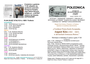 8 kwietnia o godzinie 17.00 odbędzie się spotkanie autorskie Grzegorza Książka. Jego debiut literacki, książka pt. „LUSTRO” właśnie się ukazała. ZAPRASZAMY PLAN ZAJĘĆ STAŁYCH w MDK Podlesie Poniedziałek 15.00 – 18.00 Nauka gry na pianinie 15.30 – 17.00 Język angielski 17.00 - 18.00 Gwiazdeczki 18.00 – 19.00 Hip hop Wtorek 9.00 – 11.00 Akademia Malucha 16.00 – 17.00 Aerobik dla dzieci 17.00 – 18.00 Hip hop 19.00 – 20.00 Aerobik Środa 15.00 – 19.00 Nauka gry na pianinie 16.00 – 17.00 Plastyka gr. I 17.15 – 18.45 Plastyka gr. II 18.00 – 20.00 Warsztaty rękodzielnicze Czwartek 9.00 – 11.00 Akademia Malucha 17.00 – 20.00 Wieczory skatowe 19.00 – 20.00 Aerobik Piątek 17.00 – 20.00 Szachy 17.00 – 20.00 Kurs rysunku i malarstwa dla dorosłych www.mdkpoludnie.com e-mail: [email protected] tel. 32 / 201-50-10 Miejski Dom Kultury POŁUDNIE w Podlesiu, 40-748 Katowice, ul. Sołtysia 25 POŁEDNICA INFORMATOR MIEJSKIEGO DOMU KULTURY „POŁUDNIE” w Podlesiu marzec / kwiecień 2011 WYSTAWY * WERNISAŻE * KONCERTY * PRELEKCJE * SPOTKANIA AUTORSKIE * ZAJĘCIA DLA DZIECI, MŁODZIEŻY I DOROSŁYCH * IMPREZY OKOLICZNOŚCIOWE Miejski Dom Kultury „Południe” w Podlesiu zaprasza na wystawę zatytułowaną: „Z kolekcji Petera Karla Sczepanka. August Kiss (1802 – 1865) w akwarelach Ireneusza Botora.” Wernisaż w niedzielę 27 marca o godz.17.00 w programie: godz. 17.00 - prelekcja P. K. Sczepanka na temat życia i twórczości Augusta Kissa godz. 18.00 - koncert pt. MAGIA DUETU przygotowany przez Instytucję Promocji i Upowszechniania Muzyki „Silesia”. Tytułowy duet jest rodzeństwem: Katarzyna Merta (śpiew, skrzypce) i Konrad Merta (akordeon). Młodzi, utalentowani, nagradzani na festiwalch i konkursach (I miejsce w XV Ogólnopolskim Festiwalu Kolęd i Pastorałek w Będzinie, Nagroda Główna XXII Małopolskiego Festiwalu Talenty Małopolski 2009 i wiele innych. Wystepowali m. in. na Zamku Sułkowskich w Bielsku-Białej, i w krakowskiej Piwnicy pod Baranami). U nas zaprezentują tradycyjną muzykę i pieśni bałkańskie, serbskie, macedońskie i żydowskie. Wstęp wolny. Wystawa czynna od 27 marca do 24 maja 2011 r. Miejski Dom Kultury „Południe” Podlesie ul. Sołtysia 25 Właściciel kolekcji akwarel prezentowanych na wystawie, Peter Karl Sczepanek jest znanym w fachowych kręgach, miłośnikiem i znawcą historii i kultury Śląska. Jego niewątpliwą zasługą jest przywracanie naszej pamięci wybitnych postaci tej ziemi, o których przez lata całe należało milczeć , a i teraz z dużymi oporami przyjmujemy do wiadomości ich istnienie. P. K. Sczepanek zebrał najpełniejszą jak do tej pory dokumentację na temat twórczości Augusta Kissa. Fotografując prace rzeźbiarskie Kissa w Berlinie, Poczdamie i europejskich muzeach zdecydował się nadać im jednorodną formę zamawiając akwarelę każdej rzeźby u dr Ireneusza Botora. Powstała w ten sposób kompilacja działań trzech osób: kolekcjonera P.K. Sczepanka, nieżyjącego rzeźbiarza Augusta Kissa i tworzącego aktualnie artysty malarza Ireneusza Botora. Łączy ich miejsce urodzenia – Tychy. Mam nadzieję, że wystawa uświadomi nam jak duże bogactwo i różnorodność kultury najbliższego nam miejsca pozostaje jeszcze nieodkrytą. Św. Jerzy walczący ze smokiem. Rzeźba Augusta Kissa stojąca na głównym dziedzińcu berlińskiego zamku. Mal. I.Botor AUGUST KISS rzeźbiarz śląski – postać zapomniana Karol August Edward Kiss urodził się w Paprocanach, 11 października 1802 roku. Jego ojciec piastował stanowisko inspektora książęcych (Fryderyk Anhalt-Koethen książę pszczyński) hut i kopalń. W roku 1822 wyjechał na studia do Berlina, do tamtejszej Akademii Sztuk Pięknych. Kształcił się pod okiem profesora Raucha. Był znakomitym rzeźbiarzem. Sławę zdobył realizując pomniki i inne rzeźby monumentalne. Jego najbardziej znane dzieła to: -posąg Amazonki walczącej z tygrysem (przed berlińskim Muzeum Starożytności), zdobyła w 1855 r. nagrodę na Wystawie Światowej w Paryżu. -posąg św. Michała w Babelsbergu (koło Poczdamu), -święty Jerzy zabijający smoka (na głównym dziedzińcu berlińskiego zamku) -posąg Fryderyka Wielkiego na koniu z 1847 we Wrocławiu -pomnik z brązu Fryderyka II z 1861 we Wrocławiu (oba nie zachowane). Kiss był profesorem w berlińskim Instytucie Rzemiosła. W roku 1837 został członkiem Berlińskiej Akademii Sztuk Pięknych. Zmarł 24 marca 1865 roku w Berlinie. Przed śmiercią ustanowił fundację w wysokości 200 talarów, za odsetki z której miały być kupowane przybory szkolne dla dzieci pracowników Paprockiej Huty. Czesław Grot podaje w swej monografii „Paprocany”, że zakupy te realizowano jeszcze na potrzeby uczniów w latach międzywojennych. W swym testamencie Kiss zapisał 300 tysięcy marek dla berlińskiego muzeum na zakup dziewiętnastowiecznych dzieł sztuki. W 2003 roku w Paprocanach, w pobliżu Paprockiej Huty, odsłonięto pomnik upamiętniający Augusta Kissa. (Autorem płaskorzeźby na pamiątkowym obelisku jest Augustyn Dyrda współczesny rzeźbiarz, również z Paprocan) (Na podstawie publikacji „Huta Paprocka” Muzeum Miejskie w Tychach, 2007 oprac. S. P. Botor)