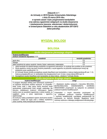 Załącznik nr 1 do Uchwały nr 29/10 Senatu Uniwersytetu Gdańskiego z dnia 25 marca 2010 roku w sprawie zasad i trybu przyjmowania kandydatów oraz zakresu egzaminów wstępnych na studia stacjonarne i niestacjonarne (zaoczne, wieczorowe i eksternistyczne) w Uniwersytecie Gdańskim w roku akademickim 2011/2012 (tekst jednolity) WYDZIAŁ BIOLOGII BIOLOGIA studia stacjonarne pierwszego stopnia Kryteria kwalifikacyjne konkurs świadectw dojrzałości 1,2,3,4) przedmiot mnożnik przedmiotu język obcy 0,2 biologia 0,5 jeden przedmiot do wyboru spośród: chemia, fizyka i astronomia, matematyka 0,3 1. Jeżeli kandydat nie zdawał danego przedmiotu na egzaminie maturalnym, to uzyskuje zero punktów za ten przedmiot. 2. Wynik egzaminu mnoży się przez mnożnik przedmiotu, a wynik egzaminu na poziomie rozszerzonym mnoży się dodatkowo przez współczynnik 1,5. 3. § 6 Uchwały Senatu określa szczegółowe zasady klasyfikacji ocen kandydatów z maturą międzynarodową IB (ust. 1 i 2), maturą europejską EB (ust. 3), kandydatów klas dwujęzycznych (ust. 4) oraz z nową maturą 2002 (ust. 5). 4. Szczegółowe zasady klasyfikacji ocen kandydatów ze starą maturą - określa § 7 Uchwały Senatu. studia stacjonarne drugiego stopnia kryteria kwalifikacyjne O przyjęciu decyduje ranking ocen końcowych uzyskanych na dyplomie ukończenia studiów wyższych. W przypadku, kiedy liczba osób z taką samą oceną końcową może spowodować przekroczenie limitu przyjęć ustalonego dla kierunku, dodatkowym kryterium różnicującym będzie średnia ocen ze wszystkich egzaminów z okresu studiów, za wyjątkiem oceny z pracy dyplomowej i egzaminu dyplomowego. Do konkursu należy przedstawić dyplom ukończenia studiów wyższych i indeks lub wypis ocen z indeksu wystawiony przez uczelnię, której kandydat jest absolwentem. uwagi 1. Absolwenci studiów wyższych z kierunków BIOLOGIA, BIOTECHNOLOGIA, OCEANOGRAFIA, OCHRONA ŚRODOWISKA przyjmowani są wyłącznie na podstawie podanych kryteriów kwalifikacyjnych. 2.Kandydaci z innych kierunków przyjmowani są na podstawie podanych kryteriów kwalifikacyjnych i rozmowy kwalifikacyjnej, oceniającej predyspozycje do studiowania na kierunku Biologia. Negatywny wynik rozmowy wyklucza z dalszego postępowania rekrutacyjnego. 1 BIOLOGIA studia niestacjonarne pierwszego stopnia5) Kryteria kwalifikacyjne konkurs świadectw dojrzałości 1,2,3,4) przedmiot mnożnik przedmiotu język obcy 0,2 biologia 0,5 jeden przedmiot do wyboru spośród: chemia, fizyka i astronomia, matematyka 0,3 1. Jeżeli kandydat nie zdawał danego przedmiotu na egzaminie maturalnym, to uzyskuje zero punktów za ten przedmiot. 2. Wynik egzaminu mnoży się przez mnożnik przedmiotu, a wynik egzaminu na poziomie rozszerzonym mnoży się dodatkowo przez współczynnik 1,5. 3. § 6 Uchwały Senatu określa szczegółowe zasady klasyfikacji ocen kandydatów z maturą międzynarodową IB (ust. 1 i 2), maturą europejską EB (ust. 3), kandydatów klas dwujęzycznych (ust. 4) oraz z nową maturą 2002 (ust. 5). 4. Szczegółowe zasady klasyfikacji ocen kandydatów ze starą maturą - określa § 7 Uchwały Senatu. 5. Studia zostaną uruchomione w przypadku przyjęcia minimum 40 osób. studia niestacjonarne drugiego stopnia kryteria kwalifikacyjne O przyjęciu decyduje ranking ocen końcowych uzyskanych na dyplomie ukończenia studiów wyższych. W przypadku, kiedy liczba osób z taką samą oceną końcową może spowodować przekroczenie limitu przyjęć ustalonego dla kierunku, dodatkowym kryterium różnicującym będzie średnia ocen ze wszystkich egzaminów z okresu studiów, za wyjątkiem oceny z pracy dyplomowej i egzaminu dyplomowego. Do konkursu należy przedstawić dyplom ukończenia studiów wyższych i indeks lub wypis ocen z indeksu wystawiony przez uczelnię, której kandydat jest absolwentem. uwagi 1. Absolwenci studiów wyższych z kierunków BIOLOGIA, BIOTECHNOLOGIA, OCEANOGRAFIA, OCHRONA ŚRODOWISKA przyjmowani są wyłącznie na podstawie podanych kryteriów kwalifikacyjnych. 2.Kandydaci z innych kierunków przyjmowani są na podstawie podanych kryteriów kwalifikacyjnych i rozmowy kwalifikacyjnej, oceniającej predyspozycje do studiowania na kierunku Biologia. Negatywny wynik rozmowy wyklucza z dalszego postępowania rekrutacyjnego. Studia zostaną uruchomione w przypadku przyjęcia minimum 24 osób. 2 NEUROBIOLOGIA* studia stacjonarne pierwszego stopnia Kryteria kwalifikacyjne konkurs świadectw dojrzałości 1,2,3,4) przedmiot mnożnik przedmiotu język obcy 0,2 biologia 0,4 dwa przedmioty do wyboru spośród: chemia, informatyka, matematyka, fizyka i 0,2 astronomia 1. Jeżeli kandydat nie zdawał danego przedmiotu na egzaminie maturalnym, to uzyskuje zero punktów za ten przedmiot. 2. Wynik egzaminu mnoży się przez mnożnik przedmiotu, a wynik egzaminu na poziomie rozszerzonym mnoży się dodatkowo przez współczynnik 1,5. 3. § 6 Uchwały Senatu określa szczegółowe zasady klasyfikacji ocen kandydatów z maturą międzynarodową IB (ust. 1 i 2), maturą europejską EB (ust. 3), kandydatów klas dwujęzycznych (ust. 4) oraz z nową maturą 2002 (ust. 5). 4. Szczegółowe zasady klasyfikacji ocen kandydatów ze starą maturą - określa § 7 Uchwały Senatu. Uwaga: * Rekrutacja zostanie uruchomiona pod warunkiem zatwierdzenia kierunku przez Ministra Nauki i Szkolnictwa Wyższego w terminie do dnia rozpoczęcia rekrutacji. makrokierunek PRZYRODA studia stacjonarne pierwszego stopnia Kryteria kwalifikacyjne konkurs świadectw dojrzałości 1,2,3,4) przedmiot mnożnik przedmiotu język obcy 0,2 dwa przedmioty do wyboru spośród: biologia, geografia, chemia, fizyka i astronomia, 0,4 matematyka 1. Jeżeli kandydat nie zdawał danego przedmiotu na egzaminie maturalnym, to uzyskuje zero punktów za ten przedmiot. 2. Wynik egzaminu mnoży się przez mnożnik przedmiotu, a wynik egzaminu na poziomie rozszerzonym mnoży się dodatkowo przez współczynnik 1,5. 3. § 6 Uchwa