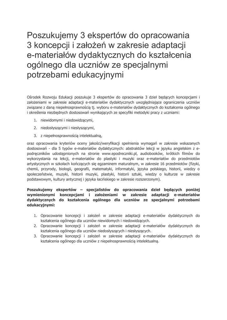 Poszukujemy 3 ekspertów do opracowania 3 koncepcji i założeń w zakresie adaptacji e-materiałów dydaktycznych do kształcenia ogólnego dla uczniów ze specjalnymi potrzebami edukacyjnymi Ośrodek Rozwoju Edukacji poszukuje 3 ekspertów do opracowania 3 dzieł będących koncepcjami i założeniami w zakresie adaptacji e-materiałów dydaktycznych uwzględniające ograniczenia uczniów związane z daną niepełnosprawnością tj. wyboru e-materiałów dydaktycznych do kształcenia ogólnego i określenia niezbędnych dostosowań wynikających ze specyfiki metodyki pracy z uczniami: 1. niewidomymi i niedowidzącymi, 2. niedosłyszącymi i niesłyszącymi, 3. z niepełnosprawnością intelektualną, oraz opracowania kryteriów oceny jakości/weryfikacji spełnienia wymagań w zakresie wskazanych dostosowań - dla 5 typów e-materiałów dydaktycznych: abstraktów lekcji w języku angielskim z epodręczników udostępnionych na stronie www.epodreczniki.pl, audiobooków, krótkich filmów do wykorzystania na lekcji, e-materiałów do plastyki i muzyki oraz e-materiałów do przedmiotów artystycznych w szkołach kończących się egzaminem maturalnym, w zakresie 16 przedmiotów (fizyki, chemii, przyrody, biologii, geografii, matematyki, informatyki, języka polskiego, historii, wiedzy o społeczeństwie, muzyki, historii muzyki, plastyki, historii sztuki, wiedzy o kulturze w zakresie podstawowym, kultury antycznej i języka łacińskiego w zakresie rozszerzonym). Poszukujemy ekspertów – specjalistów do opracowania dzieł będących poniżej wymienionymi koncepcjami i założeniami w zakresie adaptacji e-materiałów dydaktycznych do kształcenia ogólnego dla uczniów ze specjalnymi potrzebami edukacyjnymi: 1. Opracowanie koncepcji kształcenia ogólnego dla 2. Opracowanie koncepcji kształcenia ogólnego dla 3. Opracowanie koncepcji kształcenia ogólnego dla i założeń w zakresie adaptacji e-materiałów dydaktycznych do uczniów niewidomych i niedowidzących. i założeń w zakresie adaptacji e-materiałów dydaktycznych do uczniów niedosłyszących i niesłyszących. i założeń w zakresie adaptacji e-materiałów dydaktycznych do uczniów z niepełnosprawnością intelektualną. 2 Opracowanie koncepcji i założeń w zakresie adaptacji e-materiałów dydaktycznych do kształcenia ogólnego dla uczniów niedosłyszących i niesłyszących. Ośrodek Rozwoju Edukacji poszukuje 1 eksperta do wykonanie dzieła będącego koncepcją i założeniami w zakresie adaptacji e-materiałów dydaktycznych uwzględniające ograniczenia uczniów związane z daną niepełnosprawnością tj. określenia niezbędnych dostosowań wynikających ze specyfiki metodyki pracy z uczniami niedosłyszącymi i niesłyszącymi, na potrzeby ogłoszenia konkursu w 2016 r. na opracowanie e-materiałów dydaktycznych w zakresie powyżej wspomnianych przedmiotów w ramach Osi priorytetowej II, Działania 2.10 Programu Operacyjnego Wiedza Edukacja Rozwój na lata 2014-2020. E-materiał należy rozumieć jako edukacyjny, otwarty i łatwo dostępny materiał dydaktycznych on-line, umożliwiający realizację pełnej godziny nauczania, w skład którego wchodzą: scenariusz lekcji oraz minimum 2 zasoby multimedialne. Zadaniem eksperta będzie: 1. Opracowanie koncepcji i założeń w zakresie adaptacji e-materiałów dydaktycznych do potrzeb uczniów niedosłyszących i niesłyszących dla 5 typów e-materiałów dydaktycznych (abstrakty lekcji w języku angielskim z e-podręczników udostępnionych na stronie www.epodreczniki.pl, audiobooki, krótkie filmy do wykorzystania na lekcji, e-materiały do plastyki i muzyki oraz e-materiały do przedmiotów artystycznych w szkołach kończących się egzaminem maturalnym), w tym: - opracowanie założeń do e-materiałów dedykowanych dla uczniów niedosłyszących i niesłyszących; - określenie metodyki pracy z uczniami niedosłyszącymi i niesłyszącymi z wykorzystaniem 5 typów e-materiałów dydaktycznych. 2. Opracowanie kryteriów oceny jakości pod względem weryfikacji spełnienia wymagań w zakresie dostępności e-materiałów dydaktycznych do potrzeb uczniów niedosłyszących i niesłyszących, w tym opracowanie karty oceny e-materiału dydaktycznego zawierającej kryteria niezbędne do dokonania oceny dostępności poszczególnych e-materiałów dydaktycznych stworzonych przez beneficjentów konkursowych dla tej grupy uczniów. ZASADY WSPÓŁPRACY Osoby opracowujące koncepcje i założenia są zobowiązane do współpracy z Zamawiającym podczas przygotowania dzieł, w tym do: kontaktów zdalnych z wyznaczonymi pracownikami ORE: ekspertem ds. interwencji publicznej i głównym ekspertem ds. merytorycznych, udziału w co najmniej jednym jednodniowych spotkaniach konsultacyjnych – proponowany termin 8 lipca 2016 r. Zamawiający przewiduje współpracę na podstawie umowy o dzieło. TERMINY REALIZACJI ZADANIA Opracowanie dzieła rozpocznie się niezwłocznie po podpisaniu umowy o dzieło, termin oddania nie później niż 22 sierpnia 2016 r. WARUNKI ZMIANY UMOWY Zamawiający zastrzega możliwość zmiany treści umowy w stosunku do treści oferty, na podstawie której dokonano wyboru Wykonawcy, w zakresie terminów wykonania umowy oraz terminów odbioru przedmiotu umowy. Zmiana terminu wykonania Dzieła możliwa jest w przypadku przedłużających się procedur przyjmowania projektu pozakonkursowego koncepcyjnego do realizacji lub innych uzasadnionych przyczyn wskazanych przez Zamawiającego mających wpływ na wykonanie niniejszej umowy. Zmiana umowy z powodów, o których mowa w zdaniu poprzednim, możliwa jest pod warunkiem poinformowania Wykonawcy przez Zamawiającego o konieczności wprowadzenia zmiany wraz z podaniem przyczyn żądanej zmiany. Zmiana terminów, o których mowa w zdaniu poprzednim może nastąpić z inicjatywy Zamawiającego, po uzgodnieniach z Wykonawcą. Zamawiający zastrzega sobie możliwość modyfikacji przedmiotu zamówienia 