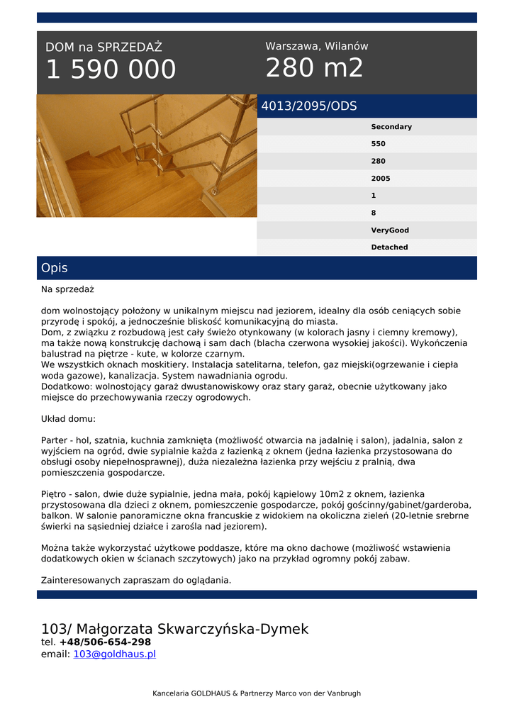 DOM na SPRZEDAŻ 1 590 000 Warszawa, Wilanów 280 m2 4013/2095/ODS Secondary 550 280 2005 1 8 VeryGood Detached Opis Na sprzedaż dom wolnostojący położony w unikalnym miejscu nad jeziorem, idealny dla osób ceniących sobie przyrodę i spokój, a jednocześnie bliskość komunikacyjną do miasta. Dom, z związku z rozbudową jest cały świeżo otynkowany (w kolorach jasny i ciemny kremowy), ma także nową konstrukcję dachową i sam dach (blacha czerwona wysokiej jakości). Wykończenia balustrad na piętrze - kute, w kolorze czarnym. We wszystkich oknach moskitiery. Instalacja satelitarna, telefon, gaz miejski(ogrzewanie i ciepła woda gazowe), kanalizacja. System nawadniania ogrodu. Dodatkowo: wolnostojący garaż dwustanowiskowy oraz stary garaż, obecnie użytkowany jako miejsce do przechowywania rzeczy ogrodowych. Układ domu: Parter - hol, szatnia, kuchnia zamknięta (możliwość otwarcia na jadalnię i salon), jadalnia, salon z wyjściem na ogród, dwie sypialnie każda z łazienką z oknem (jedna łazienka przystosowana do obsługi osoby niepełnosprawnej), duża niezależna łazienka przy wejściu z pralnią, dwa pomieszczenia gospodarcze. Piętro - salon, dwie duże sypialnie, jedna mała, pokój kąpielowy 10m2 z oknem, łazienka przystosowana dla dzieci z oknem, pomieszczenie gospodarcze, pokój gościnny/gabinet/garderoba, balkon. W salonie panoramiczne okna francuskie z widokiem na okoliczna zieleń (20-letnie srebrne świerki na sąsiedniej działce i zarośla nad jeziorem). Można także wykorzystać użytkowe poddasze, które ma okno dachowe (możliwość wstawienia dodatkowych okien w ścianach szczytowych) jako na przykład ogromny pokój zabaw. Zainteresowanych zapraszam do oglądania. 103/ Małgorzata Skwarczyńska-Dymek tel. +48/506-654-298 email: [email protected] Kancelaria GOLDHAUS & Partnerzy Marco von der Vanbrugh Kancelaria GOLDHAUS & Partnerzy Marco von der Vanbrugh Powered by TCPDF (www.tcpdf.org)