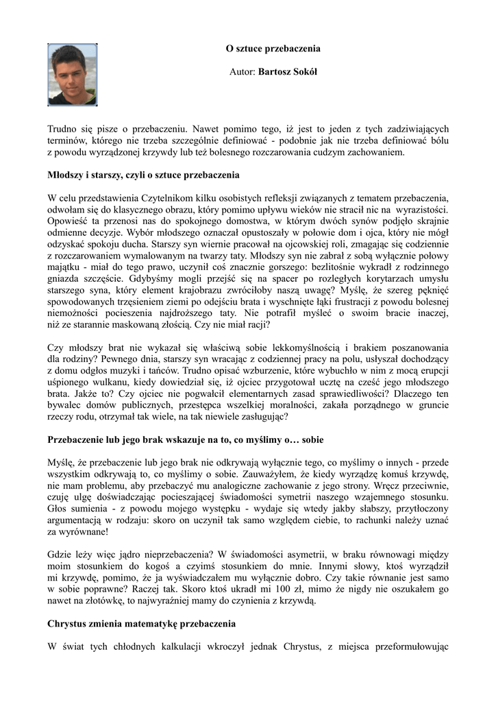 O sztuce przebaczenia Autor: Bartosz Sokół Trudno się pisze o przebaczeniu. Nawet pomimo tego, iż jest to jeden z tych zadziwiających terminów, którego nie trzeba szczególnie definiować - podobnie jak nie trzeba definiować bólu z powodu wyrządzonej krzywdy lub też bolesnego rozczarowania cudzym zachowaniem. Młodszy i starszy, czyli o sztuce przebaczenia W celu przedstawienia Czytelnikom kilku osobistych refleksji związanych z tematem przebaczenia, odwołam się do klasycznego obrazu, który pomimo upływu wieków nie stracił nic na wyrazistości. Opowieść ta przenosi nas do spokojnego domostwa, w którym dwóch synów podjęło skrajnie odmienne decyzje. Wybór młodszego oznaczał opustoszały w połowie dom i ojca, który nie mógł odzyskać spokoju ducha. Starszy syn wiernie pracował na ojcowskiej roli, zmagając się codziennie z rozczarowaniem wymalowanym na twarzy taty. Młodszy syn nie zabrał z sobą wyłącznie połowy majątku - miał do tego prawo, uczynił coś znacznie gorszego: bezlitośnie wykradł z rodzinnego gniazda szczęście. Gdybyśmy mogli przejść się na spacer po rozległych korytarzach umysłu starszego syna, który element krajobrazu zwróciłoby naszą uwagę? Myślę, że szereg pęknięć spowodowanych trzęsieniem ziemi po odejściu brata i wyschnięte łąki frustracji z powodu bolesnej niemożności pocieszenia najdroższego taty. Nie potrafił myśleć o swoim bracie inaczej, niż ze starannie maskowaną złością. Czy nie miał racji? Czy młodszy brat nie wykazał się właściwą sobie lekkomyślnością i brakiem poszanowania dla rodziny? Pewnego dnia, starszy syn wracając z codziennej pracy na polu, usłyszał dochodzący z domu odgłos muzyki i tańców. Trudno opisać wzburzenie, które wybuchło w nim z mocą erupcji uśpionego wulkanu, kiedy dowiedział się, iż ojciec przygotował ucztę na cześć jego młodszego brata. Jakże to? Czy ojciec nie pogwałcił elementarnych zasad sprawiedliwości? Dlaczego ten bywalec domów publicznych, przestępca wszelkiej moralności, zakała porządnego w gruncie rzeczy rodu, otrzymał tak wiele, na tak niewiele zasługując? Przebaczenie lub jego brak wskazuje na to, co myślimy o… sobie Myślę, że przebaczenie lub jego brak nie odkrywają wyłącznie tego, co myślimy o innych - przede wszystkim odkrywają to, co myślimy o sobie. Zauważyłem, że kiedy wyrządzę komuś krzywdę, nie mam problemu, aby przebaczyć mu analogiczne zachowanie z jego strony. Wręcz przeciwnie, czuję ulgę doświadczając pocieszającej świadomości symetrii naszego wzajemnego stosunku. Głos sumienia - z powodu mojego występku - wydaje się wtedy jakby słabszy, przytłoczony argumentacją w rodzaju: skoro on uczynił tak samo względem ciebie, to rachunki należy uznać za wyrównane! Gdzie leży więc jądro nieprzebaczenia? W świadomości asymetrii, w braku równowagi między moim stosunkiem do kogoś a czyimś stosunkiem do mnie. Innymi słowy, ktoś wyrządził mi krzywdę, pomimo, że ja wyświadczałem mu wyłącznie dobro. Czy takie równanie jest samo w sobie poprawne? Raczej tak. Skoro ktoś ukradł mi 100 zł, mimo że nigdy nie oszukałem go nawet na złotówkę, to najwyraźniej mamy do czynienia z krzywdą. Chrystus zmienia matematykę przebaczenia W świat tych chłodnych kalkulacji wkroczył jednak Chrystus, z miejsca przeformułowując istniejące równanie. Jego zdaniem taki dobór wartości jest pięknym oszustwem, nieodzwierciedlającym w żaden sposób rzeczywistości - skupia się na tym, co zrobiliśmy, a nie na tym, kim jesteśmy. Innymi słowy, może rzeczywiście Kowalski oszukał mnie na 100 zł, mimo że zawsze wyświadczałem mu dobro, jednak co w sytuacji, w której w miejsce dobra wyświadczanego Kowalskiemu wstawiłbym całe zło, które wyrządziłem innym? Szala przechyli się na drugą stronę! Oto rewolucja w myśleniu chrystusowym, która zupełnie zmienia rozkład sił. Od tej pory nie staję przed Kowalskim jako wierzyciel Kowalskiego, staję jako dłużnik ludzi i - przede wszystkim - Boga. Nawet jeśli Kowalski okradł mnie na 100 zł, to ja - podsumowując wszystkie moje występki - okradłem bliźnich na znacznie wyższą kwotę. Chrystus kładł ponadprzeciętny nacisk na przebaczenie, ponieważ jest ono instrumentem wskazującym poziom pokory. U przyczyn nieprzebaczenia leży pycha, przekonanie o swojej moralnej wyższości. O tym, że ktoś jest mi winien więcej, niż ja jestem winien innym. Nieprzebaczenie jest amnezją, utratą szerszego kontekstu życia. To jak w ewangelicznej historii o dłużniku, który zapomniał jak wiele mu darowano, poniżając okrutnie swojego dłużnika z powodu znacznie mniejszej kwoty. Każdy z nas jest przecież dłużnikiem, któremu darowano niewyobrażalny dług. Ten duchowy kontekst rodzić powinien olbrzymią pokorę względem każdego, kto wyrządził nam krzywdę. Gdy przebaczamy, nie ogłaszamy, że nas nie skrzywdzono ogłaszamy, że my krzywdziliśmy bardziej, a - pomimo to - przebaczono nam. Nie jestem bardziej święty od młodszego brata Każdy z nas bywa starszym synem z opowieści Jezusa. Paradoksalnie, nie jestem pewien, którego z braci uznać należy za syna marnotrawnego. Starszy powiedział ojcu: „Oto tyle lat służę ci i nigdy nie przestąpiłem rozkazu twego.” Oto jedno z najbardziej niewiarygodnych “nigdy” w całym Piśmie Świętym. Kiedy myślę o sobie, swojej podróży za Bogiem, musiałbym powiedzieć coś zgoła innego: „Oto tyle lat ci służę i tysiące razy przestąpiłem twoje rozkazy.” Z tej perspektywy, młodszy brat wygląda zupełnie inaczej. Nie jest tym słabszym, jest równie słaby jak ja – tyle, że inaczej. Nie jest tym bardziej grzesznym, jest równie grzeszny jak ja - tyle, że inaczej. To zadziwiające jak bardzo gniewamy się na te czyny nieprzychylnych nam ludzi, które sami wielokrotnie powtarzamy, racjonalizując przy tym na tysiąc różnych sposob
