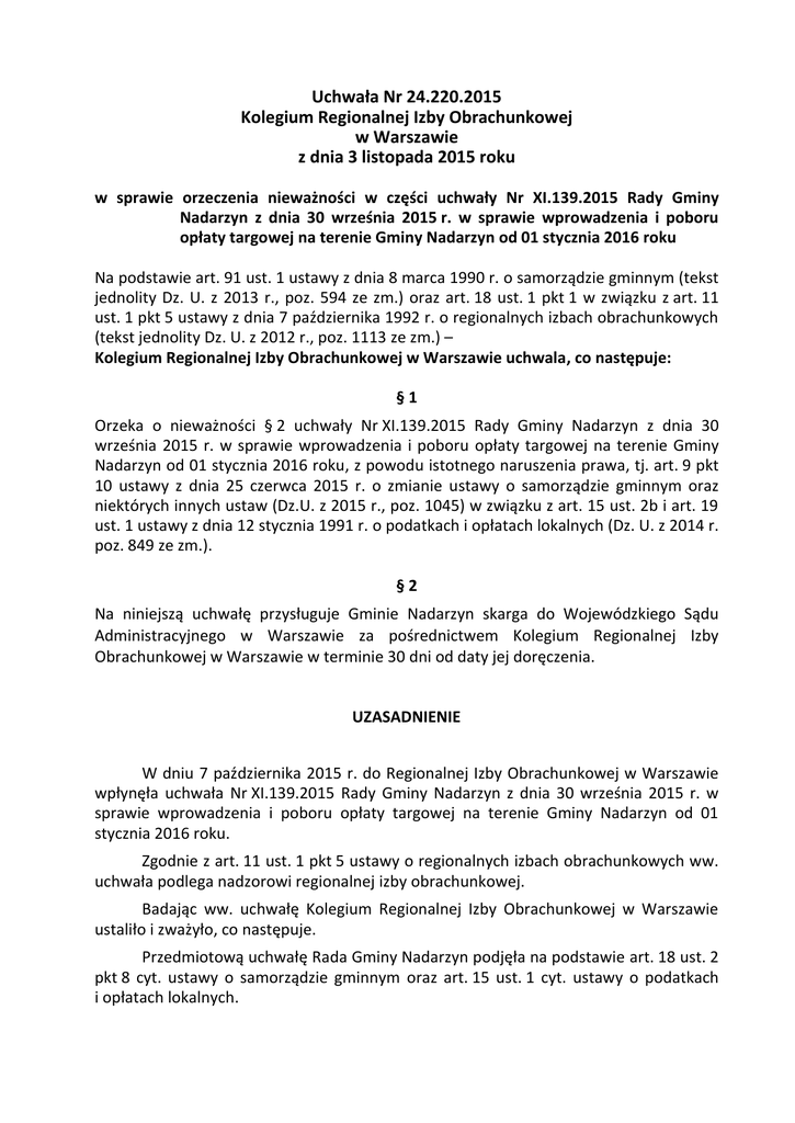 Uchwała Nr 24.220.2015 Kolegium Regionalnej Izby Obrachunkowej w Warszawie z dnia 3 listopada 2015 roku w sprawie orzeczenia nieważności w części uchwały Nr XI.139.2015 Rady Gminy Nadarzyn z dnia 30 września 2015 r. w sprawie wprowadzenia i poboru opłaty targowej na terenie Gminy Nadarzyn od 01 stycznia 2016 roku Na podstawie art. 91 ust. 1 ustawy z dnia 8 marca 1990 r. o samorządzie gminnym (tekst jednolity Dz. U. z 2013 r., poz. 594 ze zm.) oraz art. 18 ust. 1 pkt 1 w związku z art. 11 ust. 1 pkt 5 ustawy z dnia 7 października 1992 r. o regionalnych izbach obrachunkowych (tekst jednolity Dz. U. z 2012 r., poz. 1113 ze zm.) – Kolegium Regionalnej Izby Obrachunkowej w Warszawie uchwala, co następuje: §1 Orzeka o nieważności § 2 uchwały Nr XI.139.2015 Rady Gminy Nadarzyn z dnia 30 września 2015 r. w sprawie wprowadzenia i poboru opłaty targowej na terenie Gminy Nadarzyn od 01 stycznia 2016 roku, z powodu istotnego naruszenia prawa, tj. art. 9 pkt 10 ustawy z dnia 25 czerwca 2015 r. o zmianie ustawy o samorządzie gminnym oraz niektórych innych ustaw (Dz.U. z 2015 r., poz. 1045) w związku z art. 15 ust. 2b i art. 19 ust. 1 ustawy z dnia 12 stycznia 1991 r. o podatkach i opłatach lokalnych (Dz. U. z 2014 r. poz. 849 ze zm.). §2 Na niniejszą uchwałę przysługuje Gminie Nadarzyn skarga do Wojewódzkiego Sądu Administracyjnego w Warszawie za pośrednictwem Kolegium Regionalnej Izby Obrachunkowej w Warszawie w terminie 30 dni od daty jej doręczenia. UZASADNIENIE W dniu 7 października 2015 r. do Regionalnej Izby Obrachunkowej w Warszawie wpłynęła uchwała Nr XI.139.2015 Rady Gminy Nadarzyn z dnia 30 września 2015 r. w sprawie wprowadzenia i poboru opłaty targowej na terenie Gminy Nadarzyn od 01 stycznia 2016 roku. Zgodnie z art. 11 ust. 1 pkt 5 ustawy o regionalnych izbach obrachunkowych ww. uchwała podlega nadzorowi regionalnej izby obrachunkowej. Badając ww. uchwałę Kolegium Regionalnej Izby Obrachunkowej w Warszawie ustaliło i zważyło, co następuje. Przedmiotową uchwałę Rada Gminy Nadarzyn podjęła na podstawie art. 18 ust. 2 pkt 8 cyt. ustawy o samorządzie gminnym oraz art. 15 ust. 1 cyt. ustawy o podatkach i opłatach lokalnych. W § 1 uchwały Rada postanowiła „Na terenie Gminy Nadarzyn wprowadza się opłatę targową”. W § 2 uchwały Rada Gminy postanowiła „Opłatę targową pobiera się od osób fizycznych, osób prawnych oraz jednostek organizacyjnych nieposiadających osobowości prawnej, dokonujących sprzedaży na targowisku”. W myśl art. 18 ust. 2 pkt 8 cyt. ustawy o samorządzie gminnym do wyłącznej właściwości rady gminy należy podejmowanie uchwał w sprawach podatków i opłat w granicach określonych w odrębnych ustawach. W rozpatrywanej sprawie ustawą, która określa zakres upoważnienia rady gminy jest ustawa o podatkach i opłatach lokalnych. W myśl art. 15 ust. 1 ustawy o podatkach i opłatach lokalnych w brzmieniu nadanym art. 9 pkt 10 ustawy z dnia 25 czerwca 2015 r. o zmianie ustawy o samorządzie gminnym oraz niektórych innych ustaw (Dz. U. z 2015 r. poz. 1045), który wejdzie w życie z dniem 1 stycznia 2016 roku, Rada gminy może wprowadzić opłatę targową. Opłatę targową pobiera się od osób fizycznych, osób prawnych oraz jednostek organizacyjnych nieposiadających osobowości prawnej, dokonujących sprzedaży na targowiskach, z zastrzeżeniem ust. 2b. Stosownie do art. 15 ust. 2 ustawy o podatkach i opłatach lokalnych targowiskami są wszelkie miejsca, w których jest prowadzona sprzedaż. Zaś art. 15 ust. 2b ww. ustawy stanowi, że opłacie targowej nie podlega sprzedaż dokonywana w budynkach lub w ich częściach. Zakres opłaty targowej określony w § 2 badanej uchwały jest szerszy niż określony ustawowo, tj. w art. 15 ust. 1 zdanie drugie ustawy o podatkach i opłatach lokalnych w brzmieniu obowiązującym od dnia 1 stycznia 2016 r. Art. 19 pkt 1 ustawy o podatkach i opłatach lokalnych stanowi delegację dla rady gminy do określenia zasad ustalania i poboru oraz terminów płatności i wysokości stawki opłaty targowej. Na podstawie art. 19 pkt 2 tejże ustawy rada gminy może zarządzić pobór opłaty targowej w drodze inkasa oraz określić inkasentów i wysokość wynagrodzenia za inkaso. A w oparciu o art. 19 pkt 3 ww. ustawy organ stanowiący gminy może wprowadzić inne niż wymienione w ustawie zwolnienia przedmiotowe od opłat lokalnych. W ocenie organu nadzoru postanowienia § 2 badanej uchwały wykraczają poza delegację wynikającą z art. 15 ust. 1 w brzmieniu obowiązującym od dnia 1 stycznia 2016 r. i art. 19 pkt 1 ustawy o podatkach i opłatach lokalnych. Powyższe postanowienia Rady nie stanowią bowiem o wprowadzeniu opłaty (decyzja w tym zakresie została przez Radę wyrażona w § 1 badanej uchwały). Postanowienia § 2 badanej uchwały nie stanowią też zasad ustalania i poboru oraz terminów płatności i wysokości stawki opłaty targowej. Organ nadzoru stoi na stanowisku, iż zgodnie z zasadą demokratycznego państwa prawnego, organy władzy publicznej winny działać w granicach i na podstawie prawa. Oznacza to, że każde działanie organu władzy, w tym także rady gminy, musi mieć oparcie w obowiązującym prawie. Zaś normy kompetencyjne powinny być interpretowane w sposób ścisły, literalny, nie zaś rozszerzająco. Ponadto Kolegium Regionalnej Izby Obrachunkowej w Warszawie zauważa, że w związku z wejściem w życie z dniem 1 stycznia 2016 r. ustawy z dnia 25 czerwca 2015 r. o zmianie ustawy o samorządzie gminnym oraz niektórych innych ustaw (Dz. U. z 2015 r. poz. 1045), która nadaje nowe brzmienie art. 15 ust. 1 ustawy o podatkach i opłatach lokalnych. W myśl tego przepisu Rada gminy może wprowadzić opłatę targową …. Zatem od 1 stycznia 2016 r. pobieranie przez gminę opłaty targowej nie będzie obowiązkowe. Pobór tej opłaty będzie wymagał podjęcia przez radę uchwały w sprawie jej wprowadzenia. Badaną uchwał