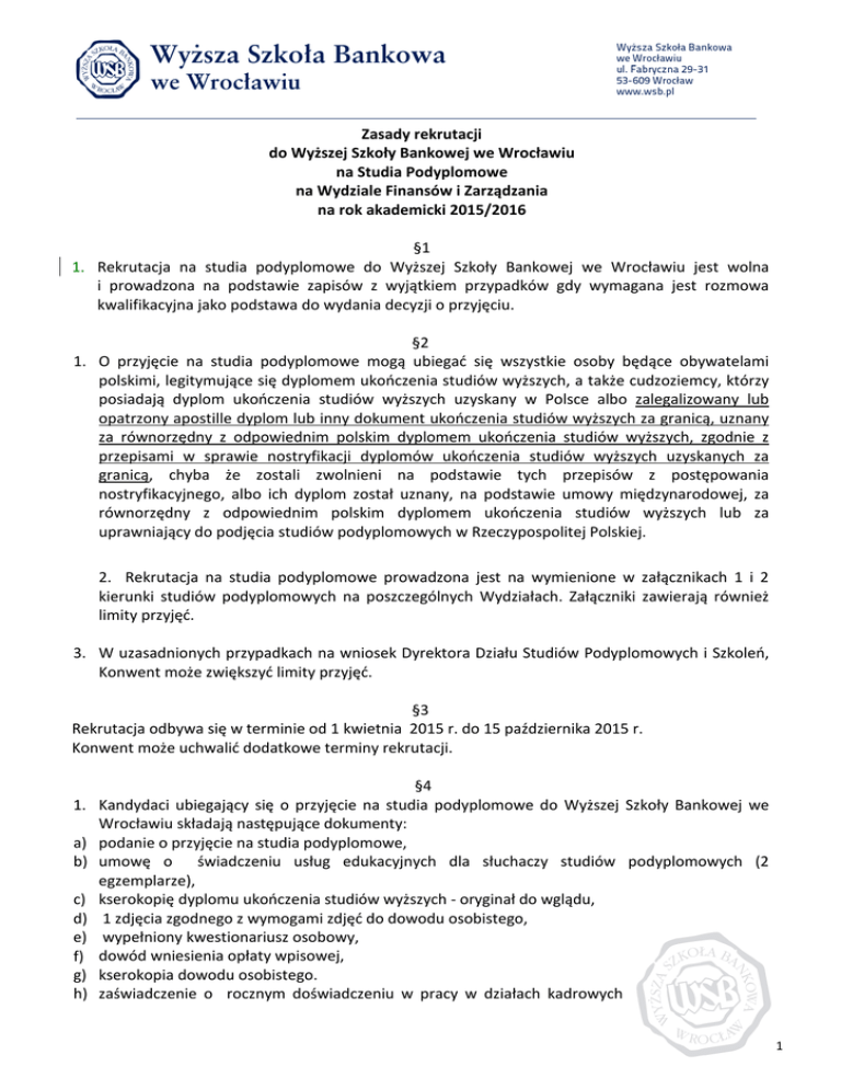 Zasady rekrutacji do Wyższej Szkoły Bankowej we Wrocławiu na Studia Podyplomowe na Wydziale Finansów i Zarządzania na rok akademicki 2015/2016 §1 1. Rekrutacja na studia podyplomowe do Wyższej Szkoły Bankowej we Wrocławiu jest wolna i prowadzona na podstawie zapisów z wyjątkiem przypadków gdy wymagana jest rozmowa kwalifikacyjna jako podstawa do wydania decyzji o przyjęciu. §2 1. O przyjęcie na studia podyplomowe mogą ubiegać się wszystkie osoby będące obywatelami polskimi, legitymujące się dyplomem ukończenia studiów wyższych, a także cudzoziemcy, którzy posiadają dyplom ukończenia studiów wyższych uzyskany w Polsce albo zalegalizowany lub opatrzony apostille dyplom lub inny dokument ukończenia studiów wyższych za granicą, uznany za równorzędny z odpowiednim polskim dyplomem ukończenia studiów wyższych, zgodnie z przepisami w sprawie nostryfikacji dyplomów ukończenia studiów wyższych uzyskanych za granicą, chyba że zostali zwolnieni na podstawie tych przepisów z postępowania nostryfikacyjnego, albo ich dyplom został uznany, na podstawie umowy międzynarodowej, za równorzędny z odpowiednim polskim dyplomem ukończenia studiów wyższych lub za uprawniający do podjęcia studiów podyplomowych w Rzeczypospolitej Polskiej. 2. Rekrutacja na studia podyplomowe prowadzona jest na wymienione w załącznikach 1 i 2 kierunki studiów podyplomowych na poszczególnych Wydziałach. Załączniki zawierają również limity przyjęć. 3. W uzasadnionych przypadkach na wniosek Dyrektora Działu Studiów Podyplomowych i Szkoleń, Konwent może zwiększyć limity przyjęć. §3 Rekrutacja odbywa się w terminie od 1 kwietnia 2015 r. do 15 października 2015 r. Konwent może uchwalić dodatkowe terminy rekrutacji. 1. a) b) c) d) e) f) g) h) §4 Kandydaci ubiegający się o przyjęcie na studia podyplomowe do Wyższej Szkoły Bankowej we Wrocławiu składają następujące dokumenty: podanie o przyjęcie na studia podyplomowe, umowę o świadczeniu usług edukacyjnych dla słuchaczy studiów podyplomowych (2 egzemplarze), kserokopię dyplomu ukończenia studiów wyższych - oryginał do wglądu, 1 zdjęcia zgodnego z wymogami zdjęć do dowodu osobistego, wypełniony kwestionariusz osobowy, dowód wniesienia opłaty wpisowej, kserokopia dowodu osobistego. zaświadczenie o rocznym doświadczeniu w pracy w działach kadrowych 1 (HR dla Profesjonalistów) i) oświadczenie potwierdzające 3-letnie doświadczenie na stanowisku menedżerskim (Akademia Rozwoju Osobistego) j) Oświadczenie potwierdzające 2-letnie doświadczenie trenerskie , znajomość języka angielskiego na poziomie B1 (Business Training for Professionals). Rozmowy kwalifikacyjne w języku angielskim I termin 22 lipca br. godz. 17.00, II termin 24 sierpnia br. godz. 17.00 oraz 22 września br. godz. 17.00 Cudzoziemców obowiązują przepisy wynikające z ustawy Prawo o szkolnictwie wyższym, ustawy o Cudzoziemcach oraz rozporządzeń z nimi związanych. 2. O przyjęciu na studia podyplomowe - zgodnie z § 2 pkt. 4 Regulaminu Studiów Podyplomowych decyduje kolejność zgłoszeń z wyjątkiem przypadków gdy wymagana jest rozmowa kwalifikacyjna. §5 1. Opłata wpisowa jest opłatą za przeprowadzenie czynności o charakterze administracyjnym w trybie postępowania kwalifikacyjnego, któremu poddał się kandydat. Jej wysokość ustala Konwent w drodze odrębnej uchwały. 2. Wysokość czesnego na poszczególnych rodzajach studiów podyplomowych ustala Konwent w drodze odrębnej uchwały. 3. Zasady promocji czesnego ustala Konwent w drodze odrębnej Uchwały. §6 1. W innych szczególnych przypadkach w zakresie rekrutacji (np. o ewentualnych przesunięciach wolnych miejsc między poszczególnymi kierunkami) decyzję podejmuje Dziekan lub Dyrektor Działu Studiów Podyplomowych na podstawie pełnomocnictwa Dziekana. §7 Zasady rekrutacji nie dotyczą rekrutacji na studia finansowane lub współfinansowane z Europejskiego Funduszu Społecznego. 2 Załącznik 1 STUDIA PODYPLOMOWE prowadzone na Wydziale Finansów i Zarządzania Wyższej Szkoły Bankowej we Wrocławiu Lp. 1. 2. 3. 4. 5. 6. 7. 8. 9. 10. 11. 12. 13. 14. 15. 16. 17. 18. 19. 20. 21. 22. 23. 24. 25. 26. 27. 28. 29. 30. 31. 32. 33. Kierunek Audyt Controlling Rachunkowość zarządcza Analityk Finansowy Bankowość Doradca Private Banking BHP HR dla Profesjonalistów Kolejowe Procesy Logistyczne Organizacja i Bezpieczeństwo Przewozu Osób w Transporcie Drogowym Manufacturing SCM Logistyka Eventów Logistyka w Biznesie Transport i Spedycja Nowoczesny Marketing Product Management Nowoczesne zarządzanie marką - skuteczny branding Psychologia w Biznesie Six Sigma, Optymalizacja Procesów Studia Menedżerskie Trener Biznesu Windykacja i Zarządzanie Wierzytelnościami Wycena Nieruchomości Zakupy w Biznesie Kupiec strategiczny w sieci handlowe Zamówienia Publiczne Zarządzanie Jakością Zarządzanie Projektem Zarządzanie Sprzedażą Zarządzanie Zasobami Ludzkimi Doradca Podatkowy Administracja – Zarządzanie i Organizacja Zintegrowany System Informatyczny SAP ERP Iimit przyjęć 30 30 30 35 30 30 40 25 30 30 30 30 35 30 30 30 30 40 35 35 30 40 44 35 35 40 35 35 35 35 30 35 35 3 34. 35. 36. 37. 38. 39. 40. 41. 42. 43. 44. 45. 46. 47. 48. 49. 50. 51. 52. 53. 54. 55. 56. 57. 58. 59. 60. 61. 62. Lean Manufacturing Zarządzanie Projektem Informatycznym Księgowość i Płace w Małej Firmie Rachunkowość Budżetowa Rachunkowość Korporacyjna Kadry i Płace Podyplomowe Studia Pedagogiczne (nadające kwalifikacje do pracy pedagogicznej) Edukacja Montessori w przedszkolu i szkole Master of Management In Education Zarządzanie Wymaganiami i Analiza Biznesowa Technologie Internetowe i Mobilne Cloud Computing i Wirtualizacja Zarządzanie Nieruchomościami Pośrednictwo w Obrocie Nieruchomościami Zarządzanie w Podmiotach Leczniczych Coaching w Biznesie Akademia Rozwoju Osobistego Business Training for Professionals Multimedia i fotografia w rek