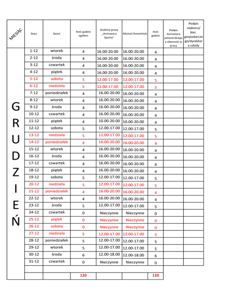 C IE SIĄ Dzień Ilość godzin ogółem 1-12 wtorek 4 16.00-20.00 16.00-20.00 4 2-12 środa 4 16.00-20.00 16.00-20.00 4 3-12 czwartek 4 16.00-20.00 16.00-20.00 4 4-12 piątek 4 16.00-20.00 16.00-20.00 4 5-12 sobota 5 12.00-17.00 12.00-17.00 5 6-12 niedziela 5 12.00-17.00 12.00-17.00 5 7-12 poniedziałek 4 16.00-20.00 16.00-20.00 4 8-12 wtorek 4 16.00-20.00 16.00-20.00 4 9-12 środa 4 16.00-20.00 16.00-20.00 4 10-12 czwartek 4 16.00-20.00 16.00-20.00 4 11-12 piątek 4 10.00-20.00 10.00-20.00 4 12-12 sobota 5 12.00-17.00 12.00-17.00 5 13-12 niedziela 5 12.00-17.00 12.00-17.00 5 14-12 poniedziałek 4 16.00-20.00 16.00-20.00 4 15-12 wtorek 4 16.00-20.00 16.00-20.00 4 16-12 środa 4 16.00-20.00 16.00-20.00 4 17-12 czwartek 4 16.00-20.00 16.00-20.00 4 18-12 piątek 4 16.00-20.00 16.00-20.00 4 19-12 sobota 5 12.00-17.00 12.00-17.00 5 20-12 niedziela 5 12.00-17.00 12.00-17.00 5 21-12 poniedziałek 4 16.00-20.00 16.00-20.00 4 22-12 wtorek 4 16.00-20.00 16.00-20.00 4 23-12 środa 5 12.00-17.00 12.00-17.00 5 24-12 czwartek 0 Nieczynne Nieczynne 0 25-12 piątek 0 Nieczynne Nieczynne 0 26-12 sobota 0 Nieczynne Nieczynne 0 27-12 niedziela 5 12.00-17.00 12.00-17.00 5 28-12 poniedziałek 5 12.00-17.00 12.00-17.00 5 29-12 wtorek 5 12.00-17.00 12.00-17.00 5 30-12 środa 6 12.00-18.00 12.00-18.00 6 31-12 czwartek 0 M G R U D Z I E Ń Godziny pracy ,,Animatora Sportu” Data 120 Nieczynne Michał Chmieliński Nieczynne Ilość godzin 0 120 Podpis nadzoru/ Podpis kier. Animatora gospodarcze potwierdzając y obecność w go/dyrektor pracy a szkoły iąc s ie Godziny pracy ,,Animatora Sportu” Data Dzień 1-01 piątek 2-01 sobota 3-01 niedziela 4-01 poniedziałek 4 16.00-20.00 16.00-20.00 4 5-01 wtorek 4 16.00-20.00 16.00-20.00 4 6-01 środa 4 16.00-20.00 16.00-20.00 4 7-01 czwartek 4 16.00-20.00 16.00-20.00 4 8-01 piątek 4 16.00-20.00 16.00-20.00 4 9-01 sobota 5 12.00-17.00 12.00-17.00 5 10-01 niedziela 5 12.00-17.00 12.00-17.00 5 11-01 poniedziałek 4 16.00-20.00 16.00-20.00 4 12-01 wtorek 4 16.00-20.00 16.00-20.00 4 13-01 środa 4 16.00-20.00 16.00-20.00 4 14-01 czwartek 4 16.00-20.00 16.00-20.00 4 15-01 piątek 4 16.00-20.00 16.00-20.00 4 16-01 sobota 5 12.00-17.00 12.00-17.00 5 17-01 niedziela 5 12.00-17.00 12.00-17.00 5 18-01 poniedziałek 4 16.00-20.00 16.00-20.00 4 19-01 wtorek 4 16.00-20.00 16.00-20.00 4 20-01 środa 4 16.00-20.00 16.00-20.00 4 21-01 czwartek 4 16.00-20.00 16.00-20.00 4 22-01 piątek 4 16.00-20.00 16.00-20.00 4 23-01 sobota 5 12.00-17.00 12.00-17.00 5 24-01 niedziela 5 12.00-17.00 12.00-17.00 5 25-01 poniedziałek 8 12.00-20.00 12.00-20.00 8 26-01 wtorek 8 12.00-20.00 12.00-20.00 8 27-01 środa 8 12.00-20.00 12.00-20.00 8 28-01 czwartek 8 12.00-20.00 12.00-20.00 8 29-01 piątek 8 12.00-20.00 12.00-20.00 8 30-01 sobota 5 12.00-17.00 12.00-17.00 5 31-01 niedziela 5 12.00-17.00 12.00-17.00 5 M S T Y C Z E Ń ilość godzin ogółem 140 Podpis nadzoru/ kier. gospodar Michał Chmieliński Ilość godzin Podpis Animatora czego/dyr ektora potwierdzający obecność w pracy szkoły ZAMKNIĘTE 140 140