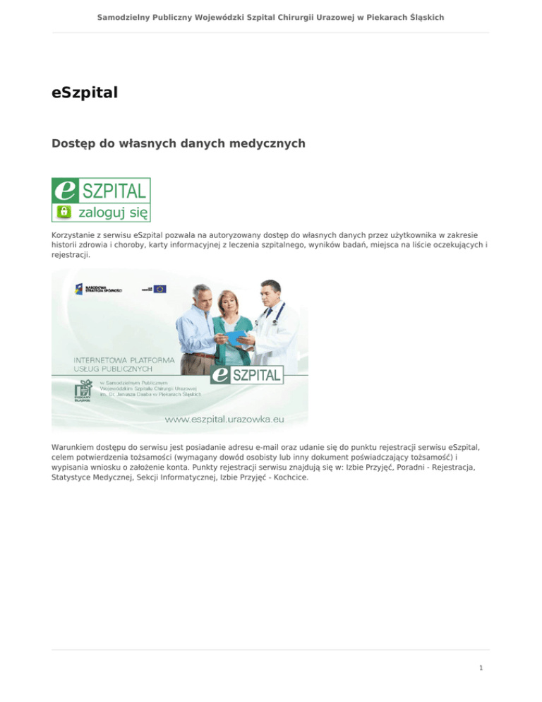 Samodzielny Publiczny Wojewódzki Szpital Chirurgii Urazowej w Piekarach Śląskich eSzpital Dostęp do własnych danych medycznych Korzystanie z serwisu eSzpital pozwala na autoryzowany dostęp do własnych danych przez użytkownika w zakresie historii zdrowia i choroby, karty informacyjnej z leczenia szpitalnego, wyników badań, miejsca na liście oczekujących i rejestracji. Warunkiem dostępu do serwisu jest posiadanie adresu e-mail oraz udanie się do punktu rejestracji serwisu eSzpital, celem potwierdzenia tożsamości (wymagany dowód osobisty lub inny dokument poświadczający tożsamość) i wypisania wniosku o założenie konta. Punkty rejestracji serwisu znajdują się w: Izbie Przyjęć, Poradni - Rejestracja, Statystyce Medycznej, Sekcji Informatycznej, Izbie Przyjęć - Kochcice. 1 Samodzielny Publiczny Wojewódzki Szpital Chirurgii Urazowej w Piekarach Śląskich W celu zalogowania do systemu konieczne jest podanie nazwy użytkownika oraz hasła dostępu. Nazwę użytkownika stanowi nr kartoteki pacjenta, która jest zamieszczona na certyfikacie dostępu do serwisu. Tymczasowe hasło wysyłane jest na adres e-mail podany przez użytkownika. Podczas pierwszego logowania wymagana jest zmiana hasła. Uzyskane z serwisu eSzpital dokumenty mają charakter wyłącznie poglądowy i nie mogą być traktowane jako oficjalny dokument. Nie mogą być również podstawą jakichkolwiek czynności administracyjnych czy urzędowych. Na dostęp do systemu pozwala korzystanie z: ● ● ● ● komputera (Windows - wersja XP lub nowszy, Linuks, Mac OS), kiosku internetowego (publicznego lub dedykowanego do systemu eSzpital z wbudowanym czytnikiem kodu kreskowego, co upraszcza logowanie pacjenta korzystającego ze szpitalnej opaski identyfikacyjnej, tabletu (system android lub system IOS (iPad)), telefonu (system android, system IOS (iPhone)) Strona startowa serwisu eSzpital: Folder informacyjny eSzpital: pobierz Regulamin serwisu: pobierz Wniosek o założenie konta w serwisie: pobierz Wniosek o założenie konta w serwisie (dla pacjentów do 18 roku życia): pobierz Projekt eSzpital jest współfinansowany przez Unię Europejską z Europejskiego Funduszu Rozwoju Regionalnego w ramach Regionalnego Programu Operacyjnego Województwa Śląskiego na lata 2007-2013. www. .urazowka.eu 2