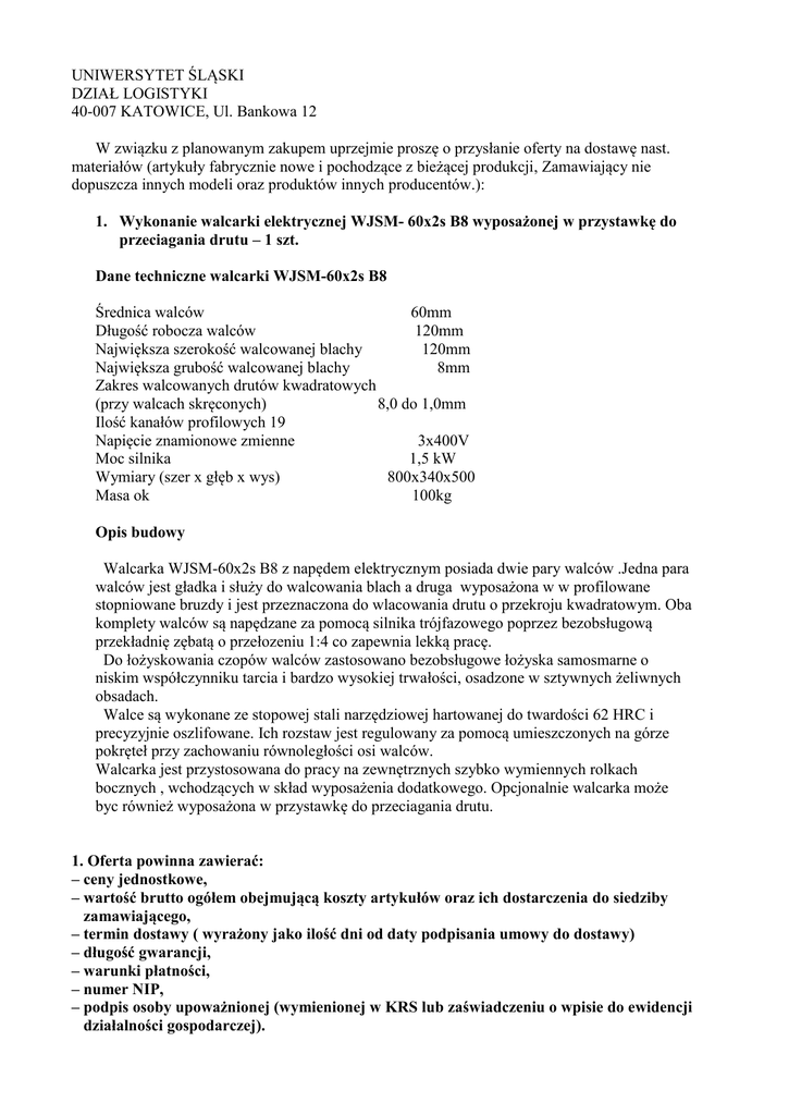 UNIWERSYTET ŚLĄSKI DZIAŁ LOGISTYKI 40-007 KATOWICE, Ul. Bankowa 12 W związku z planowanym zakupem uprzejmie proszę o przysłanie oferty na dostawę nast. materiałów (artykuły fabrycznie nowe i pochodzące z bieżącej produkcji, Zamawiający nie dopuszcza innych modeli oraz produktów innych producentów.): 1. Wykonanie walcarki elektrycznej WJSM- 60x2s B8 wyposażonej w przystawkę do przeciagania drutu – 1 szt. Dane techniczne walcarki WJSM-60x2s B8 Średnica walców 60mm Długość robocza walców 120mm Największa szerokość walcowanej blachy 120mm Największa grubość walcowanej blachy 8mm Zakres walcowanych drutów kwadratowych (przy walcach skręconych) 8,0 do 1,0mm Ilość kanałów profilowych 19 Napięcie znamionowe zmienne 3x400V Moc silnika 1,5 kW Wymiary (szer x głęb x wys) 800x340x500 Masa ok 100kg Opis budowy Walcarka WJSM-60x2s B8 z napędem elektrycznym posiada dwie pary walców .Jedna para walców jest gładka i służy do walcowania blach a druga wyposażona w w profilowane stopniowane bruzdy i jest przeznaczona do wlacowania drutu o przekroju kwadratowym. Oba komplety walców są napędzane za pomocą silnika trójfazowego poprzez bezobsługową przekładnię zębatą o przełozeniu 1:4 co zapewnia lekką pracę. Do łożyskowania czopów walców zastosowano bezobsługowe łożyska samosmarne o niskim współczynniku tarcia i bardzo wysokiej trwałości, osadzone w sztywnych żeliwnych obsadach. Walce są wykonane ze stopowej stali narzędziowej hartowanej do twardości 62 HRC i precyzyjnie oszlifowane. Ich rozstaw jest regulowany za pomocą umieszczonych na górze pokręteł przy zachowaniu równoległości osi walców. Walcarka jest przystosowana do pracy na zewnętrznych szybko wymiennych rolkach bocznych , wchodzących w skład wyposażenia dodatkowego. Opcjonalnie walcarka może byc również wyposażona w przystawkę do przeciagania drutu. 1. Oferta powinna zawierać: – ceny jednostkowe, – wartość brutto ogółem obejmującą koszty artykułów oraz ich dostarczenia do siedziby zamawiającego, – termin dostawy ( wyrażony jako ilość dni od daty podpisania umowy do dostawy) – długość gwarancji, – warunki płatności, – numer NIP, – podpis osoby upoważnionej (wymienionej w KRS lub zaświadczeniu o wpisie do ewidencji działalności gospodarczej). Uwaga: Warunkiem akceptacji oferty jest zaoferowanie płatności przelewem po realizacji dostawy, w terminie minimum 14 dni. W przypadu otrzymania od Państwa oferty z najniższą ceną, do stworzenia z Państwem ewentualnej umowy na dostawę w/w materiałów niezbędne będą dokumenty: 2. Aktualny odpis z KRS albo zaświadczenie o wpisie do ewidencji działalności gospodarczej zawierające w szczególności przedmiot działalności oraz sposób reprezentacji firmy. W wypadku odpisu dokumentu wymienionego w pkt. 2. datowanego wcześniej niż 6 miesięcy przed podpisaniem umowy osoba upoważniona winna zaświadczyć aktualność danych zawartych w odpisie na dzień poświadczenia. Ofertę wraz z dokumentami należy przesłać mailem do dnia 15.04.2011 r. do godziny 14.00 na adres mailowy osoby odpowiedzialnej: [email protected] dot. wniosku 25508 z poważaniem Leszek walczak
