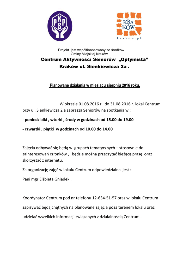 Projekt jest współfinansowany ze środków Gminy Miejskiej Kraków Centrum Aktywności Seniorów „Optymista” Kraków ul. Sienkiewicza 2a . Planowane działania w miesiącu sierpniu 2016 roku. W okresie 01.08.2016 r . do 31.08.2016 r. lokal Centrum przy ul. Sienkiewicza 2 a zaprasza Seniorów na spotkania w : - poniedziałki , wtorki , środy w godzinach od 15.00 do 19.00 - czwartki , piątki w godzinach od 10.00 do 14.00 Zajęcia odbywać się będą w grupach tematycznych – stosownie do zainteresowań członków , będzie można przeczytać bieżącą prasę oraz skorzystać z internetu. Za organizację zajęć w lokalu Centrum odpowiedzialna jest : Pani mgr Elżbieta Gniadek . Koordynator Centrum pod nr telefonu 12-634-51-57 oraz w lokalu Centrum zapisywać będą chętnych na planowane zajęcia poza terenem lokalu oraz udzielać wszelkich informacji związanych z działalnością Centrum . Harmonogram zajęć na sierpień 2016 w Centrum Aktywności Seniora „Optymista” Data Dzień Godz. 1 VIII Poniedziałek 15 - 16 J. francuski, konwersacje prowadzi członek Klubu 16 - 19 Spotkanie integracyjne przy kawie, dyskusje 15 - 19 Wyjście do Kina Mikro 2016 2 VIII Wtorek 2016 3 VIII Dyskusja w Klubie o filmie Środa 2016 4 VIII Czwartek 15 - 16 J. francuski, konwersacje prowadzi członek Klubu 16 - 19 Prezentacje przez seniorów własnych pasji 10 - 14 Gry stolikowe, planszowe. 2016 5 VIII Rodzaj zajęć Dyskusje przy kawie Piątek 10 - 14 Wycieczka rowerowa Poniedziałek 15 - 16 J. francuski, konwersacje prowadzi członek Klubu 16 - 19 Spotkanie integracyjne przy kawie, dyskusje 15 - 17 Spotkanie klubowe 17 - 19 Spacer z kijkami 15 - 16 J. francuski, konwersacje prowadzi członek Klubu 16 - 19 Prezentacje przez seniorów własnych pasji i zainteresowań 10 - 14 Gry stolikowe planszowe. 2016 8 VIII 2016 9 VIII Wtorek 2016 10 VIII Środa 2016 11 VIII Czwartek 2016 12 VIII Dyskusje przy kawie Piątek 10 - 14 Warsztaty żywieniowe Wtorek 15 - 19 Wyjście do Kina Mikro 2016 16 VIII 2016 17 VIII 2016 Dyskusja w Klubie o filmie Środa 15 - 16 J. francuski, konwersacje prowadzi członek Klubu 16 - 19 Spotkanie integracyjne przy kawie, dyskusje 18 VIII Czwartek 10 - 14 2016 19 VIII Gry stolikowe, planszowe. Dyskusje przy kawie Piątek 10 - 14 Warsztaty rękodzielnicze Poniedziałek 15 - 16 J. francuski, konwersacje prowadzi członek Klubu 16 - 19 Spotkanie integracyjne przy kawie, dyskusje Wtorek 15 - 19 Wyjście na bieżące wystawy i wernisaże Środa 15 - 16 J. francuski, konwersacje prowadzi członek Klubu 16 - 19 Prezentacje przez seniorów własnych pasji i zainteresowań 10 - 14 Gry stolikowe, planszowe. 2016 22 VIII 2017 23 VIII 2016 24 VIII 2016 25 VIII Czwartek 2016 26 VIII Dyskusje przy kawie Piątek 10 - 14 Warsztaty żywieniowe Poniedziałek 15 - 16 J. francuski, konwersacje prowadzi członek Klubu 16 - 19 Spotkanie integracyjne przy kawie, dyskusje Wtorek 15 - 19 Wyjście na bieżące wystawy i wernisaże Środa 15 - 16 J. francuski, konwersacje prowadzi członek Klubu 16 - 19 Prezentacje przez seniorów własnych pasji i zainteresowań 2016 29 VIII 2016 30 VIII 2016 31 VIII 2016 Uwaga: W Klubie przy ul. Sienkiewicza 2a prowadzone są zapisy na basen i gimnastykę (zajęcia od września br.