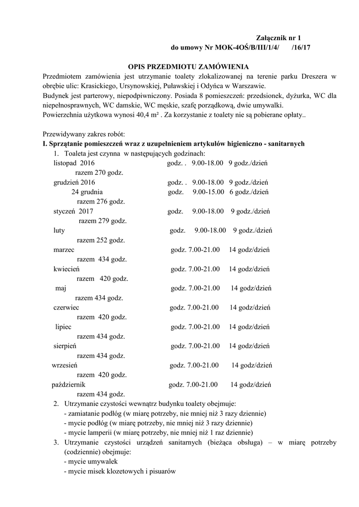 Załącznik nr 1 /16/17 do umowy Nr MOK-4OŚ/B/III/1/4/ OPIS PRZEDMIOTU ZAMÓWIENIA Przedmiotem zamówienia jest utrzymanie toalety zlokalizowanej na terenie parku Dreszera w obrębie ulic: Krasickiego, Ursynowskiej, Puławskiej i Odyńca w Warszawie. Budynek jest parterowy, niepodpiwniczony. Posiada 8 pomieszczeń: przedsionek, dyżurka, WC dla niepełnosprawnych, WC damskie, WC męskie, szafę porządkową, dwie umywalki. Powierzchnia użytkowa wynosi 40,4 m² . Za korzystanie z toalety nie są pobierane opłaty.. Przewidywany zakres robót: I. Sprzątanie pomieszczeń wraz z uzupełnieniem artykułów higieniczno - sanitarnych 1. Toaleta jest czynna w następujących godzinach: listopad 2016 godz. . 9.00-18.00 9 godz./dzień razem 270 godz. grudzień 2016 godz. . 9.00-18.00 9 godz./dzień 24 grudnia godz. 9.00-15.00 6 godz./dzień razem 276 godz. styczeń 2017 godz. 9.00-18.00 9 godz./dzień razem 279 godz. luty godz. 9.00-18.00 9 godz./dzień razem 252 godz. marzec godz. 7.00-21.00 14 godz/dzień razem 434 godz. godz. 7.00-21.00 14 godz/dzień kwiecień razem 420 godz. maj godz. 7.00-21.00 14 godz/dzień razem 434 godz. czerwiec godz. 7.00-21.00 14 godz/dzień razem 420 godz. lipiec godz. 7.00-21.00 14 godz/dzień razem 434 godz. sierpień godz. 7.00-21.00 14 godz/dzień razem 434 godz. wrzesień godz. 7.00-21.00 14 godz/dzień razem 420 godz. październik godz. 7.00-21.00 14 godz/dzień razem 434 godz. 2. Utrzymanie czystości wewnątrz budynku toalety obejmuje: - zamiatanie podłóg (w miarę potrzeby, nie mniej niż 3 razy dziennie) - mycie podłóg (w miarę potrzeby, nie mniej niż 3 razy dziennie) - mycie lamperii (w miarę potrzeby, nie mniej niż 1 raz dziennie) 3. Utrzymanie czystości urządzeń sanitarnych (bieżąca obsługa) – w miarę potrzeby (codziennie) obejmuje: - mycie umywalek - mycie misek klozetowych i pisuarów - mycie pojemników na mydło i papier toaletowy - mycie baterii umywalkowych 4. Wyposażenie obiektu w środki czystości (bieżąca obsługa) – codziennie obejmuje: - wyłożenie i uzupełnianie papieru toaletowego - wlanie i uzupełnianie mydła w płynie do pojemników - włożenie i uzupełnianie wkładów zapachowych - wyłożenie i uzupełnianie ręczników papierowych 5.Zbieranie i pozbywanie się powstałych na terenie obiektu odpadów w sposób zgodny z przepisami Ustawy z dnia 13 września1996r o utrzymaniu czystości i porządku w gminach (Dz. U. 2013 poz.1399 z późn. zm.) oraz uchwały Nr XLIX/1366/2013 Rady m. st. Warszawy z dnia 17 stycznia 2013r. w sprawie uchwalenia Regulaminu utrzymania czystości i porządku na terenie Miasta Stołecznego Warszawy(Mazow.2013.1497) 6.Wymianę wycieraczek przy drzwiach wejściowych oraz dbałość o ich stan 7.Okresowe mycie szyb w drzwiach wejściowych i okien w budynku (w miarę potrzeby, nie mniej niż 2 razy w miesiącu) 8.Bieżąca kontrola czystości kabiny po wyjściu osoby korzystającej z niej – codziennie 9.Utrzymanie właściwego stanu technicznego toalety (usuwanie usterek technicznych np. zapchane sanitariaty, wymiana żarówek, wymiana uszczelek, naprawa zamków w drzwiach). 10.Udostępnienie pomieszczenia dyżurki dla potrzeb socjalnych pracownikowi ochrony. II. Sprzątanie terenu przed budynkiem 1. Utrzymanie porządku wokół budynku szaletu obejmuje: - zamiatanie chodnika przed wejściem - odśnieżanie chodnika i usuwanie oblodzenia – codziennie w razie wystąpienia III. Wykonawca we własnym zakresie zapewni niezbędne środki czystości i sprzęt do realizacji zadania, wymianę wycieraczek oraz obsługę do zapewnienia ciągłego funkcjonowania toalety wraz z ustawowymi dniami wolnymi od pracy. IV. Wykonawca jest zobowiązany do zgłaszania do Wydziału Ochrony Środowiska zaobserwowanych awarii – codziennie w razie zaistnienia uszkodzeń, kradzieży. V. Wymagane środki czystości: szczotki do zamiatania i mycia podłóg, ścierki, pasty oraz proszki do mycia, wkłady zapachowe, mydła w płynie, ręczniki papierowe. VI. zapewnienie pracownikom estetycznej odzieży umożliwiającej ich łatwą identyfikację np. logo firmy VII. pracownik powinien posiadać identyfikator w widocznym miejscu.
