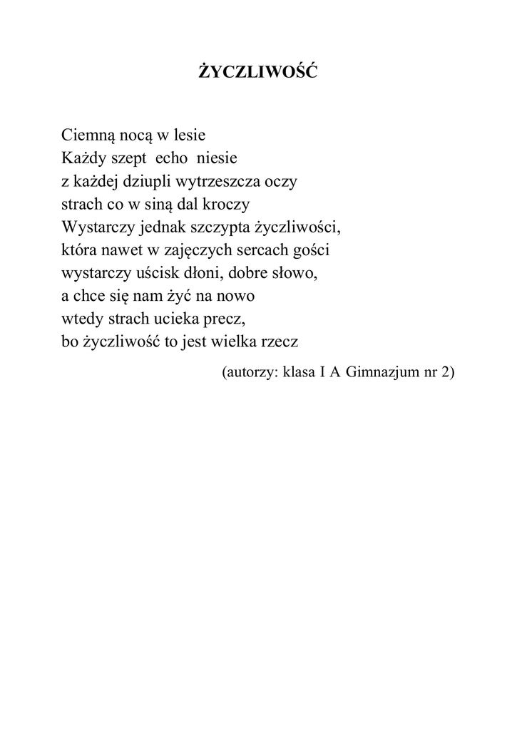 ŻYCZLIWOŚĆ Ciemną nocą w lesie Każdy szept echo niesie z każdej dziupli wytrzeszcza oczy strach co w siną dal kroczy Wystarczy jednak szczypta życzliwości, która nawet w zajęczych sercach gości wystarczy uścisk dłoni, dobre słowo, a chce się nam żyć na nowo wtedy strach ucieka precz, bo życzliwość to jest wielka rzecz (autorzy: klasa I A Gimnazjum nr 2)