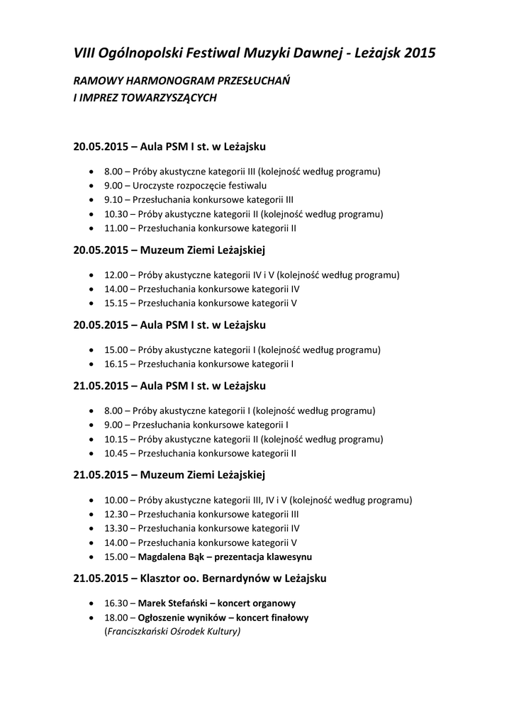 VIII Ogólnopolski Festiwal Muzyki Dawnej - Leżajsk 2015 RAMOWY HARMONOGRAM PRZESŁUCHAŃ I IMPREZ TOWARZYSZĄCYCH 20.05.2015 – Aula PSM I st. w Leżajsku 8.00 – Próby akustyczne kategorii III (kolejność według programu) 9.00 – Uroczyste rozpoczęcie festiwalu 9.10 – Przesłuchania konkursowe kategorii III 10.30 – Próby akustyczne kategorii II (kolejność według programu) 11.00 – Przesłuchania konkursowe kategorii II 20.05.2015 – Muzeum Ziemi Leżajskiej 12.00 – Próby akustyczne kategorii IV i V (kolejność według programu) 14.00 – Przesłuchania konkursowe kategorii IV 15.15 – Przesłuchania konkursowe kategorii V 20.05.2015 – Aula PSM I st. w Leżajsku 15.00 – Próby akustyczne kategorii I (kolejność według programu) 16.15 – Przesłuchania konkursowe kategorii I 21.05.2015 – Aula PSM I st. w Leżajsku 8.00 – Próby akustyczne kategorii I (kolejność według programu) 9.00 – Przesłuchania konkursowe kategorii I 10.15 – Próby akustyczne kategorii II (kolejność według programu) 10.45 – Przesłuchania konkursowe kategorii II 21.05.2015 – Muzeum Ziemi Leżajskiej 10.00 – Próby akustyczne kategorii III, IV i V (kolejność według programu) 12.30 – Przesłuchania konkursowe kategorii III 13.30 – Przesłuchania konkursowe kategorii IV 14.00 – Przesłuchania konkursowe kategorii V 15.00 – Magdalena Bąk – prezentacja klawesynu 21.05.2015 – Klasztor oo. Bernardynów w Leżajsku 16.30 – Marek Stefański – koncert organowy 18.00 – Ogłoszenie wyników – koncert finałowy (Franciszkański Ośrodek Kultury) PROGRAM PRZESŁUCHAŃ KONKURSOWYCH 20.05.2015 Kategoria III Aula PSM I st. w Leżajsku, godz. 9.10 1. Michał Zawisza - skrzypce kl. 1 /II st. - ZSM w Krośnie Nauczyciel: Dorota Pelczar Akompaniator: Dorota Skibicka Program: P. Locatelli - Largo P. Locatelli - Allemanda 2. Łucja Boroń - flet kl. 1 /II st. - SM II st. PRO MUSICA w Krośnie Nauczyciel: Bożena Sierpińska Akompaniator: Maciej Janas Program: A. Vivaldi - Koncert F-dur cz. II i III W. A. Mozart - Sonatina G-dur 3. Małgorzata Kruczek - fortepian kl. 4 /II st. - ZSM nr 1 w Rzeszowie Nauczyciel: Urszula Buda Program: J. S. Bach - Preludium z III Suity angielskiej g-moll W. A. Mozart - Sonata C-dur KV 330 Allegro Sonatowe 4. Norbert Prucnal - obój kl. 3 /II st. - ZSM nr 2 w Rzeszowie Nauczyciel: Łukasz Choiński Akompaniator: Aneta Czach Program: T. Albinoni - Koncert d moll, op. 9, nr 2 cz. I Allegro T. Albinoni - Koncert d moll, op. 9, nr 2 cz. 2 Adagio 5. Milena Ostrowska - fortepian kl. 2 /II st. - ZSM nr 2 w Rzeszowie Nauczyciel: Aneta Czach Program: J. S. Bach - Koncert d moll BWV 974 6. Anna Cieślicka - skrzypce kl. 1 /II st. - ZSM w Krośnie Nauczyciel: Dorota Pelczar Akompaniator: Anna Materniak Program: F. M. Veracini - Sonata koncertowa e-moll cz. I F. M. Veracini - Sonata koncertowa e-moll cz. II 7. Gabriela Smyka - skrzypce kl. 1 /II st. - ZSM w Krośnie Nauczyciel: Dorota Pelczar Akompaniator: Anna Materniak Program: A. Vivaldi - Sonata D-dur cz. I A. Vivaldi - Sonata D-dur cz. II 8. Zofia Trybus - skrzypce kl. 1 /II st. - ZSM w Krośnie Nauczyciel: Dorota Pelczar Akompaniator: Dorota Skibicka Program: W. A. Mozart - Sonata G-dur na fortepian i skrzypce cz. I W. A. Mozart - Sonata G-dur na fortepian i skrzypce cz. II Kategoria II Aula PSM I st. w Leżajsku, godz. 11.00 9. Kacper Głąb - gitara kl. 3/4 - NSM I st. w Pruchniku Nauczyciel: Krzysztof Skoczyński Program: Gaspar Sanz - Canarios Luigi Legnani - Sherzo mit Variationen op. 10 10. Siwiec Katarzyna - flet kl. 3/4 - PSM I st. w Leżajsku Nauczyciel: Małgorzata Dzień Akompaniator: Aleksander Koziński Program: J. S. Bach - Menuet z Suity h-moll J. S. Bach - Badineria z Suity h-moll 11. Patrycja Leniart - skrzypce kl. 6/6 - PSM I st. w Leżajsku Nauczyciel: Danuta Wołoszyn Akompaniator: Grzegorz Wójcikiewicz Program: J. F. Haendel - Sonata g-moll op. 1 nr 10 cz. I J. F. Haendel - Sonata g-moll op. 1 nr 10 cz. II 12. Aleksandra Kostek - skrzypce kl. 5/6 - PSM I st. w Leżajsku Nauczyciel: Danuta Wołoszyn Akompaniator: Grzegorz Wójcikiewicz Program: A. Corelli - Sonata g-moll op. 5 nr 5 cz. I A. Corelli - Sonata g-moll op. 5 nr 5 cz. II 13. Sylwia Sulikowska - skrzypce kl. 6/6 - PSM I st. w Leżajsku Nauczyciel: Danuta Wołoszyn Akompaniator: Grzegorz Wójcikiewicz Program: A. Vivaldi - Sonata D-dur cz. III A. Vivaldi - Sonata D-dur cz. IV 14. Szymon Lizak - saksofon kl. 5/6 - PSM I st. w Leżajsku Nauczyciel: Wiesław Wojtas Akompaniator: Jakub Międlar Program: J. S. Bach - Sonata nr 4 15. Sylwia Barcikowska - skrzypce kl. 4/4 - PSM I st. w Łańcucie Nauczyciel: Regina Szlachta Akompaniator: Jolanta Filar-Choińska Program: G. Ph. Telemann - Largo z 10 Fantazji W. A. Mozart - Koncert D-dur ,,Adelaide" cz.I 16. Rozalia Bytnar - flet kl. 3/4 - PSM I st. w Łańcucie Nauczyciel: Alina Szpunar Akompaniator: Monika Welc Program: B. Marcello - Sonata II op. 2 nr 2 17. Barbara Żelazko - flet kl. 4/4 - ZSM nr 2 w Rzeszowie Nauczyciel: Tomasz Bielecki Akompaniator: Agnieszka Jarosz Program: F. M. Veracini - Sonata Decima cz. I A. Vivaldi - Koncert G-dur op. 10 nr 4 cz. III 18. Weronika Połowniak - flet kl. 6/6 - ZSM nr 2 w Rzeszowie Nauczyciel: Paulina Warchoł Akompaniator: Agnieszka Hałdys Program: A. Vivaldi - Koncert a-moll RV 440 cz. II. Larghetto sempre pianissimo A. Vivaldi - Koncert a-moll RV 440 cz. III. Allegro 19. Amelia Wojciechowska - skrzypce kl. 6/6 - ZSM w Krośnie Nauczyciel: Katarzyna Sytnik-Jaracz Akompaniator: Anna Skibicka Program: G. F. Haendel - Sonata F-dur op. 1 nr 12 cz. I G. F. Haendel - Sonata F-dur op. 1 nr 12 cz. II 20. Zofia Oliwa - skrzypce kl. 6/6 - PSM I st. w Strzyżowie Nauczyciel: Aleksander Pogorilec Akompaniator: Paweł Węgrzyn Program: G. F. Haendel - Sonata F-dur cz. I G. F. Haendel - Sonata F-dur cz. II 21. Natalia Zielińska - skrzypce kl. 5/6 - PSM I st. w Strzyżowie Nauczyciel: Aleksander Pogorilec Akompaniator: Paweł Węgrzyn Progr