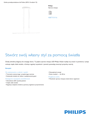 Ulotka przedsprzedażowa dla Polska (2015, Grudzień 12) Philips Oprawa wisząca • Mile • biała • LED 40877/31/16 Stwórz swój własny styl za pomocą światła Dodaj odrobinę elegancji do swojego domu. Ta piękna oprawa wisząca LED Philips InStyle wydaje się unosić w powietrzu. Lampa emituje ciepłe, białe światło, a funkcje regulacji wysokości i jasności pozwalają stworzyć przytulny nastrój. Korzyści Do zastosowania w salonie i sypialni • Tworzenie wytwornego i przyjemnego nastroju • Doskonałe światło do relaksu i podejmowania gości Ekologiczne rozwiązania oświetleniowe • Oświetlenie LED wysokiej jakości • Ciepłe, białe światło • Regulacja natężenia światła za pomocą regulatora przyciemniania • Oszczędność energii • Duża trwałość — do 20 lat Wyjątkowe cechy • Wysokość oprawy wiszącej można łatwo regulować Cechy Oświetlenie LED wysokiej jakości Możliwość przyciemniania Technologia LED zastosowana w tej lampie firmy Philips to wyjątkowe rozwiązanie opracowane przez firmę Philips. Natychmiast się włącza, pozwala na uzyskanie optymalnej wydajności oświetlenia oraz podkreśla i ożywia kolory w Twoim domu. Produkty oświetleniowe LED firmy Philips są wyposażone w funkcję regulacji natężenia światła za pomocą regulatora przyciemniania (niedołączony do zestawu). Dzięki temu można stworzyć idealną atmosferę na każdą okazję — niezależnie od tego, czy chodzi o romantyczną kolację we dwoje czy o relaks z rodziną i przyjaciółmi w salonie. Firma Philips przetestowała wiele regulatorów przyciemniania, które okazały się zgodne z oświetleniem LED. Lista zgodnych regulatorów przyciemniania jest dostępna w sekcji plików do pobrania i pomocy technicznej. Ciepłe, białe światło Oszczędność energii Ta energooszczędna lampa firmy Philips zużywa mniej energii niż tradycyjne źródła światła, co pozwala zmniejszyć rachunki za prąd i przyczynia się do ochrony środowiska. Duża trwałość Produkt godny zaufania. Trwałość wbudowanych źródeł światła LED wykorzystanych w tej lampie LED firmy Philips wynosi nawet 20 tysięcy godzin (co oznacza 20 lat w przypadku średniego użycia przez 3 godziny dziennie, przy co najmniej 13 000 włączeń i wyłączeń). Już nie musisz się martwić naprawą lub wymianą żarówki, ciesząc się doskonałym, nastrojowym oświetleniem w domu. Światło może mieć różne temperatury barwowe oznaczane za pomocą jednostek zwanych kelwinami (K). Lampy o niskiej wartości kelwinów zapewniają ciepłe, bardziej przytulne światło, natomiast lampy o wysokiej wartości kelwinów dają chłodne, bardziej pobudzające światło. Ta lampa firmy Philips rzuca ciepłe, białe światło, które zapewnia przytulną atmosferę. Tworzenie wytwornego nastroju Ta lampa została stworzona w oparciu o nowoczesne poczucie smaku, trendy i style życia. Doskonale wtapia się w wystrój wnętrza i pozwala stworzyć wymarzony, niepowtarzalny nastrój. Regulacja wysokości Doskonałe światło do relaksu i podejmowania gości Wysokość tej oprawy wiszącej Philips można wyregulować w dowolnym momencie, unosząc lub opuszczając drążek znajdujący się między przewodami. Salon jest sercem każdego domu — to miejsce przeznaczone do rodzinnych spotkań, odpoczynku i podejmowania gości. Oświetlenie w salonie i w sypialni powinno dawać dużą swobodę i możliwość dostosowania do potrzeb użytkowników, dzięki czemu będzie mogło sprostać ich wymaganiom w ciągu całego dnia. Przemyślane rozmieszczenie różnych typów oświetlenia i umiejętna zabawa światłem mogą nie tylko pomóc w stworzeniu wrażenia ciepła i otwartości, ale też sprawić, że pomieszczenie wyda się bardziej przestronne. Specyfikacje Prosimy pamiętać, że jest to ulotka przedsprzedażowa. Treść ulotki jest zgodna z naszą najlepszą wiedzą w momencie publikacji i w odniesieniu do danego kraju (podane powyżej). Treść ulotki może ulec zmianie bez powiadomienia. Firma Philips nie ponosi odpowiedzialności za treść ulotki. Stylistyka i wykończenie Materiał Kolor aluminium biały Dane wkrótce ulegną zmianie 2015, Grudzień 12 Dodatkowe funkcje/akcesoria w zestawie Możliwość przyciemniania Wbudowane diody LED Regulacja wysokości 5 lat gwarancji na moduł LED Oprawa z możliwością przyciemniania LED Współczynnik IP TAK TAK TAK TAK Klasa ochronności Wymiary i waga produktu Minimalna wysokość Maksymalna wysokość Długość Szerokość Waga netto Liczba źródeł światła Moc źródła światła w zestawie Łączna moc strumienia świetlnego oprawy w lumenach Gwarancja 92,8 cm 5,0 cm 0,950 kg Wysokość Długość Szerokość Waga 93,6 cm 9,3 cm 7,8 cm 1,160 kg Różne Opracowano z myślą o Styl Typ 1120 lm Version: 1.0.1 EAN: 8718291505853 2 lata Wymiary i waga opakowania Przedział 220–240 V 50–60 Hz 6 2,5 W Dane wkrótce ulegną zmianie 2015, Grudzień 12 TAK IP20 ochrona przed przedmiotami powyżej 12,5 mm brak ochrony przed wodą II — podwójna izolacja Serwis 9,6 cm 150 cm Dane techniczne Zasilanie sieciowe TAK Salon i sypialnia Nowoczesna Oprawa wisząca © 2015 Koninklijke Philips Electronics N.V. Wszelkie prawa zastrzeżone Dane mogą ulec zmianie bez uprzedniego powiadomienia. Znak towarowy jest własnością Koninklijke Philips Electronics N.V. lub odpowiednich podmiotów . www.philips.com