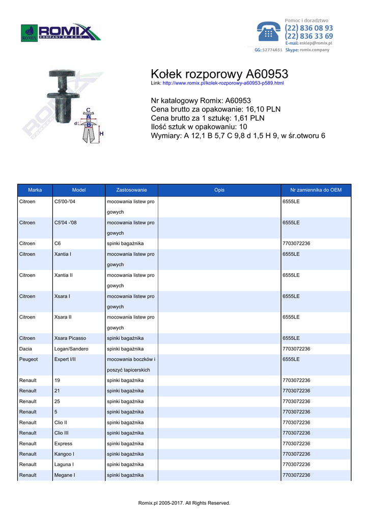 Kołek rozporowy A60953 Link: http://www.romix.pl/kolek-rozporowy-a60953-p589.html Nr katalogowy Romix: A60953 Cena brutto za opakowanie: 16,10 PLN Cena brutto za 1 sztukę: 1,61 PLN Ilość sztuk w opakowaniu: 10 Wymiary: A 12,1 B 5,7 C 9,8 d 1,5 H 9, w śr.otworu 6 Marka Citroen Model C5'00-'04 Zastosowanie Opis mocowania listew pro Nr zamiennika do OEM 6555LE gowych Citroen C5'04 -'08 mocowania listew pro 6555LE gowych Citroen C6 spinki bagażnika 7703072236 Citroen Xantia I mocowania listew pro 6555LE gowych Citroen Xantia II mocowania listew pro 6555LE gowych Citroen Xsara I mocowania listew pro 6555LE gowych Citroen Xsara II mocowania listew pro 6555LE gowych Citroen Xsara Picasso spinki bagażnika 6555LE Dacia Logan/Sandero spinki bagażnika 7703072236 Peugeot Expert I/II mocowania boczków i 6555LE poszyć tapicerskich Renault 19 spinki bagażnika 7703072236 Renault 21 spinki bagażnika 7703072236 Renault 25 spinki bagażnika 7703072236 Renault 5 spinki bagażnika 7703072236 Renault Clio II spinki bagażnika 7703072236 Renault Clio III spinki bagażnika 7703072236 Renault Express spinki bagażnika 7703072236 Renault Kangoo I spinki bagażnika 7703072236 Renault Laguna I spinki bagażnika 7703072236 Renault Megane I spinki bagażnika 7703072236 Romix.pl 2005-2017. All Rights Reserved. Renault Megane II spinki bagażnika 7703072236 Renault Modus spinki bagażnika 7703072236 Renault Scenic II spinki bagażnika 7703072236 Renault Traffic 2 spinki bagażnika 7703072236 Renault Traffic I spinki bagażnika 7703072236 Romix.pl 2005-2017. All Rights Reserved.