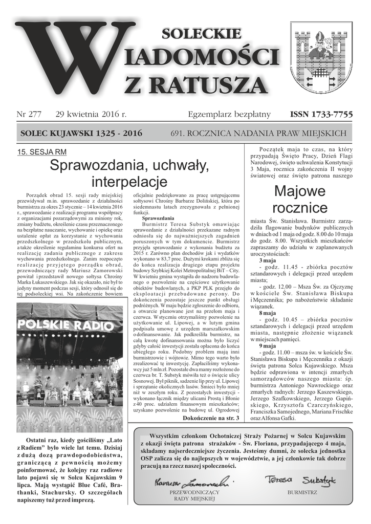 W SOLECKIE IADOMOŚCI Z RATUSZA Nr 277 29 kwietnia 2016 r. Egzemplarz bezpłatny SOLEC KUJAWSKI 1325 - 2016 691. ROCZNICA NADANIA PRAW MIEJSKICH 15. SESJA RM Sprawozdania, uchwały, interpelacje Porządek obrad 15. sesji rady miejskiej przewidywał m.in. sprawozdanie z działalności burmistrza za okres 23 stycznie – 14 kwietnia 2016 r., sprawozdanie z realizacji programu współpracy z organizacjami pozarządowymi za miniony rok, zmiany budżetu, określenie czasu przeznaczonego na bezpłatne nauczanie, wychowanie i opiekę oraz ustalenie opłat za korzystanie z wychowania przedszkolnego w przedszkolu publicznym, a także określenie regulaminu konkursu ofert na realizację zadania publicznego z zakresu wychowania przedszkolnego. Zanim rozpoczęto realizację przyjętego porządku obrad, przewodniczący rady Mariusz Zamorowski powitał i przedstawił nowego sołtysa Chrośny Marka Łukaszewskiego. Jak się okazało, nie był to jedyny moment podczas sesji, który odnosił się do tej podsoleckiej wsi. Na zakończenie bowiem oficjalnie podziękowano za pracę ustępującemu sołtysowi Chrośny Barbarze Dolińskiej, która po siedemnastu latach zrezygnowała z pełnionej funkcji. Sprawozdania Burmistrz Teresa Substyk omawiając sprawozdanie z działalności przekazane radnym odniosła się do najważniejszych zagadnień poruszonych w tym dokumencie. Burmistrz przyjęła sprawozdanie z wykonania budżetu za 2015 r. Zarówno plan dochodów jak i wydatków wykonano w 83,7 proc. Dużymi krokami zbliża się do końca realizacja drugiego etapu projektu budowy Szybkiej Kolei Metropolitalnej BiT – City. W kwietniu gmina wystąpiła do nadzoru budowlanego o pozwolenie na częściowe użytkowanie obiektów budowlanych, a PKP PLK przejęło do e k s p l o a t a c j i p r z e b u d o w a n e p e r o n y. D o dokończenia pozostaje jeszcze punkt obsługi podróżnych. W maju będzie zgłoszenie do odbioru, a otwarcie planowane jest na przełom maja i czerwca. W styczniu otrzymaliśmy pozwolenie na użytkowanie ul. Lipowej, a w lutym gmina podpisała umowę z urzędem marszałkowskim o dofinansowanie. Jak podkreśliła burmistrz, na całą kwotę dofinansowania można było liczyć gdyby całość inwestycji została opłacona do końca ubiegłego roku. Podobny problem mają inni burmistrzowie i wójtowie. Mimo tego warto było zrealizować tę inwestycję. Zapłaciliśmy wykonawcy już 5 mln zł. Pozostałe dwa mamy rozłożone do czerwca br. T. Substyk mówiła też o święcie ulicy Sosnowej. Był piknik, sadzenie lip przy ul. Lipowej i sprzątanie okolicznych lasów. Śmieci było mniej niż w zeszłym roku. Z pozostałych inwestycji wykonano łącznik między ulicami Prostą i Błonie z 40 proc. udziałem finansowym mieszkańców; uzyskano pozwolenie na budowę ul. Ogrodowej Dokończenie na str. 3 Ostatni raz, kiedy gościliśmy „Lato z Radiem” było wiele lat temu. Dzisiaj z dużą dozą prawdopodobieństwa, graniczącą z pewnością możemy poinformować, że kolejny raz radiowe lato pojawi się w Solcu Kujawskim 9 lipca. Mają wystąpić Blue Café, Brathanki, Stachursky. O szczegółach napiszemy tuż przed imprezą. ISSN 1733-7755 Początek maja to czas, na który przypadają Święto Pracy, Dzień Flagi Narodowej, święto uchwalenia Konstytucji 3 Maja, rocznica zakończenia II wojny światowej oraz święto patrona naszego Majowe rocznice miasta Św. Stanisława. Burmistrz zarządziła flagowanie budynków publicznych w dniach od 1 maja od godz. 8.00 do 10 maja do godz. 8.00. Wszystkich mieszkańców zapraszamy do udziału w zaplanowanych uroczystościach: 3 maja - godz. 11.45 - zbiórka pocztów sztandarowych i delegacji przed urzędem miasta; - godz. 12.00 – Msza Św. za Ojczyznę w kościele Św. Stanisława Biskupa i Męczennika; po nabożeństwie składanie wiązanek. 8 maja - godz. 10.45 – zbiórka pocztów sztandarowych i delegacji przed urzędem miasta, następnie złożenie wiązanek w miejscach pamięci. 9 maja - godz. 11.00 – msza św. w kościele Św. Stanisława Biskupa i Męczennika z okazji święta patrona Solca Kujawskiego. Msza będzie odprawiona w intencji zmarłych samorządowców naszego miasta: śp. burmistrza Antoniego Nawrockiego oraz zmarłych radnych: Jerzego Kaszewskiego, Jerzego Szafkowskiego, Jerzego Gapińskiego, Krzysztofa Czarczyńskiego, Franciszka Samojednego, Mariana Frischke oraz Alfonsa Gafki. Wszystkim członkom Ochotniczej Straży Pożarnej w Solcu Kujawskim z okazji święta patrona strażaków - Św. Floriana, przypadającego 4 maja, składamy najserdeczniejsze życzenia. Jesteśmy dumni, że solecka jednostka OSP zalicza się do najlepszych w województwie, a jej członkowie tak dobrze pracują na rzecz naszej społeczności. PRZEWODNICZĄCY RADY MIEJSKIEJ BURMISTRZ Nasza gmina uzyskała dofinansowanie na realizację projektu „ReSites Rehabilitation of brownfield sites in Central Europe” (czyli ReSites - Rekultywacja terenów poprzemysłowych w Europie Środkowej) w ramach programu Interreg Europa Środkowa, finansowanego przez Rekultywacja się opłaca Europejski Fundusz Rozwoju Regionalnego w ramach celu Europejska współpraca terytorialna, który wspiera współpracę regionalną między państwami Europy Środkowej w okresie programowania 2014-2020. Celem programu jest współpraca ponad granicami w Europie Środkowej, aby nasze miasta i regiony stały się lepszym miejscem do życia i pracy. Projekt obejmuje działania na rzecz terenów poprzemysłowych, koncepcje i plany remediacji, wdrożenie planów działań na Funkcjonalnych Obszarach Miejskich. Na spotkaniu w Dubrowniku w dniach 14-15 kwietnia Komitet Monitorujący program wybrał 35 projektów do realizacji. Łącznie złożonych było 620 wniosków aplikacyjnych, z tego 91 zostało wytypowanych do drugiego etapu i do przygotowania pełnej aplikacji. Spośród nich 35 projektów uzyskało dofinansowanie. Budżet soleckiego projektu to 251.240,00 euro, z tego pozyskan
