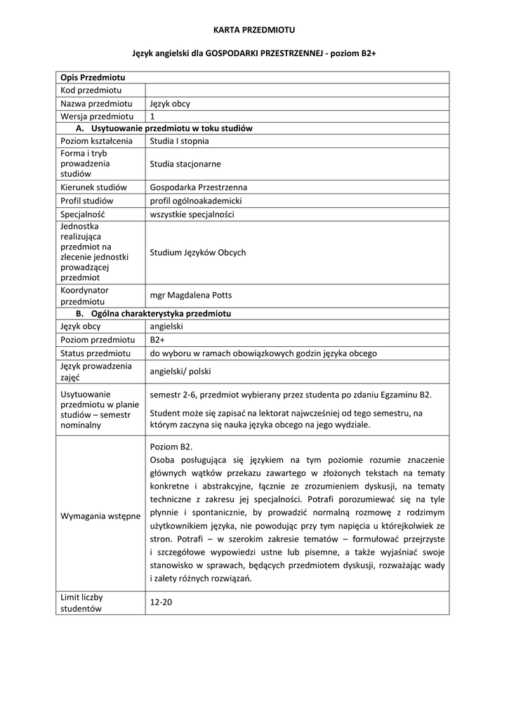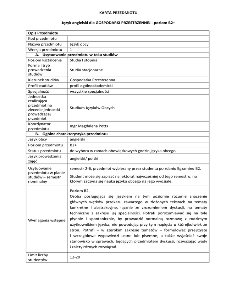 KARTA PRZEDMIOTU Język angielski dla GOSPODARKI PRZESTRZENNEJ - poziom B2+ Opis Przedmiotu Kod przedmiotu Nazwa przedmiotu Język obcy Wersja przedmiotu 1 A. Usytuowanie przedmiotu w toku studiów Poziom kształcenia Studia I stopnia Forma i tryb prowadzenia Studia stacjonarne studiów Kierunek studiów Gospodarka Przestrzenna Profil studiów profil ogólnoakademicki Specjalność wszystkie specjalności Jednostka realizująca przedmiot na Studium Języków Obcych zlecenie jednostki prowadzącej przedmiot Koordynator mgr Magdalena Potts przedmiotu B. Ogólna charakterystyka przedmiotu Język obcy angielski Poziom przedmiotu B2+ Status przedmiotu do wyboru w ramach obowiązkowych godzin języka obcego Język prowadzenia angielski/ polski zajęć Usytuowanie przedmiotu w planie studiów – semestr nominalny semestr 2-6, przedmiot wybierany przez studenta po zdaniu Egzaminu B2. Student może się zapisać na lektorat najwcześniej od tego semestru, na którym zaczyna się nauka języka obcego na jego wydziale. Poziom B2. Osoba posługująca się językiem na tym poziomie rozumie znaczenie głównych wątków przekazu zawartego w złożonych tekstach na tematy konkretne i abstrakcyjne, łącznie ze zrozumieniem dyskusji, na tematy techniczne z zakresu jej specjalności. Potrafi porozumiewać się na tyle Wymagania wstępne płynnie i spontanicznie, by prowadzić normalną rozmowę z rodzimym użytkownikiem języka, nie powodując przy tym napięcia u którejkolwiek ze stron. Potrafi – w szerokim zakresie tematów – formułować przejrzyste i szczegółowe wypowiedzi ustne lub pisemne, a także wyjaśniać swoje stanowisko w sprawach, będących przedmiotem dyskusji, rozważając wady i zalety różnych rozwiązań. Limit liczby studentów 12-20 C. Efekty kształcenia i sposób prowadzenia zajęć Formy zajęć dydaktycznych Wiedza Umiejętności Efekty kształcenia Student zna słownictwo i struktury gramatyczne, pozwalające mu na tworzenie klarownych, dobrze skonstruowanych wypowiedzi. Zna właściwe funkcjonalnie wyrażenia, aby zabrać głos w dyskusji i wypowiadać się na temat studiowanej dziedziny. Pisanie: Potrafi tworzyć zwięzłe wypowiedzi w zrozumiały i przejrzysty sposób posługując się językiem technicznym. Potrafi przygotować krótki opis swojego projektu dotyczący np. środowiska naturalnego, planowania przestrzennego, zrobić notatki z wykładu ze swojej dziedziny, napisać streszczenie artykułu na tematy związane z gospodarką przestrzenną. Czytanie: Rozumie rozbudowane teksty specjalistyczne i dłuższe instrukcje techniczne związane z daną dziedziną. Mówienie: Potrafi formułować przejrzyste i rozbudowane wypowiedzi, dotyczące konkretnych zagadnień ze swojej dziedziny swobodnie posługując się terminologią techniczną. Potrafi skutecznie porozumiewać się w sprawach zawodowych. Potrafi w sposób spójny i przejrzysty dokonać prezentacji na dany temat. Potrafi wyjaśnić swój punkt widzenia podając argumenty za i przeciw oraz kończąc odpowiednią konkluzją. Słuchanie: Rozumie dłuższe wypowiedzi nawet, jeśli nie są one jasno skonstruowane i kiedy związki logiczne są w nich jedynie implikowane, a nie wyrażone bezpośrednio. Rozumie wykłady i prezentacje na tematy związane z gospodarką przestrzenną. Nie sprawiają mu większego problemu wypowiedzi w tempie naturalnym, typowym dla osób, dla których język angielski jest językiem ojczystym. Kompetencje społeczne Cel przedmiotu Rozwój znajomości jęz. angielskiego na poziomie B2 zgodnie z Europejskim Opisem Kształcenia Językowego w zakresie języka specjalistycznego. Zapoznanie studentów z podstawową terminologią dotyczą gospodarki przestrzennej, przygotowanie do porozumiewania się na tematy fachowe podczas studenckich wymian zagranicznych oraz do uczestniczenia w wykładach i zajęciach na uczelniach zagranicznych podczas wyjazdów w ramach programu Erasmus. Rozwijanie umiejętności czytania literatury fachowej, tekstów i artykułów fachowych z zakresu gospodarki przestrzennej w języku angielskim. Nauka opisywania i prezentowania projektów. Potrafi włączać się do rozmów, prowadzonych na znane mu tematy, potrafi wnosić własny wkład do dyskusji. Potrafi wyrażać się stosownie do sytuacji. Potrafi stosować formalny lub nieformalny rejestr wypowiedzi , odpowiednio do sytuacji i rozmówcy. ćwiczenia 30 godzin Treści kształcenia Tematyka lektoratu dotyczy takich zagadnień jak: ▪ Elementy naturalne środowiska i wytwory działalności ludzkiej. ▪ Obszary zurbanizowane – elementy, planowanie. ▪ Budownictwo – budynki, działki. ▪ Nieruchomości. ▪ Elementy prawa i administracji – prawo ochrony środowiska, administracja regionalna. ▪ Infrastruktura techniczna: drogi, mosty, tunele, kolej. ▪ Zasoby wodne – dystrybucja ▪ Energia - dystrybucja Metody sprawdzania efektów → → → → → Egzamin nie Literatura Geo-English, A.Czerw, B.Durlik, M.Hryniewicz. Wydawnictwo AGH, autentyczne teksty fachowe, nagrania wideo oraz materiały własne lektora. Witryna www przedmiotu www.sjo.pw.edu.pl praca na zajęciach prace domowe krótkie prace kontrolne prezentacja test końcowy D. Nakład pracy studenta Liczba punktów ECTS 2 Liczba godzin pracy studenta związanych z osiągnięciem efektów kształcenia 30 godzin zajęcia + 30 godzin pracy własnej studenta (w tym przygotowanie do zajęć, przygotowanie do testu zaliczeniowego, przygotowanie jednej dłuższej multimedialnej prezentacji) E. Informacje dodatkowe Uwagi Wymagania do zaliczenia Obecność na zajęciach (dopuszczalne 2 nieusprawiedliwione nieobecności) Zaliczenie wszystkich prac kontrolnych Wykonanie wszystkich prac domowych Aktywne uczestnictwo w zajęciach Prezentacja Uzyskanie pozytywnej oceny z testu zaliczeniowego (waga oceny z testu zaliczeniowego w ocenie końcowej: 50%) Data aktualizacji aktualizacja na www.sjo.pw.edu.pl