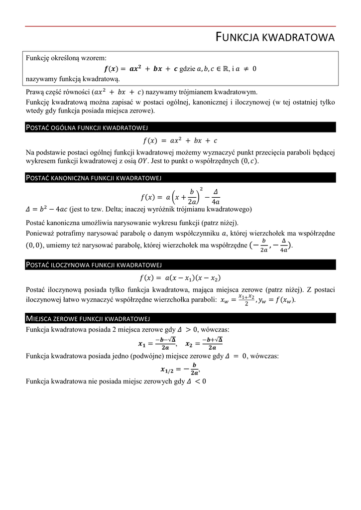 FUNKCJA KWADRATOWA Funkcję określoną wzorem: gdzie ,i nazywamy funkcją kwadratową. Prawą część równości ( ) nazywamy trójmianem kwadratowym. Funkcję kwadratową można zapisać w postaci ogólnej, kanonicznej i iloczynowej (w tej ostatniej tylko wtedy gdy funkcja posiada miejsca zerowe). POSTAD OGÓLNA FUNKCJI KWADRATOWEJ Na podstawie postaci ogólnej funkcji kwadratowej możemy wyznaczyć punkt przecięcia paraboli będącej wykresem funkcji kwadratowej z osią . Jest to punkt o współrzędnych . POSTAD KANONICZNA FUNKCJI KWADRATOWEJ ( ) (jest to tzw. Delta; inaczej wyróżnik trójmianu kwadratowego) Postać kanoniczna umożliwia narysowanie wykresu funkcji (patrz niżej). Ponieważ potrafimy narysować parabolę o danym współczynniku , której wierzchołek ma współrzędne , umiemy też narysować parabolę, której wierzchołek ma współrzędne . POSTAD ILOCZYNOWA FUNKCJI KWADRATOWEJ Postać iloczynową posiada tylko funkcja kwadratowa, mająca miejsca zerowe (patrz niżej). Z postaci iloczynowej łatwo wyznaczyć współrzędne wierzchołka paraboli: ). MIEJSCA ZEROWE FUNKCJI KWADRATOWEJ Funkcja kwadratowa posiada 2 miejsca zerowe gdy √ , wówczas: √ , Funkcja kwadratowa posiada jedno (podwójne) miejsce zerowe gdy , Funkcja kwadratowa nie posiada miejsc zerowych gdy , wówczas: WYKRES FUNKCJI KWADRATOWEJ Wykresem funkcji kwadratowej jest krzywa zwana parabolą. Współczynnik paraboli. Czym większa jest | | tym parabola jest „smuklejsza”. W przypadku skierowane do góry, dla skierowane w dół. decyduje o rozwartości ramiona paraboli są Kilka parabol – wykresów funkcji kwadatowych DZIEDZINA I ZBIÓR WARTOŚCI FUNKCJI KWADRATOWEJ Dziedziną funkcja kwadratowej jest . Zbiór wartości, jak widać z wykresu, to przedział dla lub przedział dla , gdzie to współrzędna igrekowa wierzchołka paraboli. ZAMIANA POSTACI FUNKCJI KWADRATOWEJ Zamiana postaci kanonicznej na ogólną nie nastręcza kłopotów. Postać iloczynową (jeśli istnieje) uzyskujemy znajdując miejsca zerowe funkcji kwadratowej. Zamianę postaci ogólnej na kanoniczną bez korzystania z wzorów, prześledzimy na przykładzie: ( ) ( ) WZORY VIETE’A Jeśli liczby i są pierwiastkami równania kwadratowego: to między pierwiastkami zachodzą zależności, nazywane wzorami Viete’a: ,