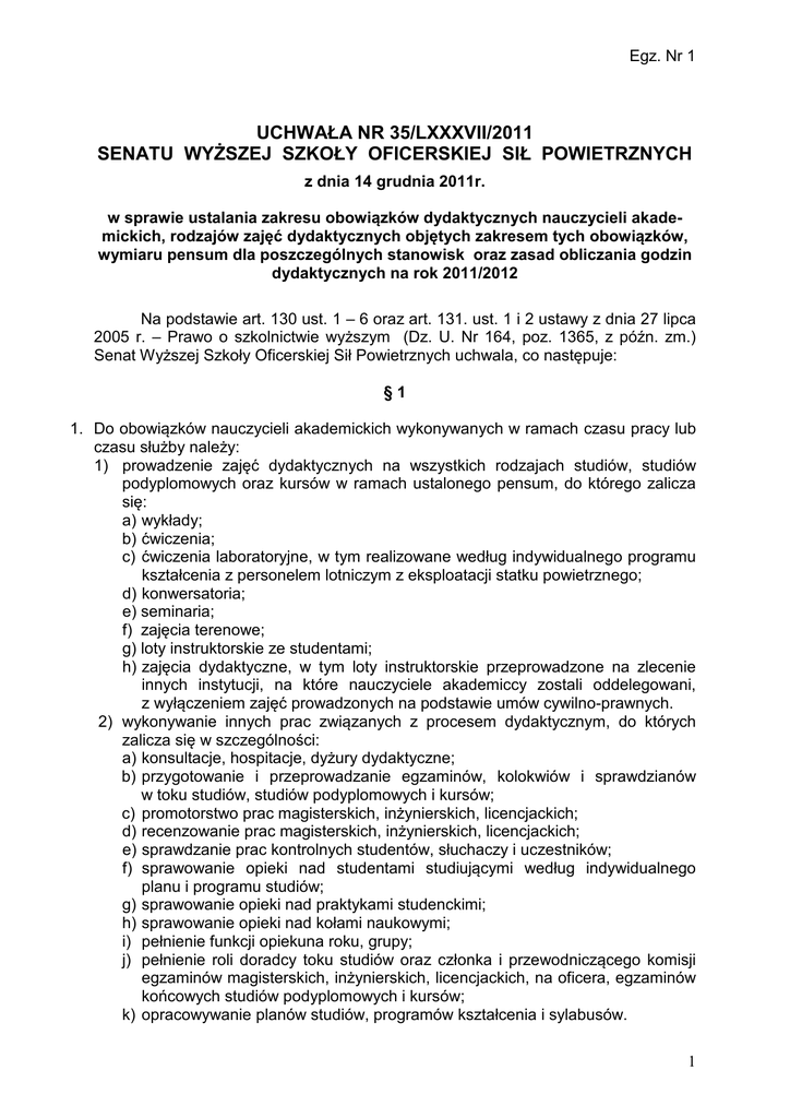 Egz. Nr 1 UCHWAŁA NR 35/LXXXVII/2011 SENATU WYŻSZEJ SZKOŁY OFICERSKIEJ SIŁ POWIETRZNYCH z dnia 14 grudnia 2011r. w sprawie ustalania zakresu obowiązków dydaktycznych nauczycieli akademickich, rodzajów zajęć dydaktycznych objętych zakresem tych obowiązków, wymiaru pensum dla poszczególnych stanowisk oraz zasad obliczania godzin dydaktycznych na rok 2011/2012 Na podstawie art. 130 ust. 1 – 6 oraz art. 131. ust. 1 i 2 ustawy z dnia 27 lipca 2005 r. – Prawo o szkolnictwie wyższym (Dz. U. Nr 164, poz. 1365, z późn. zm.) Senat Wyższej Szkoły Oficerskiej Sił Powietrznych uchwala, co następuje: §1 1. Do obowiązków nauczycieli akademickich wykonywanych w ramach czasu pracy lub czasu służby należy: 1) prowadzenie zajęć dydaktycznych na wszystkich rodzajach studiów, studiów podyplomowych oraz kursów w ramach ustalonego pensum, do którego zalicza się: a) wykłady; b) ćwiczenia; c) ćwiczenia laboratoryjne, w tym realizowane według indywidualnego programu kształcenia z personelem lotniczym z eksploatacji statku powietrznego; d) konwersatoria; e) seminaria; f) zajęcia terenowe; g) loty instruktorskie ze studentami; h) zajęcia dydaktyczne, w tym loty instruktorskie przeprowadzone na zlecenie innych instytucji, na które nauczyciele akademiccy zostali oddelegowani, z wyłączeniem zajęć prowadzonych na podstawie umów cywilno-prawnych. 2) wykonywanie innych prac związanych z procesem dydaktycznym, do których zalicza się w szczególności: a) konsultacje, hospitacje, dyżury dydaktyczne; b) przygotowanie i przeprowadzanie egzaminów, kolokwiów i sprawdzianów w toku studiów, studiów podyplomowych i kursów; c) promotorstwo prac magisterskich, inżynierskich, licencjackich; d) recenzowanie prac magisterskich, inżynierskich, licencjackich; e) sprawdzanie prac kontrolnych studentów, słuchaczy i uczestników; f) sprawowanie opieki nad studentami studiującymi według indywidualnego planu i programu studiów; g) sprawowanie opieki nad praktykami studenckimi; h) sprawowanie opieki nad kołami naukowymi; i) pełnienie funkcji opiekuna roku, grupy; j) pełnienie roli doradcy toku studiów oraz członka i przewodniczącego komisji egzaminów magisterskich, inżynierskich, licencjackich, na oficera, egzaminów końcowych studiów podyplomowych i kursów; k) opracowywanie planów studiów, programów kształcenia i sylabusów. 1 Egz. Nr 1 3) wykonywanie prac organizacyjnych związanych z procesem dydaktycznym, do których zalicza się w szczególności: a) projektowanie i uruchomienie stanowisk laboratoryjnych, b) przygotowanie materiałów i pomocy dydaktycznych, c) udział w przygotowaniu konferencji naukowej, dydaktycznej lub wystawy, d) tłumaczenie referatów, artykułów i innych materiałów naukowych i dydaktycznych na język obcy bądź z języka obcego na język polski przez nauczycieli ze Studium Języków Obcych; 4) kształcenie i wychowywanie studentów oraz uczestnictwo w życiu uczelni; 5) kształcenie i rozwój kadry naukowej; 6) prowadzenie badań naukowych i prac rozwojowych; 7) udział w pracach komisji uczelnianych i wydziałowych wynikających ze statutu, uchwał senatu i rady wydziału oraz zarządzeń rektora. 2. Do czasu pracy lub czasu służby nauczycieli akademickich zatrudnionych na stanowiskach dydaktycznych nie wlicza się prac wymienionych w ust. 1 pkt 5 i 6. 3. Szczegółowy zakres i wymiar obowiązków nauczyciela akademickiego ustala kierownik jednostki organizacyjnej, któremu podlega nauczyciel akademicki. §2 Ustala się wymiar pensum dydaktycznego dla poszczególnych stanowisk (osób zatrudnionych na pełnym etacie) w następującej wysokości: 1) profesor zwyczajny, profesor nadzwyczajny, profesor wizytujący posiadający stopień naukowy doktora habilitowanego - 120 godzin; 2) profesor nadzwyczajny, profesor wizytujący posiadający stopień naukowy doktora - 120 godzin 3) adiunkt - 240 godzin; 4) asystent - 240 godzin; 5) docent - 300 godzin; 6) starszy wykładowca, wykładowca - 360 godzin; 7) lektor, instruktor - 540 godzin. §3 Ustala się wymiar pensum dla nauczycieli akademickich pełniących funkcje kierownicze lub zatrudnionych na stanowiskach kierowniczych: 1) rektora – komendanta, prorektora, zastępcy rektora – komendanta, dziekana – 120 godzin; 2) prodziekana, szefa katedry, kierownika zakładu, ośrodka, studium, pracowni – 140 godzin. §4 Na pensum składają się liczone w godzinach obliczeniowych, zajęcia dydaktyczne, o których mowa w § 1 ust. 1 pkt 1, ujęte w planach studiów stacjonarnych, niestacjonarnych, podyplomowych, programach kursów dokształcających realizowanych na zlecenie Ministra Obrony Narodowej i inne wymienione w § 5 pkt 3 lit. c – k, związane z realizacją procesu dydaktycznego. 2 Egz. Nr 1 §5 Ustala się następujące zasady rozliczania pensum: 1) obowiązkiem nauczyciela akademickiego jest pełne wykonanie ustalonego dla niego pensum podanego w godzinach obliczeniowych; 2) co najmniej 70% pensum należy wykonać w formie zajęć dydaktycznych, o których mowa w § 1 ust. 1 pkt 1; 3) za jedną godzinę dydaktyczną (45 minut) nalicza się 1 godzinę obliczeniową poza niżej wymienionymi przypadkami: a) 1 godzina zajęć dydaktycznych prowadzonych w języku obcym stanowi 3 godziny obliczeniowe, z wyjątkiem zajęć prowadzonych przez nauczycieli języków obcych oraz zajęć prowadzonych na podstawie umów cywilno–prawnych zawartych z nauczycielami akademickimi; b) 1 godzina zajęć dydaktycznych prowadzonych w sobotę, niedzielę i święta stanowi 1,5 godziny obliczeniowej; c) za każdą pracę dyplomową zakończoną pozytywną opinią recenzenta i zdaną do dziekanatu, nauczycielowi akademickiemu kierującemu tą pracą zaliczą się do pensum: − 8 godzin obliczeniowych za każdą ukończoną pracę inżynierską, licencjacką, − 10 godzin obliczeniowych za każdą ukończoną pracę magisterską, d) za recenzowanie prac dyplomowych inżynierskich, licencjackic