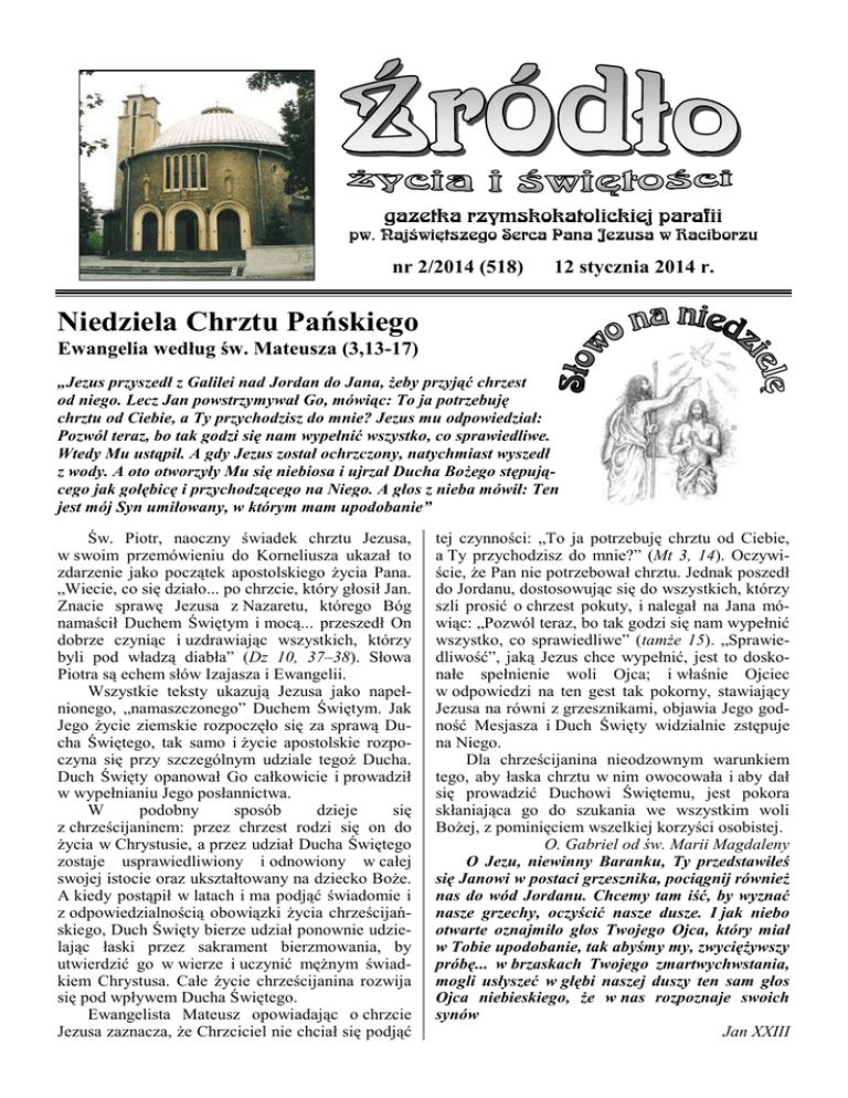 gazetka rzymskokatolickiej parafii pw. Najświętszego Serca Pana Jezusa w Raciborzu nr 2/2014 (518) 12 stycznia 2014 r. Niedziela Chrztu Pańskiego Ewangelia według św. Mateusza (3,13-17) „Jezus przyszedł z Galilei nad Jordan do Jana, Ŝeby przyjąć chrzest od niego. Lecz Jan powstrzymywał Go, mówiąc: To ja potrzebuję chrztu od Ciebie, a Ty przychodzisz do mnie? Jezus mu odpowiedział: Pozwól teraz, bo tak godzi się nam wypełnić wszystko, co sprawiedliwe. Wtedy Mu ustąpił. A gdy Jezus został ochrzczony, natychmiast wyszedł z wody. A oto otworzyły Mu się niebiosa i ujrzał Ducha BoŜego stępującego jak gołębicę i przychodzącego na Niego. A głos z nieba mówił: Ten jest mój Syn umiłowany, w którym mam upodobanie” Św. Piotr, naoczny świadek chrztu Jezusa, w swoim przemówieniu do Korneliusza ukazał to zdarzenie jako początek apostolskiego Ŝycia Pana. „Wiecie, co się działo... po chrzcie, który głosił Jan. Znacie sprawę Jezusa z Nazaretu, którego Bóg namaścił Duchem Świętym i mocą... przeszedł On dobrze czyniąc i uzdrawiając wszystkich, którzy byli pod władzą diabła” (Dz 10, 37–38). Słowa Piotra są echem słów Izajasza i Ewangelii. Wszystkie teksty ukazują Jezusa jako napełnionego, „namaszczonego” Duchem Świętym. Jak Jego Ŝycie ziemskie rozpoczęło się za sprawą Ducha Świętego, tak samo i Ŝycie apostolskie rozpoczyna się przy szczególnym udziale tegoŜ Ducha. Duch Święty opanował Go całkowicie i prowadził w wypełnianiu Jego posłannictwa. W podobny sposób dzieje się z chrześcijaninem: przez chrzest rodzi się on do Ŝycia w Chrystusie, a przez udział Ducha Świętego zostaje usprawiedliwiony i odnowiony w całej swojej istocie oraz ukształtowany na dziecko BoŜe. A kiedy postąpił w latach i ma podjąć świadomie i z odpowiedzialnością obowiązki Ŝycia chrześcijańskiego, Duch Święty bierze udział ponownie udzielając łaski przez sakrament bierzmowania, by utwierdzić go w wierze i uczynić męŜnym świadkiem Chrystusa. Całe Ŝycie chrześcijanina rozwija się pod wpływem Ducha Świętego. Ewangelista Mateusz opowiadając o chrzcie Jezusa zaznacza, Ŝe Chrzciciel nie chciał się podjąć tej czynności: „To ja potrzebuję chrztu od Ciebie, a Ty przychodzisz do mnie?” (Mt 3, 14). Oczywiście, Ŝe Pan nie potrzebował chrztu. Jednak poszedł do Jordanu, dostosowując się do wszystkich, którzy szli prosić o chrzest pokuty, i nalegał na Jana mówiąc: „Pozwól teraz, bo tak godzi się nam wypełnić wszystko, co sprawiedliwe” (tamŜe 15). „Sprawiedliwość”, jaką Jezus chce wypełnić, jest to doskonałe spełnienie woli Ojca; i właśnie Ojciec w odpowiedzi na ten gest tak pokorny, stawiający Jezusa na równi z grzesznikami, objawia Jego godność Mesjasza i Duch Święty widzialnie zstępuje na Niego. Dla chrześcijanina nieodzownym warunkiem tego, aby łaska chrztu w nim owocowała i aby dał się prowadzić Duchowi Świętemu, jest pokora skłaniająca go do szukania we wszystkim woli BoŜej, z pominięciem wszelkiej korzyści osobistej. O. Gabriel od św. Marii Magdaleny O Jezu, niewinny Baranku, Ty przedstawiłeś się Janowi w postaci grzesznika, pociągnij równieŜ nas do wód Jordanu. Chcemy tam iść, by wyznać nasze grzechy, oczyścić nasze dusze. I jak niebo otwarte oznajmiło głos Twojego Ojca, który miał w Tobie upodobanie, tak abyśmy my, zwycięŜywszy próbę... w brzaskach Twojego zmartwychwstania, mogli usłyszeć w głębi naszej duszy ten sam głos Ojca niebieskiego, Ŝe w nas rozpoznaje swoich synów Jan XXIII 2 Źródło - gazetka Poniedziałek – 13 stycznia 2014 Mk 1,14-20 630 Za † ojca Maksa Leksa 700 1. Za †† Konrada Cieślika w 18. rocznicę śmierci, Ŝonę Emę, syna Tadeusza oraz †† rodziców z obu stron 2. Za †† rodziców Jana i Walerię, braci Czesława i Stanisława, męŜa Jerzego i jego rodziców Za †† rodziców Marcina i Barbarę oraz za †† braci Zbigniewa i Czesława 1800 Wtorek – 14 stycznia 2014 Mk 1,21-28 630 W intencji Janusza o poprawę zdrowia 800 W języku niemieckim: Für Lebende und Verstorbene aus der Familie 900 Do BoŜej Opatrzności w intencji Arkadiusza z okazji urodzin, z prośbą o BoŜe błogosławieństwo i dary Ducha Świętego 1800 Do Miłosierdzia BoŜego za †† rodziców Helenę i Arnolda Konieczny, †† dziadków i pokrewieństwo z obu stron oraz dusze w czyśćcu cierpiące Środa – 15 stycznia 2014 Mk 1,29-39 630 1. Do Miłosierdzia BoŜego za †† męŜa Winfryda w 9. rocznicę śmierci, †† rodziców z obu stron, dziadków i pokrewieństwo z obu stron oraz dusze w czyśćcu cierpiące 2. Za † męŜa Gintra Liszkę w 32. rocznicę śmierci, †† teściów i pokrewieństwo 700 Za † brata Romualda śebrowskiego w 37. rocznicę śmierci oraz †† rodziców Aleksandra i Marię Msza Święta zbiorowa za zmarłych: do Miłosierdzia BoŜego za † męŜa Józefa Kokoszkę w 2. 1800 rocznicę śmierci, †† ojca Czesława, teściów oraz za wszystkich †† z rodziny, za † siostrę Ryszardę w 2. rocznicę śmierci, do Miłosierdzia BoŜego za † Antoniego Serafina i Józefa Morawskiego w rocznicę śmierci, za † Jana Potaczka (od rodziny Obszańskich), za † Henryka Rusiewicza w 1. rocznicę śmierci, za † męŜa Zbigniewa Głowacza w 26. rocznicę śmierci oraz za †† rodziców z obu stron, za †† matkę Helenę, ojca Stanisława i †† z rodziny, za † Władysława Chęć (od sąsiadów z ulicy Katowickiej 9), za † Piotra Paraczyńskiego (od współlokatorów z ul. Katowickiej 25), za † Marię Jadczyk (od sąsiadów z ul. Katowickiej 9), za †† Marię i Ignacego ZadoroŜny, Franciszkę Rudnik, za † Tomasza Wysopala w 7. rocznicę śmierci Czwartek – 16 stycznia 2014 Mk 1,40-45 630 1. Za † córkę Annę Bubińską 2. W intencji Artura o pomyślny przebieg zabiegu i szybki powrót do zdrowia 700 Za †† Gabrielę Borowiec i matk
