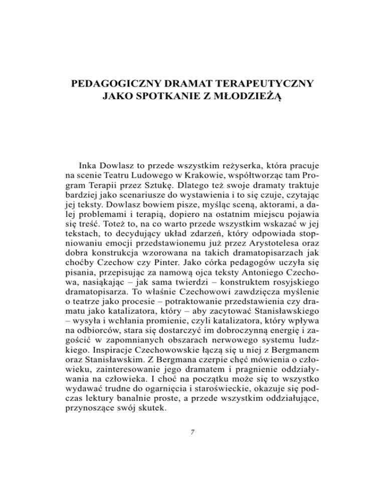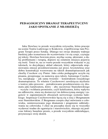 PEDAGOGICZNY DRAMAT TERAPEUTYCZNY JAKO SPOTKANIE Z MŁODZIEŻĄ Inka Dowlasz to przede wszystkim reżyserka, która pracuje na scenie Teatru Ludowego w Krakowie, współtworząc tam Program Terapii przez Sztukę. Dlatego też swoje dramaty traktuje bardziej jako scenariusze do wystawienia i to się czuje, czytając jej teksty. Dowlasz bowiem pisze, myśląc sceną, aktorami, a dalej problemami i terapią, dopiero na ostatnim miejscu pojawia się treść. Toteż to, na co warto przede wszystkim wskazać w jej tekstach, to decydujący układ zdarzeń, który odpowiada stopniowaniu emocji przedstawionemu już przez Arystotelesa oraz dobra konstrukcja wzorowana na takich dramatopisarzach jak choćby Czechow czy Pinter. Jako córka pedagogów uczyła się pisania, przepisując za namową ojca teksty Antoniego Czechowa, nasiąkając – jak sama twierdzi – konstruktem rosyjskiego dramatopisarza. To właśnie Czechowowi zawdzięcza myślenie o teatrze jako procesie – potraktowanie przedstawienia czy dramatu jako katalizatora, który – aby zacytować Stanisławskiego – wysyła i wchłania promienie, czyli katalizatora, który wpływa na odbiorców, stara się dostarczyć im dobroczynną energię i zagościć w zapomnianych obszarach nerwowego systemu ludzkiego. Inspiracje Czechowowskie łączą się u niej z Bergmanem oraz Stanisławskim. Z Bergmana czerpie chęć mówienia o człowieku, zainteresowanie jego dramatem i pragnienie oddziaływania na człowieka. I choć na początku może się to wszystko wydawać trudne do ogarnięcia i staroświeckie, okazuje się podczas lektury banalnie proste, a przede wszystkim oddziałujące, przynoszące swój skutek. 7 Bici biją. Etiudy sceniczne o dorastaniu. Część I Dowlasz traktuje bowiem dramat-scenariusz1 jako element biorący udział czy też determinujący proces neurofizjologiczny, który ma doprowadzić do arystotelesowskiego rozpoznania, do „aha” mającego, z jednej strony, pełnić funkcję katarktyczno-dydaktyczną, z drugiej opierać się o mimetyzm cielesno-emocjonalny. Już sama idea traktowania biernej lektury czy aktywnej percepcji dzieła teatralnego bądź czynnej pracy nad scenariuszem jako procesu neurofizjologicznego przywodzi na myśl połączenie nazywane z angielska mind-body, czyli psychofizyczne ujęcie aktu odbioru jako symbiozy reakcji cielesnych i mentalnych. Psychofizyczność zatem będzie rozumiana jako proces odwołujący się i opierający na emocjach, zatem jako aktywność ośrodka nerwowego, który pobudza werbalne i niewerbalne elementy partycypujące w percepcji sztuki. Widz/czytelnik całym sobą uczestniczy w wydarzeniach scenicznych/dramatycznych. Emocje odczuwa zarówno ciało traktowane jako niewerbalna ekspresja, jak i umysł skłaniający do interpretacji czy analizy. Wszelkie emocje wyzwalane w odbiorcy traktowane są zgodnie z teorią Richarda Schwedera, który twierdzi, że emocje to sposób opowiadania o wydarzeniach somatycznych. Przy czym wydarzenia somatyczne w przyUżywam sformułowania dramat-scenariusz, ponieważ teksty Dowlasz to przede wszystkim teksty sceniczne, które pisane są z myślą o wystawieniu na scenie i dopiero na scenie zyskują właściwy wymiar – mają zatem charakter scenariusza przedstawienia teatralnego. Jednak uważam, że już samo czytanie oraz analiza i próba interpretacji – w ramach biblioterapii – mogą pełnić funkcję terapeutyczną. Kiedy używam sformułowania dramat, mam na myśli zaliczenie tych tekstów do gatunku dramatycznego ze względu na cechujące je klasyczne wyznaczniki tego gatunku literackiego: podział na role, wprowadzenie didaskaliów oraz ich sceniczne przesłanie. Toteż literalnie należy je uwzględnić jako dramaty, ale de facto stanowią scenariusz przedstawienia i właśnie owo przesłanie decyduje o ich literackim charakterze – o uproszczonej formie, nawiązaniu do antycznej formy dramatycznej, której tym tekstom bliżej niż do współczesnego dramatu, wprowadzeniu uwag odreżyserskich, uproszczeniu fabuły, wprowadzeniu zakończenie na zasadzie deus ex machina etc. Warto w tym miejscu podkreślić, że dramatolodzy – nie doceniając terapeutycznego wymiaru tych tekstów i ich scenicznego przesłania – często oceniają ich dramatyczne (literackie) wymiary jako niepasujące do współczesnej koncepcji dramatu. 1 8 Pedagogiczny dramat terapeutyczny jako spotkanie z młodzieżą padku interpretacji tekstów Dowlasz będą tożsame z cielesnym, fizycznym kontaktem ze środowiskiem zewnętrznym oraz reakcją na wszelkie zmiany z nim zachodzące, które mogą być świadomie kontrolowane i przetwarzane. Tak definiowany układ somatyczny, rozszerzony do warstwy problemowej świata zewnętrznego, wciąż będzie pozostawał w opozycji do autonomicznego nerwowego układu, który będzie odznaczał się przede wszystkim jego niekontrolowanym, niepodlegającym racjonalizacji ani uświadomieniu charakterem. Emocje zatem, idąc tropem Schwedera, to reagowanie na bodźce i sytuacje zewnętrzne, spostrzeganie powiązane z planem na przyszłość. To system interpretacji. Wyzwolenie emocji pozwala na zapoczątkowanie performatywnego procesu analizy i interpretacji zjawiska zewnętrznego oraz jego oddziaływania na postawę, zachowanie, wybory czy uczucia jednostki. Zadaniem dramatu-scenariusza Dowlasz jest zatem pobudzenie emocji, ukazanie nowego punktu widzenia, mające na celu rozpoczęcie procesu analizy konkretnego wydarzenia. Tak postawione zadanie jest bardzo trudne, dlatego Dowlasz mówi, że jej pisanie, a także recepcja jej tekstów to trochę walka byków, corrida z odbiorcą, który nie chce ujawnić swoich emocji, a woli trzymać je na uwięzi. Chodzi o to, że autorka stara się poczuć widza/czytelnika, albowiem kieruje swoje teksty do bardzo wymagającego odbiorcy – do młodego człowieka, który usiłuje odrzucać wszystko, co kojarzy mu się z dydaktyką i moralizowaniem dorosłych. Dowlasz chce pochwycić swo