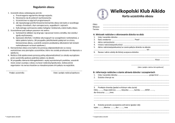Regulamin obozu 1. Uczestnik obozu zobowiązany jest do: a. Przestrzegania regulaminu danego wyjazdu. b. Stosowania się do poleceń wychowawców. c. Uczestnictwa w zajęciach programowych. d. Jak najszybszego poinformowania kierownika obozu lub kadry o wszelkiego rodzaju chorobach, złym samopoczuciu, wypadkach i zajściach. e. Kulturalnego zachowania wobec kolegów i koleżanek,a także kadry obozu. 2. Uczestnikowi pod żadnym pozorem nie wolno: a. Samowolnie oddalać się od grupy i opuszczać terenu ośrodka, bez wiedzy i zgody wychowawcy. b. Spożywać alkoholu i środków odurzających (w szczególności narkotyków), a także palenia tytoniu. (W przypadku jakichkolwiek podejrzeń ze strony kierownictwa obozu, uczestnik zostanie przebadany alkomatem lub testami narkotykowymi na koszt opiekuna.) 3. Kierownictwo obozu oraz kadra nie ponoszą odpowiedzialności za rzeczy wartościowe oraz pieniądze uczestników, które nie zostały przekazane do depozytu u opiekuna. 4. Rodzice i/lub opiekunowie ponoszą pełną odpowiedzialność za szkody wyrządzone przez uczestnika podczas podróżyi pobytu na obozie. 5. W przypadku złamania któregokolwiek z wyżej wymienionych punktów, uczestnik może zostać usunięty z obozu na koszt rodziców/opiekunów. Jednocześnie organizator nie zwraca kosztów za niewykorzystane dni pobytu na wyjeździe. ……………………………………… Podpis uczestnika ………………………………………………………… Data i podpis rodzica/opiekuna Wielkopolski Klub Aikido Karta uczestnika obozu Obóz: Miejsce: Termin: ………………………………………………………………………………………………………………………… ………………………………………………………………………………………………………………………… ………………………………………………………………………………………………………………………… A. Wniosek rodziców o skierowanie dziecka na obóz 1. Imię i nazwisko dziecka: ……………………………………………………………………………………………… 2. Data urodzenia: ………………………………………… Pesel: …………………………………………………… 3. Adres zamieszkania: …………………………………………………………………………………………………… 4. Imiona rodziców(opiekunów): …………………………………………………………………………………… 5. Adres rodziców(opiekunów) w czasie pobytu dziecka na obozie: ………………………………………………………………………………………………… tel.: .………………………………… 6. Nazwa i adres szkoły do której uczęszcza dziecko: …………………………………………………………………………………………………………………………………………… …………………………………………………………………………………………………………………………………………… ………………………………………………………………………………………………………………… klasa: ……………… ……………………………………………………………………… (data i podpis rodzica lub opiekuna)…………. B. Informacje rodziców o stanie zdrowia dziecka i szczepieniach 1. Imię i nazwisko dziecka ………………………………………………………… grupa krwi ………………… 2. Dziecko choruje na: …………………………………………………………………………………………………………………………………………… …………………………………………………………………………………………………………………………………………… …………………………………………………………………………………………………………………………………………… 3. Przebyte choroby (podać w którym roku życia): Odra ………, Ospa wietrzna ………, różyczka ………, świnka ………,WZW ………, dur brzuszny ………,Inne: …………………………………………………………………………………………………………………………………………… …………………………………………………………………………………………………………………………………………… …………………………………………………………………………………………………………………………………………… 4. Dziecko przeszło szczepienia ochronne (podać rok): tężec ………, błonica ………, dur ………, inne …………………………………………………………………………………………………………………………………………… …………………………………………………………………………………………………………………………………………… *-niepotrzebne skreślić *-niepotrzebne skreślić 5. U dziecka występują*: drgawki, utraty przytomności, zaburzenia równowagi, omdlenia, bóle głowy, lęki nocne, trudności w zasypianiu, moczenie, bóle brzucha, krwawienie z nosa, angina, duszności, bóle stawów, wymioty, inne: …………………………………………………………………………………………………………………………………………… …………………………………………………………………………………………………………………………………………… 6. Czy dziecko w ostatnim roku przebywało w szpitalu – jeśli tak proszę podać przyczynę i kiedy: 