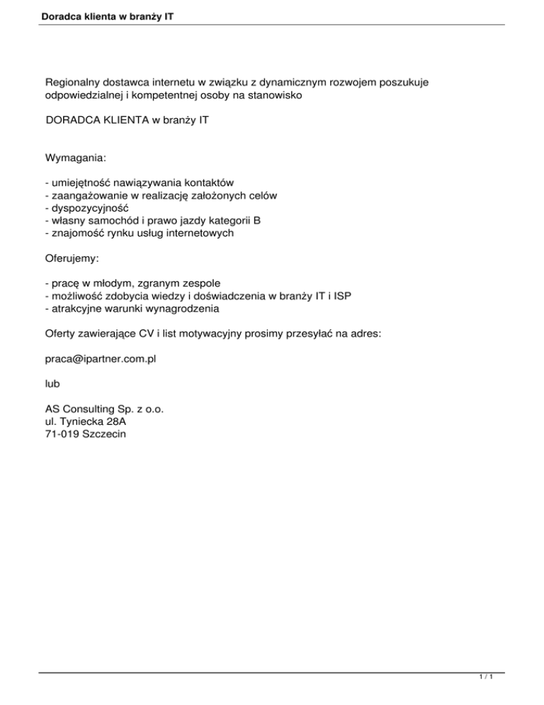 Doradca klienta w branży IT Regionalny dostawca internetu w związku z dynamicznym rozwojem poszukuje odpowiedzialnej i kompetentnej osoby na stanowisko DORADCA KLIENTA w branży IT Wymagania: - umiejętność nawiązywania kontaktów - zaangażowanie w realizację założonych celów - dyspozycyjność - własny samochód i prawo jazdy kategorii B - znajomość rynku usług internetowych Oferujemy: - pracę w młodym, zgranym zespole - możliwość zdobycia wiedzy i doświadczenia w branży IT i ISP - atrakcyjne warunki wynagrodzenia Oferty zawierające CV i list motywacyjny prosimy przesyłać na adres: [email protected] lub AS Consulting Sp. z o.o. ul. Tyniecka 28A 71-019 Szczecin 1/1