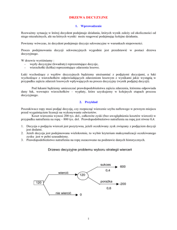 DRZEWA DECYZYJNE 1. Wprowadzenie Rozważmy sytuację w której decydent podejmuje działania, których wynik zależy od okoliczności od niego niezależnych, ale na których wyniki może reagować podejmując kolejne działania. Powiemy wówczas, że decydent podejmuje decyzje sekwencyjne w warunkach niepewności. Proces podejmowania decyzji sekwencyjnych wygodnie jest przedstawić w postaci drzewa decyzyjnego. W drzewie wyróżniamy : - węzły decyzyjne (kwadraty) reprezentujące decyzje, - wierzchołki (kółka) reprezentujące zdarzenia losowe. Łuki wychodzące z węzłów decyzyjnych będziemy utożsamiać z podjętymi decyzjami, a łuki wychodzące z wierzchołków odpowiadających zdarzeniom losowym z wynikami jakie wystąpią w przypadku zajścia zdarzeń losowych wpływających na proces decyzyjny (wynik podjętej decyzji). Pod łukami będziemy umieszczać prawdopodobieństwa zajścia zdarzenia, któremu odpowiada dany łuk, wewnątrz wierzchołków – wypłaty, które uzyskujemy w kolejnych etapach procesu decyzyjnego. 2. Przykład Poszukiwacz ropy musi podjąć decyzję, czy rozpocząć wiercenie szybu naftowego w pewnym miejscu przed wygaśnięciem licencji na wykonywanie odwiertów. Koszt wiercenia wynosi 200 tys. dol., całkowite zyski (bez uwzględnienia kosztów wierceń) w przypadku natrafienia na ropę – 800 tys. dol. Prawdopodobieństwo natrafienia na ropę jest równe 0,4. 1. Decyzja o podjęciu wierceń jest pozytywna, jeżeli oczekiwany zysk związany z podjęciem decyzji jest dodatni. 2. Jeżeli decyzja jest podejmowana wielokrotnie, to wybór kryterium maksymalizacji oczekiwanego zysku jest w pełni uzasadniony. 3. Prawdopodobieństwo natrafienia na ropę oszacowano na podstawie danych historycznych. Drzewo decyzyjne problemu wyboru strategii wierceń sukces wiercić 0,4 120 porażka 120 0,6 nie wiercić 600 0 1 -200 J. Marcinkowski Badania operacyjne 3. Problem kosztów zakupu dodatkowej informacji Powiedzmy, że przed dokonaniem odwiertu możemy przeprowadzić test sejsmiczny pozwalający na bardziej precyzyjną ocenę warunków geologicznych działki. Test ten pozwala z większą dokładnością odpowiedzieć na pytanie, czy trafimy na ropę. Oznacza to zwiększenie prawdopodobieństwa trafienia i zmniejszenie prawdopodobieństwa nietrafienia na ropę – a więc zwiększenie wartości oczekiwanej wypłaty (zysku). Przeprowadzenie testu wiąże się z poniesieniem dodatkowych kosztów. Kiedy warto je ponieść? Przykład (cd) W tabeli zawarto zestawienie wyników poszukiwań ropy na 100 działkach o cechach geologicznych zbliżonych do rozpatrywanej działki. Wyniki testu sejsmicznego Wyniki testu Pozytywne (A) Negatywne (B) Ogółem Tak (H1) 30 10 40 Występowanie złóż Nie (H2) 20 40 60 Ogółem 50 50 100 Na podstawie danych historycznych szacujemy prawdopodobieństwa a posteriori. Oznaczmy przez H 1 – zdarzenie polegające na natrafienie na złoże, H 2 – zdarzenie polegające na nie trafienie na złoże, - A – pozytywny wynik testu, - B – negatywny wynik testu. P ( H1 / A) = 30/50 = 0.6 (prawdopodobieństwo natrafienia na złoże w przypadku pozytywnego wyniku testu). P ( H1 / B) = 10/50 = 0.2 prawdopodobieństwo natrafienia na złoże w przypadku negatywnego wyniku testu). P ( H 2 / A) = 20/50 = 0.4 (prawdopodobieństwo nie natrafienia na złoże w przypadku pozytywnego wyniku testu). P ( H 2 / B ) = 40/50 = 0.8 (prawdopodobieństwo nie natrafienia na złoże w przypadku negatywnego wyniku testu. Prawdopodobieństwa, że test skończy się wynikiem pozytywnym bądź negatywnym, tj. P( A) i P(B) , są równe 1/2. 2 J. Marcinkowski Badania operacyjne Drzewa decyzyjne Drzewo decyzyjne problemu wyboru strategii wierceń sukces wiercić 0,4 600 120 porażka 120 -200 0,6 nie wiercić 0 Drzewo decyzyjne problemu pozyskania dodatkowej informacji nie wiercić 0 wynik pozytywny ropa 280 0,5 test wiercić 140 nie wiercić wynik negatywny 0,5 0 280 0 0,6 brak ropy ropa 0,4 wiercić -40 0,2 600 -200 600 brak ropy -200 0,8 Różnica pomiędzy oczekiwanym zyskiem w przypadku możliwości dokonywania testu i braku takiej możliwości jest równe maksymalnej cenie, jaką warto zapłacić za przeprowadzenie testu sejsmicznego. 4. Możliwości i ograniczenia wykorzystywania drzew decyzyjnych w modelowaniu procesu decyzyjnego 1. Ocena decyzji powinna następować na podstawie informacji, którą rozporządzał decydent w momencie jej podejmowania, a nie tej, która jest dostępna w momencie dokonywania oceny. Jeżeli np. po dokonaniu odwiertu okazało się, że nie natrafiono na ropę (zysk równy –200), to nie znaczy, że nie należało podejmować wierceń (zysk byłby równy 0). Podobnie dobry wynik wcale nie oznacza, że podjęto właściwą decyzje. 2. Możliwości efektywnego zastosowania metody zależą od kosztu i możliwości pozyskania danych – tj. prawdopodobieństw oraz kosztów i zysków wyrażonych w wartościach pieniężnych. Najlepiej korzystać z prawdopodobieństw szacowanych na podstawie częstotliwości występowania danej sytuacji w przeszłości. W ten sposób oszacowano prawdopodobieństwa natrafienia lub nie natrafienia na ropę. 3. Jeżeli nie możemy wyznaczyć prawdopodobieństw na podstawie danych historycznych, wykorzystuje się prawdopodobieństwa subiektywne. 4. Problem niedokładności danych można częściowo rozwiązać przeprowadzając analizę wrażliwości w celu wyznaczenia wrażliwości wartości oczekiwanej i rozwiązania (optymalnej ścieżki w grafie) na wartości parametrów. 5. Dodatkowa informacja jest przydatna, jeżeli zwiększa ona wartość oczekiwaną i jest dostępna przed podjęciem decyzji. 3