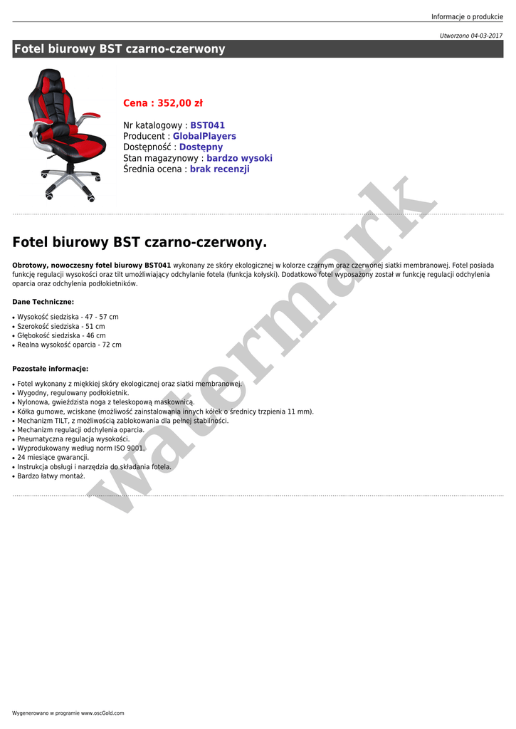 Informacje o produkcie Utworzono 04-03-2017 Fotel biurowy BST czarno-czerwony Cena : 352,00 zł er m ar k Nr katalogowy : BST041 Producent : GlobalPlayers Dostępność : Dostępny Stan magazynowy : bardzo wysoki Średnia ocena : brak recenzji Fotel biurowy BST czarno-czerwony. Obrotowy, nowoczesny fotel biurowy BST041 wykonany ze skóry ekologicznej w kolorze czarnym oraz czerwonej siatki membranowej. Fotel posiada funkcję regulacji wysokości oraz tilt umożliwiający odchylanie fotela (funkcja kołyski). Dodatkowo fotel wyposażony został w funkcję regulacji odchylenia oparcia oraz odchylenia podłokietników. Dane Techniczne: ● ● ● ● Wysokość siedziska - 47 - 57 cm Szerokość siedziska - 51 cm Głębokość siedziska - 46 cm Realna wysokość oparcia - 72 cm Pozostałe informacje: ● ● ● ● ● ● ● ● ● w ● Fotel wykonany z miękkiej skóry ekologicznej oraz siatki membranowej. Wygodny, regulowany podłokietnik. Nylonowa, gwieździsta noga z teleskopową maskownicą. Kółka gumowe, wciskane (możliwość zainstalowania innych kółek o średnicy trzpienia 11 mm). Mechanizm TILT, z możliwością zablokowania dla pełnej stabilności. Mechanizm regulacji odchylenia oparcia. Pneumatyczna regulacja wysokości. Wyprodukowany według norm ISO 9001. 24 miesiące gwarancji. Instrukcja obsługi i narzędzia do składania fotela. Bardzo łatwy montaż. at ● Wygenerowano w programie www.oscGold.com