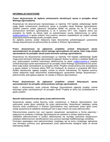 INFORMACJE DODATKOWE Prawo akcjonariusza do żądania umieszczenia określonych spraw w porządku obrad Walnego Zgromadzenia. Akcjonariusz lub akcjonariusze reprezentujący co najmniej 1/20 kapitału zakładowego Spółki mogą żądać umieszczenia określonych spraw w porządku obrad Walnego Zgromadzenia. Żądanie powinno zostać zgłoszone Zarządowi Spółki nie później niż na 21 dni przed wyznaczonym terminem zgromadzenia, tj. do 6 czerwca 2011 roku. Żądanie winno być przesłane do Spółki na piśmie bądź za pośrednictwem poczty elektronicznej na adres: [email protected] w języku polskim oraz powinno zawierać uzasadnienie lub projekt uchwały dotyczącej proponowanego punktu porządku obrad. Do żądania powinny zostać dołączone kopie dokumentów potwierdzających uprawnienie danego akcjonariusza lub pełnomocnika do udziału w Walnym Zgromadzeniu. Prawo akcjonariusza do zgłaszania projektów uchwał dotyczących spraw wprowadzonych do porządku obrad walnego zgromadzenia lub spraw, które mają zostać wprowadzone do porządku obrad przed terminem walnego zgromadzenia. Akcjonariusz lub akcjonariusze reprezentujący co najmniej 1/20 kapitału zakładowego Spółki mogą przed terminem Walnego Zgromadzenia zgłaszać Spółce na piśmie w siedzibie Spółki lub przy wykorzystaniu środków komunikacji elektronicznej na adres [email protected] projekty uchwał dotyczące spraw wprowadzonych do porządku obrad Walnego Zgromadzenia lub spraw, które mają zostać wprowadzone do porządku obrad. Projekty uchwał powinny być sporządzone w języku polskim w formacie plików PDF lub możliwych do otwarcia w programie MS Word. Spółka niezwłocznie ogłasza projekty uchwał na stronie internetowej. Do żądania powinny zostać dołączone kopie dokumentów potwierdzających uprawnienie danego akcjonariusza i pełnomocnika, jeśli zgłasza żądanie, do udziału w Walnym Zgromadzeniu. Prawo akcjonariusza do zgłaszania projektów uchwał dotyczących wprowadzonych do porządku obrad podczas walnego zgromadzenia. spraw Każdy z akcjonariuszy może podczas Walnego Zgromadzenia zgłaszać projekty uchwał dotyczące spraw wprowadzonych do porządku obrad. Projekty te winny być przedstawione w języku polskim. Sposób wykonywania prawa głosu przez pełnomocnika Akcjonariusz będący osobą fizyczną może uczestniczyć w Walnym Zgromadzeniu oraz wykonywać prawo głosu osobiście lub przez pełnomocnika. Akcjonariusz niebędący osobą fizyczną może uczestniczyć w Walnym Zgromadzeniu oraz wykonywać prawo głosu przez osobę uprawnioną do składania oświadczeń woli w jego imieniu lub przez pełnomocnika. Pełnomocnictwo powinno być, pod rygorem nieważności, sporządzone w formie pisemnej i dołączone do protokołu z Walnego Zgromadzenia lub udzielone w postaci elektronicznej. Udzielenie pełnomocnictwa w postaci elektronicznej nie wymaga opatrzenia bezpiecznym podpisem elektronicznym weryfikowanym przy pomocy ważnego kwalifikowanego certyfikatu. Formularz zawierający wzór pełnomocnictwa, znajdujący się na końcu niniejszego ogłoszenia oraz formularz pomocny przy głosowaniach przez pełnomocnika dostępne będą na stronie internetowej Spółki. O udzieleniu pełnomocnictwa w postaci elektronicznej należy zawiadomić Spółkę przy wykorzystaniu środków komunikacji elektronicznej w postaci informacji przesłanej pocztą elektroniczną na adres [email protected] dokładając wszelkich starań, aby możliwa była skuteczna weryfikacja ważności pełnomocnictwa. Informacja o udzieleniu pełnomocnictwa powinna zawierać dokładne oznaczenie pełnomocnika i mocodawcy (ze wskazaniem imienia, nazwiska, numeru PESEL, o ile został osobie nadany, adresu zameldowania lub zamieszkania, telefonu i adresu poczty elektronicznej, a w przypadku osób prawnych i innych jednostek organizacyjnych adresu siedziby, numeru i organu rejestrowego). Informacja o udzieleniu pełnomocnictwa powinna również zawierać jego zakres, tj. wskazywać liczbę akcji, z których wykonywane będzie prawo głosu oraz nazwę Spółki. Pełnomocnictwo elektroniczne powinno być sformułowane w odrębnym dokumencie podpisanym przez akcjonariusza lub osobę/osoby uprawnione do reprezentacji akcjonariusza, przesłanym w formie skanu jako załącznik w formacie PDF na adres email [email protected] Obligatoryjnie wraz z pełnomocnictwem elektronicznym należy przesłać dokumenty potwierdzające uprawnienie danego akcjonariusza do udziału w Walnym Zgromadzeniu, jak również dokumenty (aktualny odpis z właściwego rejestru) potwierdzające prawo osoby podpisującej pełnomocnictwo do reprezentowania akcjonariusza nie będącego osobą fizyczną. Spółka podejmie odpowiednie działania służące identyfikacji akcjonariusza i pełnomocnika w celu weryfikacji ważności pełnomocnictwa udzielonego w postaci elektronicznej. Weryfikacja ta polegać może w szczególności na zwrotnym pytaniu w formie elektronicznej lub telefonicznej skierowanym do akcjonariusza lub pełnomocnika w celu potwierdzenia faktu udzielenia pełnomocnictwa i jego zakresu. Spółka zastrzega, że w takim przypadku brak udzielenia odpowiedzi na pytania zadawane w trakcie weryfikacji traktowany będzie jako brak możliwości weryfikacji udzielonego pełnomocnictwa i stanowił będzie podstawę dla odmowy dopuszczenia pełnomocnika do udziału w Walnym Zgromadzeniu. Po przybyciu na Walne Zgromadzenie, a przed podpisaniem listy obecności pełnomocnik powinien okazać oryginał dokumentu tożsamości wymieniony w pełnomocnictwie celem potwierdzenia tożsamości pełnomocnika. Prawo do reprezentowania akcjonariusza niebędącego osobą fizyczną powinno wynikać z okazanego przy sporządzaniu listy obecności odpisu właściwego rejestru, ewentualnie ciągu pełnomocnictw. Osoba/osoby udzielające pełnomocnictwa w imieniu akcjonariusza niebędącego osobą fizyczną powinny być uwidocznione w aktualnym odpisie z właściwego 
