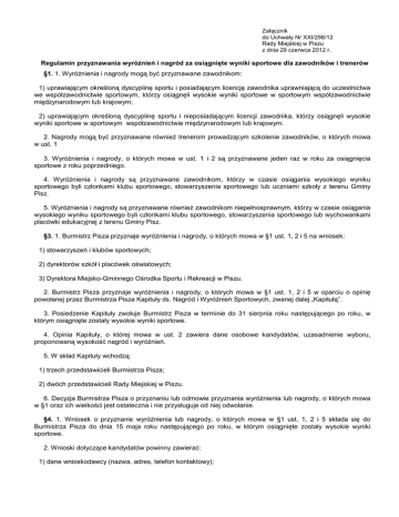Załącznik do Uchwały Nr XXI/298/12 Rady Miejskiej w Piszu z dnia 29 czerwca 2012 r. Regulamin przyznawania wyróżnień i nagród za osiągnięte wyniki sportowe dla zawodników i trenerów §1. 1. Wyróżnienia i nagrody mogą być przyznawane zawodnikom: 1) uprawiającym określoną dyscyplinę sportu i posiadającym licencję zawodnika uprawniającą do uczestnictwa we współzawodnictwie sportowym, którzy osiągnęli wysokie wyniki sportowe w sportowym współzawodnictwie międzynarodowym lub krajowym; 2) uprawiającym określoną dyscyplinę sportu i nieposiadającym licencji zawodnika, którzy osiągnęli wysokie wyniki sportowe w sportowym współzawodnictwie międzynarodowym lub krajowym. 2. Nagrody mogą być przyznawane również trenerom prowadzącym szkolenie zawodników, o których mowa w ust. 1 3. Wyróżnienia i nagrody, o których mowa w ust. 1 i 2 są przyznawane jeden raz w roku za osiągnięcia sportowe z roku poprzedniego. 4. Wyróżnienia i nagrody są przyznawane zawodnikom, którzy w czasie osiągania wysokiego wyniku sportowego byli członkami klubu sportowego, stowarzyszenia sportowego lub uczniami szkoły z terenu Gminy Pisz. 5. Wyróżnienia i nagrody są przyznawane również zawodnikom niepełnosprawnym, którzy w czasie osiągania wysokiego wyniku sportowego byli członkami klubu sportowego, stowarzyszenia sportowego lub wychowankami placówki edukacyjnej z terenu Gminy Pisz. §3. 1. Burmistrz Pisza przyznaje wyróżnienia i nagrody, o których mowa w §1 ust. 1, 2 i 5 na wniosek: 1) stowarzyszeń i klubów sportowych; 2) dyrektorów szkół i placówek oświatowych; 3) Dyrektora Miejsko-Gminnego Ośrodka Sportu i Rekreacji w Piszu. 2. Burmistrz Pisza przyznaje wyróżnienia i nagrody, o których mowa w §1 ust. 1, 2 i 5 w oparciu o opinię powołanej przez Burmistrza Pisza Kapituły ds. Nagród i Wyróżnień Sportowych, zwanej dalej „Kapitułą”. 3. Posiedzenie Kapituły zwołuje Burmistrz Pisza w terminie do 31 sierpnia roku następującego po roku, w którym osiągnięte zostały wysokie wyniki sportowe. 4. Opinia Kapituły, o której mowa w ust. 2 zawiera dane osobowe kandydatów, uzasadnienie wyboru, proponowaną wysokość nagród i wyróżnień. 5. W skład Kapituły wchodzą: 1) trzech przedstawicieli Burmistrza Pisza; 2) dwóch przedstawicieli Rady Miejskiej w Piszu. 6. Decyzja Burmistrza Pisza o przyznaniu lub odmowie przyznania wyróżnienia lub nagrody, o których mowa w §1 oraz ich wielkości jest ostateczna i nie przysługuje od niej odwołanie. §4. 1. Wniosek o przyznanie wyróżnienia lub nagrody, o których mowa w §1 ust. 1, 2 i 5 składa się do Burmistrza Pisza do dnia 15 maja roku następującego po roku, w którym osiągnięte zostały wysokie wyniki sportowe. 2. Wnioski dotyczące kandydatów powinny zawierać: 1) dane wnioskodawcy (nazwa, adres, telefon kontaktowy); 2) dane osobowe kandydata do nagrody lub wyróżnienia (imię i nazwisko, miejsce i data urodzenia, adres zamieszkania, nazwa klubu/stowarzyszenia, którego jest członkiem, lub szkoły(placówki edukacyjnej), której jest uczniem; 3) uzasadnienie wniosku wraz z informacją na temat osiągnięć, za które ma być przyznana nagroda lub wyróżnienie; 4) potwierdzone przez wnioskodawcę za zgodność z oryginałem kserokopie dokumentów potwierdzających osiągnięcia sportowe kandydata. 3. Wnioski niekompletne lub złożone po ustalonym terminie nie będą rozpatrywane. §5. 1. Nagrody, o których mowa w §1 ust. 1 i 5 są przyznawane zawodnikom, którzy w dniu osiągnięcia wysokiego wyniku sportowego mieli ukończone 14 lat. 2. Nagrody są przyznawane zawodnikom za wysokie wyniki sportowe polegające na: 1) zajęciu miejsc od I do V w igrzyskach olimpijskich; 2) zajęciu miejsc od I do V w mistrzostwach Europy lub mistrzostwach świata w dyscyplinach sportu i konkurencjach sportowych objętych programem igrzysk olimpijskich; 3) zajęciu miejsc od I do III w mistrzostwach Polski lub ogólnopolskiej olimpiadzie młodzieży w dyscyplinach sportu i konkurencjach sportowych objętych programem igrzysk olimpijskich; 4) zajęciu miejsc od I do III w mistrzostwach województwa lub wojewódzkiej olimpiadzie młodzieży w dyscyplinach sportu i konkurencjach sportowych objętych programem igrzysk olimpijskich; 5) zajęciu miejsc od I do V w igrzyskach paraolimpijskich; 6) zajęciu miejsc od I do III w olimpiadzie specjalnej na szczeblu ogólnopolskim; 7) zajęciu miejsc od I do III w olimpiadzie specjalnej na szczeblu regionalnym; 8) osiągnięciu wysokiego wyniku sportowego o niewymiernym charakterze np. zdobyciu trudnego szczytu górskiego lub zajęciu wysokiego miejsca w prestiżowej imprezie sportowej (niewymienionej w pkt. 1 - 6) lub uzyskaniu statusu członka kadry narodowej. §6. Ustala się następującą wysokość nagród: 1) za zajęcie miejsca, o którym mowa w §5 ust. 2 pkt 1 i 5 - nagrodę pieniężną lub rzeczową w wysokości od 1.000 zł do 5.000 zł; 2) za zajęcie miejsca, o którym mowa w §5 ust. 2 pkt 2 - nagrodę pieniężną lub rzeczową w wysokości od 1.000 zł do 3.000 zł; 3) za zajęcie miejsca, o którym mowa w §5 ust. 2 pkt 3 i 6: a) dla zawodników dyscyplin indywidualnych - nagrodę pieniężną lub rzeczową w wysokości od 500 zł do 1.000 zł; b) dla zawodników dyscyplin zespołowych - nagrodę pieniężną lub rzeczową w wysokości od 3.000 zł do 5.000 zł, przy czym nagrodę otrzymuje dany klub sportowy, stowarzyszenie sportowe lub szkoła, którą reprezentuje zespół, z przeznaczeniem dla zawodników, którzy osiągnęli nagrodzony wynik sportowy; 4) za zajęcie miejsca, o którym mowa w §5 ust. 2 pkt 4 i 7: a) dla zawodników dyscyplin indywidualnych - nagrodę pieniężną lub rzeczową w wysokości od 200 zł do 500 zł; b) dla zawodników dyscyplin zespołowych - nagrodę pieniężną lub rzeczową w wysokości od 2.000 zł do 3.000 zł, przy czym nagrodę otrzymuje dany klub sportowy, stowarzyszenie sportowe lub szko