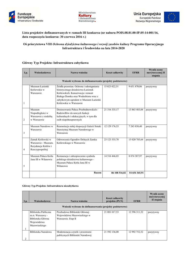 Lista projektów dofinansowanych w ramach III konkursu (nr naboru POIS.08.01.00-IP.05-14-001/16, data rozpoczęcia konkursu: 30 czerwca 2016 r.) Oś priorytetowa VIII Ochrona dziedzictwa kulturowego i rozwój zasobów kultury Programu Operacyjnego Infrastruktura i Środowisko na lata 2014-2020 Główny Typ Projektu: Infrastruktura zabytkowa Lp. Wnioskodawca Nazwa wniosku Koszt całkowity EFRR Wynik oceny merytorycznej II stopnia Wnioski wybrane do dofinansowania (projekty podstawowe) Muzeum Łazienki Królewskie w Warszawie Źródła przemian. Ochrona i udostępnienie historycznego dziedzictwa Łazienek Królewskich. Konserwacja i remont Białego Domku oraz Wodozbioru wraz z zabytkowym ogrodem w Muzeum Łazienki Królewskie w Warszawie 15 023 022,51 9 651 870,86 pozytywny Muzeum Niepodległości w Warszawie z siedzibą w Warszawie Dostosowanie Pałacu Przebednowskich / Radziwiłłów do nowych funkcji kulturalnych i edukacyjnych, w tym dla osób niepełnosprawnych 21 316 335,17 13 863 483,04 pozytywny Muzeum Narodowe w Warszawie Rearanżacja stałej ekspozycji Galerii Sztuki Starożytnej Muzeum Narodowego w Warszawie 12 129 176,53 7 243 838,40 pozytywny Zamek Królewski w Warszawie - Muzeum. Rezydencja Królów i Rzeczypospolitej Odtworzenie Ogrodów Dolnych Zamku Królewskiego w Warszawie 23 123 535,78 15 020 785,64 pozytywny Muzeum Pałacu Króla Jana III w Wilanowie Restauracja i zabezpieczenie symbolu polskiego dziedzictwa kulturowego Muzeum Pałacu Króla Jana III w Wilanowie 14 516 446,03 8 874 387,97 pozytywny 1 2 3 4 5 Razem 86 108 516,02 54 654 365,91 Główny Typ Projektu: Infrastruktura niezabytkowa Lp. Wnioskodawca Nazwa wniosku Koszt całkowity projektu (PLN) EFRR Wynik oceny merytorycznej II stopnia Wnioski wybrane do dofinansowania (projekty podstawowe) Biblioteka Publiczna m.st. Warszawy Biblioteka Główna Województwa Mazowieckiego Przebudowa Biblioteki Głównej Województwa Mazowieckiego w Warszawie. Etap II 21 001 017,53 12 596 311,52 pozytywny Biblioteka Narodowa Modernizacja czytelń i przestrzeni publicznych Biblioteki Narodowej 21 592 136,00 12 992 752,52 pozytywny 1 2 Uniwersytet Muzyczny Fryderyka Chopina Modernizacja i nowa aranżacja trzech kameralnych sal widowiskowych wraz z zapleczem w budynku Uniwersytetu Muzycznego Fryderyka Chopina w Warszawie 7 482 999,28 4 652 825,56 pozytywny 3 Razem 50 076 152,81 30 241 889,60 Główny Typ Projektu: Sprzęt i wyposażenie Lp. Miasto Stołeczne Warszawa Zakup sprzętu i wyposażenia w celu realizacji II etapu Wystawy Głównej Muzeum Warszawy oraz prowadzenia działalności kulturalnej w siedzibie przy Rynku Starego Miasta w Warszawie 7 084 862,99 4 640 983,25 Wynik oceny merytorycz nej II stopnia pozytywny Akademia Sztuk Pięknych w Warszawie Pogotowie konserwatorskie - mobilne laboratorium dla ochrony, konserwacji i zabezpieczenia dzieł sztuki i obiektów zabytkowych w architekturze 12 716 719,16 8 271 036,85 pozytywny Wnioskodawca Koszt całkowity projektu (PLN) Nazwa wniosku EFRR 1 2 Razem 19 801 582,15 12 912 020,10