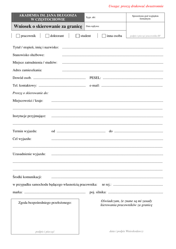Uwaga: proszę drukować dwustronnie AKADEMIA IM. JANA DŁUGOSZA W CZĘSTOCHOWIE Wniosek o skierowanie za granicę pracownik doktorant Sprawdzono pod względem formalnym: Sygn. akt: Data wpływu: student inna osoba podpis i pieczęć pracownika EF Tytuł / stopień, imię i nazwisko: .................................................................................................................. Stanowisko służbowe: .................................................................................................................. Miejsce zatrudnienia / studiów: .................................................................................................................. Adres zamieszkania: .................................................................................................................. Dowód osob. ........................................................... PESEL: .................................................................... Tel. kontaktowy: ..................................................... e-mail: ..................................................................... Proszę o skierowanie do: Miejscowości / kraje: .............................................................................................................................. ......................................................................................................................................................................... Instytucje przyjmujące: .............................................................................................................................. ......................................................................................................................................................................... Termin wyjazdu: od ....................................................... do ....................................................... Cel wyjazdu: .............................................................................................................................. ......................................................................................................................................................................... Uzasadnienie wyjazdu: .............................................................................................................................. ......................................................................................................................................................................... ......................................................................................................................................................................... Środki komunikacji: .............................................................................................................................. w przypadku samochodu będącego własnością pracownika: marka: ..................................................................... nr rej.: ........................................................ poj. silnika: .............................................................. Zgoda bezpośredniego przełożonego: Oświadczam, że znane są mi zasady kierowania pracowników za granicę podpis i pieczęć data i podpis Wnioskodawcy Kalkulacja kosztów wyjazdu – wartość szacunkowa w walucie .................... i złotych Rodzaj świadczenia Waluta PLN Źródło finansowania stypendium koszty podróży inne Razem: Podpisy i pieczęci osób uprawnionych do dysponowania środkami finansowymi / Zgoda Kierownika jedn. Kierownik projektu Kierownik jednostki – dysponent środków Potwierdzenie możliwości finansowania wyjazdu: ....................................................................................................... ....................................................................................................... ....................................................................................................... podpis i pieczęć Kwestora / Pełnomocnika Zgoda na wykorzystanie do podróży samochodu służbowego / niebędącego własnością Uczelni: długość trasy (tam i powrót): ......................... stawka: ......................... łączny koszt: ......................... podpis i pieczęć uprawnionego pracownika DZPiZ km Zgoda Rektora: zł/km zł podpis i pieczęć DECYZJA O SKIEROWANIU NA WYJAZD ZA GRANICĘ Wyrażam zgodę na skierowanie za granicę na warunkach określonych we wniosku i udzielam: płatnego urlopu szkoleniowego w terminie: od ........................................... do ........................................... urlopu bezpłatnego w terminie: data od ........................................... do ........................................... podpis i pieczęć Rektora