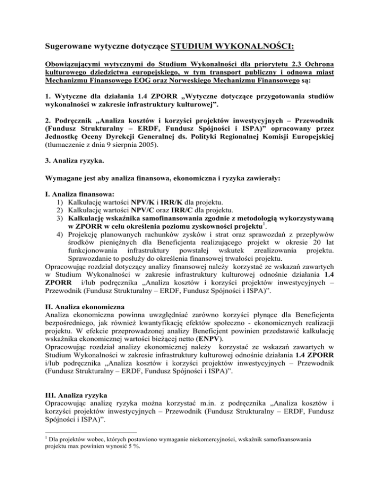 Sugerowane wytyczne dotyczące STUDIUM WYKONALNOŚCI: Obowiązującymi wytycznymi do Studium Wykonalności dla priorytetu 2.3 Ochrona kulturowego dziedzictwa europejskiego, w tym transport publiczny i odnowa miast Mechanizmu Finansowego EOG oraz Norweskiego Mechanizmu Finansowego są: 1. Wytyczne dla działania 1.4 ZPORR „Wytyczne dotyczące przygotowania studiów wykonalności w zakresie infrastruktury kulturowej”. 2. Podręcznik „Analiza kosztów i korzyści projektów inwestycyjnych – Przewodnik (Fundusz Strukturalny – ERDF, Fundusz Spójności i ISPA)” opracowany przez Jednostkę Oceny Dyrekcji Generalnej ds. Polityki Regionalnej Komisji Europejskiej (tłumaczenie z dnia 9 sierpnia 2005). 3. Analiza ryzyka. Wymagane jest aby analiza finansowa, ekonomiczna i ryzyka zawierały: I. Analiza finansowa: 1) Kalkulację wartości NPV/K i IRR/K dla projektu. 2) Kalkulację wartości NPV/C oraz IRR/C dla projektu. 3) Kalkulację wskaźnika samofinansowania zgodnie z metodologią wykorzystywaną w ZPORR w celu określenia poziomu zyskowności projektu1. 4) Projekcję planowanych rachunków zysków i strat oraz sprawozdań z przepływów środków pieniężnych dla Beneficjenta realizującego projekt w okresie 20 lat funkcjonowania infrastruktury powstałej wskutek zrealizowania projektu. Sprawozdanie to posłuży do określenia finansowej trwałości projektu. Opracowując rozdział dotyczący analizy finansowej należy korzystać ze wskazań zawartych w Studium Wykonalności w zakresie infrastruktury kulturowej odnośnie działania 1.4 ZPORR i/lub podręcznika „Analiza kosztów i korzyści projektów inwestycyjnych – Przewodnik (Fundusz Strukturalny – ERDF, Fundusz Spójności i ISPA)”. II. Analiza ekonomiczna Analiza ekonomiczna powinna uwzględniać zarówno korzyści płynące dla Beneficjenta bezpośredniego, jak również kwantyfikację efektów społeczno - ekonomicznych realizacji projektu. W efekcie przeprowadzonej analizy Beneficjent powinien przedstawić kalkulację wskaźnika ekonomicznej wartości bieżącej netto (ENPV). Opracowując rozdział analizy ekonomicznej należy korzystać ze wskazań zawartych w Studium Wykonalności w zakresie infrastruktury kulturowej odnośnie działania 1.4 ZPORR i/lub podręcznika „Analiza kosztów i korzyści projektów inwestycyjnych – Przewodnik (Fundusz Strukturalny – ERDF, Fundusz Spójności i ISPA)”. III. Analiza ryzyka Opracowując analizę ryzyka można korzystać m.in. z podręcznika „Analiza kosztów i korzyści projektów inwestycyjnych – Przewodnik (Fundusz Strukturalny – ERDF, Fundusz Spójności i ISPA)”. 1 Dla projektów wobec, których postawiono wymaganie niekomercyjności, wskaźnik samofinansowania projektu max powinien wynosić 5 %. Podsumowanie Wszelkie wyliczenia powinny być poparte odpowiednimi komentarzami objaśniającymi przyjęte założenia kalkulacyjne, a także wskazujące źródła (tabele, numery stron, nazwy podrozdziałów) zawierające wyliczenia pośrednie. Wskazane jest, aby w podsumowaniach rozdziałów analizy finansowej i ekonomicznej Beneficjent przedstawił i skomentował wyniki wymienionych analiz. Załączniki: 1. Bilans za ostatni rok (potwierdzony przez głównego księgowego lub biegłego rewidenta) zgodnie z przepisami o rachunkowości, w przypadku jednostek samorządu terytorialnego opinia składu orzekającego RIO o sprawozdaniu z wykonywania budżetu za rok poprzedni. 2. Rachunek zysków i strat. (jw.) 3. Sprawozdanie z przepływów pieniężnych (jw.) 4. W przypadku podmiotów nie zobowiązanych do sporządzania bilansu, rachunku zysków i strat, sprawozdania z przepływów pieniężnych2należy załączyć analogiczne dokumenty, potwierdzającą wiarygodność danych użytych do wyliczeń w analizie finansowej, ekonomicznej i ryzyka. 2 Jeżeli projekt będzie realizowany przez więcej niż jeden podmiot, każdy z nich zobowiązany jest załączyć bilans, rachunek zysków i strat, sprawozdanie z przepływów pieniężnych.