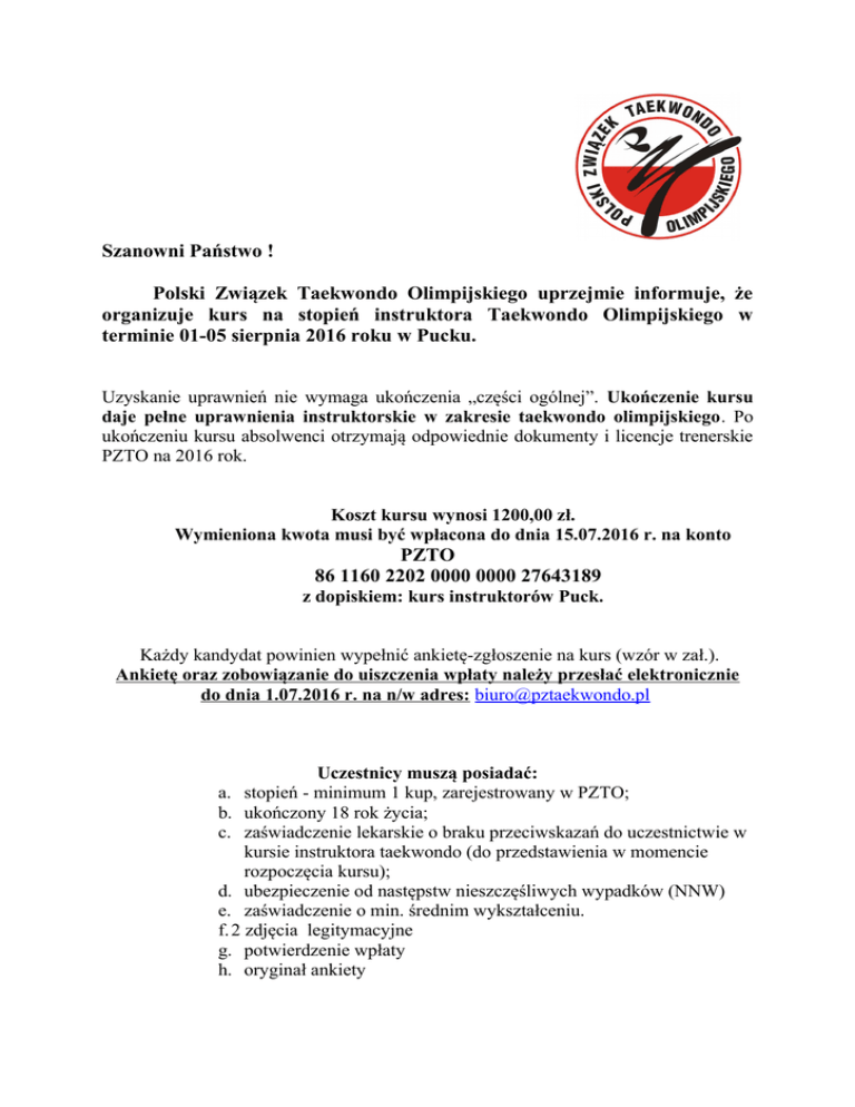Szanowni Państwo ! Polski Związek Taekwondo Olimpijskiego uprzejmie informuje, że organizuje kurs na stopień instruktora Taekwondo Olimpijskiego w terminie 01-05 sierpnia 2016 roku w Pucku. Uzyskanie uprawnień nie wymaga ukończenia „części ogólnej”. Ukończenie kursu daje pełne uprawnienia instruktorskie w zakresie taekwondo olimpijskiego. Po ukończeniu kursu absolwenci otrzymają odpowiednie dokumenty i licencje trenerskie PZTO na 2016 rok. Koszt kursu wynosi 1200,00 zł. Wymieniona kwota musi być wpłacona do dnia 15.07.2016 r. na konto PZTO 86 1160 2202 0000 0000 27643189 z dopiskiem: kurs instruktorów Puck. Każdy kandydat powinien wypełnić ankietę-zgłoszenie na kurs (wzór w zał.). Ankietę oraz zobowiązanie do uiszczenia wpłaty należy przesłać elektronicznie do dnia 1.07.2016 r. na n/w adres: [email protected] Uczestnicy muszą posiadać: a. stopień - minimum 1 kup, zarejestrowany w PZTO; b. ukończony 18 rok życia; c. zaświadczenie lekarskie o braku przeciwskazań do uczestnictwie w kursie instruktora taekwondo (do przedstawienia w momencie rozpoczęcia kursu); d. ubezpieczenie od następstw nieszczęśliwych wypadków (NNW) e. zaświadczenie o min. średnim wykształceniu. f. 2 zdjęcia legitymacyjne g. potwierdzenie wpłaty h. oryginał ankiety U W A G I: a) Informujemy, że przy przekroczeniu ilości miejsc o zakwalifikowaniu decydować będzie kolejność zgłoszeń. b) Informujemy, że PZTO nie pośredniczy w rezerwacji zakwaterowania i wyżywienia. c) Zaświadczenie o stanie zdrowia, oraz dokumenty NNW musza zostać przedstawione (pod groźbą niezakwalifikowania) w momencie rozpoczęcia kursu. d) Warunkiem przystąpienia do egzaminu będzie 100% obecność podczas zajęć szkoleniowych. e) Informacji organizacyjnych udziela biuro PZTO nr. tel. 22 840 45 57, nr tel. kom. 509 347 107, e-mai: [email protected] A N K I E T A KANDYDATA NA KURS Z G Ł O S Z E N I E INSTRUKTOR TAEKWONDO OLIMPIJSKIEGO 1. Imię i nazwisko kandydata ....................................................................................................... 2. Data i miejsce urodzenia .......................................................................................................... 3. Wykształcenie .......................................................................................................................... 4. Adres zamieszkania: ................................................................................................................ ……………………………………………………....................................................................... 5. Adres do korespondencji:…………………………………………………………………….. e-mail……………………………………………………….tel................................................... 6. Stopień …………………Nr. certyfikatu………………………Data uzyskania…................. 7. Posiadane uprawnienia przydatne w kulturze fizycznej i sporcie ............................................ …………………………………………………………………………………………………... ...................................................................... / data i podpis/ ZAŚWIADCZENIE LEKARZA SPORTOWEGO Na podstawie badań lekarskich zaświadczam, że ........................................................................ / imię i nazwisko/ może wykonywać zawód instruktora sportu ................................................................................ /dyscyplina/ i uczestniczyć w zajęciach na kursie instruktorskim. .............................................. / miejscowość, data/ ..................................................... /pieczątka i podpis/ OŚWIADCZENIE Ja niżej podpisana(y), oświadczam, że zapoznałam(em) się i zobowiązuję sięę do przestrzegania statutu i regulaminów Polskiego Związku Taekwondo Olimpijskiego z siedzibą w Warszawie (dalej jako „PZTO”). Oświadczam, że poddam sięę odpowiedzialności dyscyplinarnej. Poświadczam zgodność́ podanych we wniosku danych. Wyrażam zgodęę na przetwarzanie moich danych osobowych zawartych we wniosku przez Polski Związek Taekwondo Olimpijskiego z siedzibą w Warszawie (zgodnie z Ustawą z dnia 29 sierpnia 1997 roku o ochronie danych osobowych). Przyjmuję do wiadomości, że: - podanie danych jest dobrowolne, bezterminowe i może zostać odwołane w każdym czasie przy zachowaniu formy pisemnej, - administratorem danych osobowych jest PZTO (adres siedziby: ul. Nowowiejska 5/44, 00643 Warszawa), - mam prawo dostępu do treści moich danych, informacji o źródle ich dostarczenia oraz ich poprawiania, modyfikacji, uaktualniania, uzupełnienia, usunięcia i zaprzestania ich przetwarzania; - PZTO gromadzi i przetwarza dane osobowe w celu umożliwienia: - uczestnictwa we współzawodnictwie sportowym w taekwondo olimpijskim w kraju i za granicą, - prowadzenia treningów taekwondo olimpijskiego, - sędziowania na zawodach w taekwondo olimpijskim, - nadawania stopni uczniowskich i mistrzowskich w taekwondo olimpijskim, - uczestniczenia w szkoleniach, zgrupowaniach i innych wydarzeniach organizowanych przez PZTO, - wypełnianiu obowiązków prawnych i administracyjnych związanych z funkcjonowaniem PZTO. Upoważniam PZTO do przekazywania moich danych osobowych do Światowej Federacji Taekwondo (WTF), Europejskiej Unii Taekwondo (ETU) i organizatorów zawodów w taekwondo w celu wyrobienia stopni, certyfikatów, licencji zawodniczych/trenerskich/sędziowskich oraz mojej rejestracji w zawodach/szkoleniach i innych wydarzeniach taekwondo. ……………………. (czytelny podpis składającego oświadczenie)