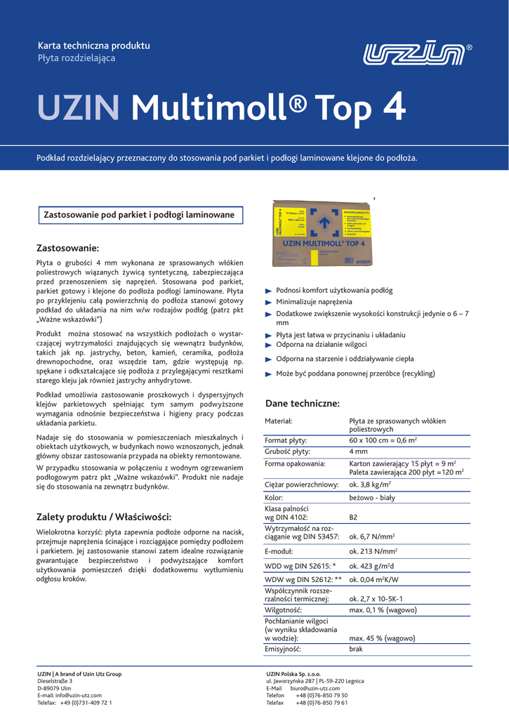 Karta techniczna produktu Płyta rozdzielająca UZIN Multimoll® Top 4 Podkład rozdzielający przeznaczony do stosowania pod parkiet i podłogi laminowane klejone do podłoża. Zastosowanie pod parkiet i podłogi laminowane Zastosowanie: Płyta o grubości 4 mm wykonana ze sprasowanych włókien poliestrowych wiązanych żywicą syntetyczną, zabezpieczająca przed przenoszeniem się naprężeń. Stosowana pod parkiet, parkiet gotowy i klejone do podłoża podłogi laminowane. Płyta po przyklejeniu całą powierzchnią do podłoża stanowi gotowy podkład do układania na nim w/w rodzajów podłóg (patrz pkt „Ważne wskazówki”) Produkt można stosować na wszystkich podłożach o wystarczającej wytrzymałości znajdujących się wewnątrz budynków, takich jak np. jastrychy, beton, kamień, ceramika, podłoża drewnopochodne, oraz wszędzie tam, gdzie występują np. spękane i odkształcające się podłoża z przylegającymi resztkami starego kleju jak również jastrychy anhydrytowe. Podkład umożliwia zastosowanie proszkowych i dyspersyjnych klejów parkietowych spełniając tym samym podwyższone wymagania odnośnie bezpieczeństwa i higieny pracy podczas układania parkietu. Nadaje się do stosowania w pomieszczeniach mieszkalnych i obiektach użytkowych, w budynkach nowo wznoszonych, jednak główny obszar zastosowania przypada na obiekty remontowane. W przypadku stosowania w połączeniu z wodnym ogrzewaniem podłogowym patrz pkt „Ważne wskazówki”. Produkt nie nadaje się do stosowania na zewnątrz budynków. Zalety produktu / W³aœciwoœci: Wielokrotna korzyść: płyta zapewnia podłoże odporne na nacisk, przejmuje naprężenia ścinające i rozciągające pomiędzy podłożem i parkietem. Jej zastosowanie stanowi zatem idealne rozwiązanie gwarantujące bezpieczeństwo i podwyższające komfort użytkowania pomieszczeń dzięki dodatkowemu wytłumieniu odgłosu kroków. UZIN | A brand of Uzin Utz Group Dieselstraße 3 D-89079 Ulm E-mail: [email protected] Telefax: +49 (0)731-409 72 1 ÷ Podnosi komfort użytkowania podłóg ÷ Minimalizuje naprężenia ÷ Dodatkowe zwiększenie wysokości konstrukcji jedynie o 6 – 7 mm ÷ ÷ Płyta jest łatwa w przycinaniu i układaniu Odporna na działanie wilgoci ÷ Odporna na starzenie i oddziaływanie ciepła ÷ Może być poddana ponownej przeróbce (recykling) Dane techniczne: Materiał: Format płyty: Grubość płyty: Płyta ze sprasowanych włókien poliestrowych 60 x 100 cm = 0,6 m2 4 mm Forma opakowania: Karton zawierający 15 płyt = 9 m2 Paleta zawierająca 200 płyt =120 m2 Ciężar powierzchniowy: ok. 3,8 kg/m2 Kolor: Klasa palności wg DIN 4102: Wytrzymałość na rozciąganie wg DIN 53457: beżowo - biały E-moduł: ok. 213 N/mm2 WDD wg DIN 52615: * ok. 423 g/m2d WDW wg DIN 52612: ** Współczynnik rozszerzalności termicznej: Wilgotność: Pochłanianie wilgoci (w wyniku składowania w wodzie): Emisyjność: ok. 0,04 m2K/W B2 ok. 6,7 N/mm2 ok. 2,7 x 10-5K-1 max. 0,1 % (wagowo) max. 45 % (wagowo) brak UZIN Polska Sp. z.o.o. ul. Jaworzyńska 287 | PL-59-220 Legnica E-Mail [email protected] Telefon +48 (0)76-850 79 50 Telefax +48 (0)76-850 79 61 UZIN Multimoll® Top 4 Kleje/Zu¿ycie: Przygotowanie Podłoża: Podłoże musi być równe, mocne i stabilne, bez spękań, suche, czyste i wolne od substancji mogących zmniejszać przyczepność. Podłoże należy sprawdzić w oparciu o obowiązujące normy i odpowiednie instrukcje. W razie stwierdzenia odchyleń należy zgłosić zastrzeżenia. Nierówne podłoże należy w odpowiedni sposób mechanicznie oczyścić, odkurzyć, zagruntować, a następnie wyszpachlować za pomocą masy pod parkiet UZIN NC 174. Zalecane środki gruntujące firmy UZIN: jastrych cementowy, beton, lastriko jastrych anhydrytowy/siarczanowo wapniowy jastrych magnezjowy/wiórobeton jastrych asfaltowy, nie opiaskowany resztki kleju odporne na działanie wody resztki kleju wrażliwe na działanie wody zbyt wilgotny jastrych cementowy beton wzmocnienie zwietrzałych powierzchni UZIN PE 60 UZIN PE 240 UZIN PE 260 UZIN PE 260 UZIN PE 260 UZIN PE 460 UZIN PE 460 UZIN PE 460 D D D D D RE RE RE Podłoża zagruntowane dwuskładnikowym środkiem gruntującym UZIN PE 460 należy posypać piaskiem kwarcowym UZIN Perlsand 0,8. Preparat gruntujący oraz masę szpachlową należy zawsze pozostawić do całkowitego wyschnięcia. Jeżeli podłoże jest wystarczająco równe należy je w odpowiedni sposób mechanicznie oczyścić, odkurzyć i zagruntować. Obróbka: 1. Poszczególne płyty należy rozłożyć luźno na podłodze, a następnie docinać używając do tego noża z trapezowym ostrzem, ręcznej piły o drobnym uzębieniu lub piły tarczowej (Ø 150 mm, 48 zębów z utwardzonego metalu lub 60 zębów chromowanych). Łączenia płyt z poszczególnych rzędów przesunąć o tzw. mijankę. W przypadku podłoży mineralnych zachować ok. 5 milimetrowy odstęp od ścian, w przypadku podłóg drewnianych odstęp musi wynosić ok. 15 mm. Do przyklejania płyt UZIN-Multimoll® Top 4 nadają się następujące kleje: UZIN-MK 92S: dwuskładnikowy klej poliuretanowy rozprowadzany przy użyciu szpachli o uzębieniu B3 (ok. 1 kg/ m2) na równym podłożu wzgl. uzębieniu 23/48 (ok. 1,2 kg/m2) na powierzchniach chropowatych. (Możliwość wchodzenia po upływie ok. 12 godzin, gotowość do układania po 24 godzinach). UZIN-MK 80 S: dyspersyjny klej do parkietu rozprowadzany przy użyciu szpachli o uzębieniu B3 (ok. 700 g/m2) na wystarczająco równych i szpachlowanych podłożach. (Możliwość wchodzenia i gotowość do układania po ok. 24 godzinach). UZIN Power Flex Turbo: szybkowiążąca zaprawa klejąca na bazie cementu rozprowadzana przy użyciu szpachli o uzębieniu C1 (ok. 1,5 kg/m2) na równych podłożach lub C2 (ok. 3 kg/ m2) na podłożach chropowatych. (Możliwość wchodzenia po upływie ok. 2 godzin, gotowość do układania po 24 godzinach). Wa¿ne wskazówki: ÷ Przy przechowywaniu w suchym
