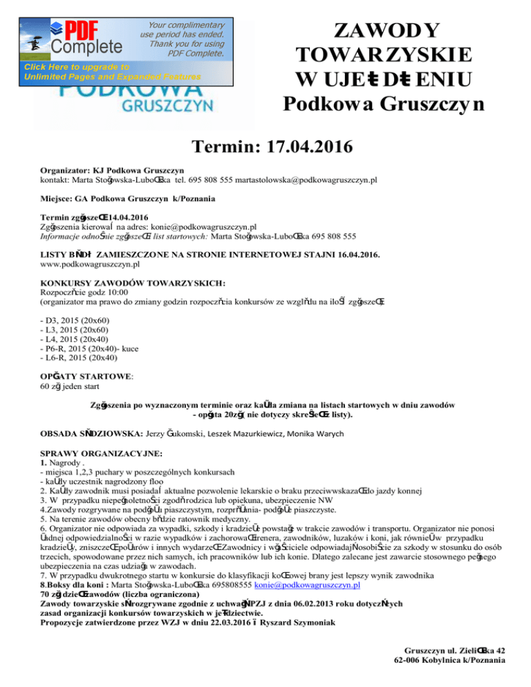 ZAWODY TOWARZYSKIE W UJEŻDŻENIU Podkowa Gruszczy n Termin: 17.04.2016 Organizator: KJ Podkowa Gruszczyn kontakt: Marta Stołowska-Lubońska tel. 695 808 555 [email protected] Miejsce: GA Podkowa Gruszczyn k/Poznania Termin zgłoszeń: 14.04.2016 Zgłoszenia kierować na adres: [email protected] Informacje odnośnie zgłoszeń i list startowych: Marta Stołowska-Lubońska 695 808 555 LISTY BĘDĄ ZAMIESZCZONE NA STRONIE INTERNETOWEJ STAJNI 16.04.2016. www.podkowagruszczyn.pl KONKURSY ZAWODÓW TOWARZYSKICH: Rozpoczęcie godz 10:00 (organizator ma prawo do zmiany godzin rozpoczęcia konkursów ze względu na ilość zgłoszeń) - D3, 2015 (20x60) - L3, 2015 (20x60) - L4, 2015 (20x40) - P6-R, 2015 (20x40)- kuce - L6-R, 2015 (20x40) OPŁATY STARTOWE: 60 zł/ jeden start Zgłoszenia po wyznaczonym terminie oraz każda zmiana na listach startowych w dniu zawodów - opłata 20zł ( nie dotyczy skreśleń z listy). OBSADA SĘDZIOWSKA: Jerzy Łukomski, Leszek Mazurkiewicz, Monika Warych SPRAWY ORGANIZACYJNE: 1. Nagrody . - miejsca 1,2,3 puchary w poszczególnych konkursach - każdy uczestnik nagrodzony floo 2. Każdy zawodnik musi posiadać aktualne pozwolenie lekarskie o braku przeciwwskazań do jazdy konnej 3. W przypadku niepełnoletności zgodę rodzica lub opiekuna, ubezpieczenie NW 4.Zawody rozgrywane na podłożu piaszczystym, rozprężania- podłoże piaszczyste. 5. Na terenie zawodów obecny będzie ratownik medyczny. 6. Organizator nie odpowiada za wypadki, szkody i kradzieże powstałe w trakcie zawodów i transportu. Organizator nie ponosi żadnej odpowiedzialności w razie wypadków i zachorowań trenera, zawodników, luzaków i koni, jak również w przypadku kradzieży, zniszczeń, pożarów i innych wydarzeń. Zawodnicy i właściciele odpowiadają osobiście za szkody w stosunku do osób trzecich, spowodowane przez nich samych, ich pracowników lub ich konie. Dlatego zalecane jest zawarcie stosownego pełnego ubezpieczenia na czas udziału w zawodach. 7. W przypadku dwukrotnego startu w konkursie do klasyfikacji końcowej brany jest lepszy wynik zawodnika 8.Boksy dla koni : Marta Stołowska-Lubońska 695808555 [email protected] 70 zł/ dzień zawodów (liczba ograniczona) Zawody towarzyskie są rozgrywane zgodnie z uchwałą PZJ z dnia 06.02.2013 roku dotyczących zasad organizacji konkursów towarzyskich w jeździectwie. Propozycje zatwierdzone przez WZJ w dniu 22.03.2016 – Ryszard Szymoniak Gruszczyn ul. Zielińska 42 62-006 Kobylnica k/Poznania