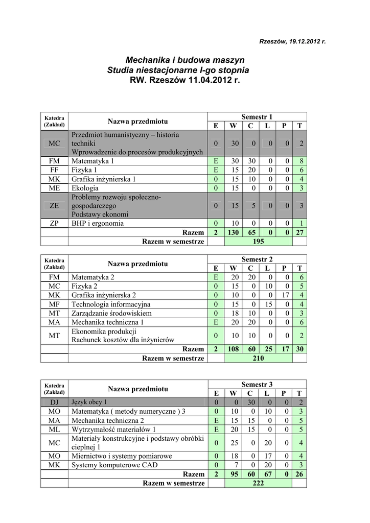 Rzeszów, 19.12.2012 r. Mechanika i budowa maszyn Studia niestacjonarne I-go stopnia RW. Rzeszów 11.04.2012 r. Katedra (Zakład) MC FM FF MK ME ZE ZP Nazwa przedmiotu Przedmiot humanistyczny – historia techniki Wprowadzenie do procesów produkcyjnych Matematyka 1 Fizyka 1 Grafika inżynierska 1 Ekologia Problemy rozwoju społecznogospodarczego Podstawy ekonomi BHP i ergonomia Razem Razem w semestrze Katedra (Zakład) FM MC MK MF MT MA MT Nazwa przedmiotu Matematyka 2 Fizyka 2 Grafika inżynierska 2 Technologia informacyjna Zarządzanie środowiskiem Mechanika techniczna 1 Ekonomika produkcji Rachunek kosztów dla inżynierów Razem Razem w semestrze Katedra (Zakład) DJ MO MA ML MC MO MK Nazwa przedmiotu Język obcy 1 Matematyka ( metody numeryczne ) 3 Mechanika techniczna 2 Wytrzymałość materiałów 1 Materiały konstrukcyjne i podstawy obróbki cieplnej 1 Miernictwo i systemy pomiarowe Systemy komputerowe CAD Razem Razem w semestrze Semestr 1 C L E W 0 30 0 0 0 2 E E 0 0 30 15 15 15 30 20 10 0 0 0 0 0 0 0 0 0 8 6 4 3 0 15 5 0 0 3 0 2 10 130 E E 0 0 0 0 E W 20 15 10 15 18 20 0 10 2 108 E 0 0 E E W 0 10 15 20 0 25 0 0 2 18 7 95 0 0 65 0 195 Semestr 2 C L 20 0 0 10 0 0 0 15 10 0 20 0 10 0 60 25 210 Semestr 3 C L 30 0 0 10 15 0 15 0 0 20 0 17 0 20 60 67 222 P T 0 1 0 27 P 0 0 17 0 0 0 T 6 5 4 4 3 6 0 2 17 30 P 0 0 0 0 T 2 3 5 5 0 4 0 4 0 3 0 26 Katedra (Zakład) DJ Nazwa przedmiotu Język obcy 2 MK MP MG ML ED Materiały konstrukcyjne i podstawy obróbki cieplnej 2 Podstawy konstrukcji maszyn 1 Przetwórstwo tworzyw sztucznych Odlewnictwo i spawalnictwo Wytrzymałość materiałów 2 Podstawy elektrotechniki i elektroniki Razem Razem w semestrze Katedra (Zakład) Nazwa przedmiotu MC DJ MK MI/MA MD MO MP Język obcy 3 Podstawy konstrukcji maszyn 2 Podstawy automatyki i robotyki Termodynamika techniczna Obróbka skrawaniem i narzędzia Przeróbka plastyczna Razem Razem w semestrze E 0 Semestr 4 W C L 0 30 0 E 22 E 0 0 E 0 3 25 9 17 15 20 108 E 0 E 0 E E 0 3 W 0 22 17 15 18 9 81 P 0 T 2 20 0 5 0 0 0 9 0 18 15 3 0 10 45 60 233 20 0 0 0 Semestr 5 C L 30 0 0 5 9 10 10 15 0 17 0 9 49 56 210 5 2 4 6 0 3 20 27 P T 0 2 15 6 0 5 0 5 0 4 9 3 24 25 Specjalność: Alternatywne źródła i przetwarzanie energii Katedra (Zakład) DJ MB MT MO MD MD MB Nazwa przedmiotu Język obcy 4 Mechanika płynów Podstawy technologii maszyn Napęd i sterowanie maszyn Wymiana ciepła Urządzenia energetyczne Dynamika gazów Praktyka przemysłowa Razem Razem w semestrze E E 0 0 0 E E 0 W 0 10 14 14 20 20 10 3 88 Semestr 6 C L 30 0 9 8 0 7 0 7 10 10 6 10 4 10 4 tygodnie 59 52 203 P 0 0 0 0 0 4 0 4 T 3 3 3 3 5 5 4 2 28 Katedra (Zakład) Nazwa przedmiotu MO MD MB Maszyny technologiczne Energia słoneczna i cieplna biosfery Energetyka wód i atmosfery Energia biomasy i ekologiczne techniki spalania Poszanowanie energii Ogrzewnictwo i wentylacja Razem Razem w semestrze MD MD MD Katedra (Zakład) ZH MT MD MD Nazwa przedmiotu Przedmiot humanistyczny (etyka zawodowa) Ochrona własności intelektualnej Seminarium dyplomowe Praca dyplomowa Semestr 7 C L 0 7 10 14 4 9 E 0 E E W 14 28 18 P 0 6 6 T 3 6 5 E 22 10 16 0 6 0 0 3 12 10 104 0 18 0 0 24 64 212 0 8 20 3 2 25 E Semestr 8 W C L P T 0 30 0 0 0 1 0 0 0 10 0 0 40 0 0 0 0 0 0 0 0 0 15 0 15 1 5 15 22 Razem Razem w semestrze 55 Specjalność: Inżynieria odlewnictwa Katedra (Zakład) Nazwa przedmiotu DJ MB MT MO MG Język obcy 4 Mechanika płynów Podstawy technologii maszyn Napęd i sterowanie maszyn Stopy odlewnicze MG Krystalizacja stopów Technologia topienia Technologia form Praktyka przemysłowa MG MG E E 0 0 0 0 W 0 10 14 14 15 0 E E 15 15 15 Semestr 6 C L 30 0 9 8 0 7 0 7 0 10 P 0 0 0 0 0 0 15 0 0 15 0 0 10 10 4 tygodnie T 3 3 3 3 3 4 4 3 2 Razem Razem w semestrze Katedra (Zakład) MO MG MG 3 98 E 0 0 W 14 15 E 0 E 15 15 0 15 5 0 0 0 4 5 15 0 15 15 5 0 2 15 89 0 30 15 77 196 E Semestr 8 W C L P 0 30 0 0 0 0 0 10 0 0 40 0 0 0 0 55 0 0 0 0 Nazwa przedmiotu Maszyny technologiczne Tworzywa na formy odlewnicze Metody odlewania MG MK Maszyny i urządzenia odlewnicze Metody szybkiego prototypowania w odlewnictwie MG Badania odlewów Razem Razem w semestrze Katedra (Zakład) ZH MT MG MG Nazwa przedmiotu Przedmiot humanistyczny (etyka zawodowa) Ochrona własności intelektualnej Seminarium dyplomowe Praca dyplomowa Razem Razem w semestrze 39 72 219 10 Semestr 7 C L P 0 7 0 0 20 0 28 T 3 4 0 4 15 25 0 T 1 0 1 15 5 0 15 15 22 Specjalność: Inżynieria spawalnictwa Katedra (Zakład) Nazwa przedmiotu DJ MB MT MO MG Język obcy 4 Mechanika płynów Podstawy technologii maszyn Napęd i sterowanie maszyn Technologie spawalnicze MK MG Projektowanie konstrukcji spawanych Metalurgia procesów spawalniczych Praktyka przemysłowa Razem Razem w semestrze Katedra (Zakład) Nazwa przedmiotu Semestr 6 C L P 30 0 0 9 8 0 0 7 0 0 7 0 0 20 0 0 0 30 0 20 0 4 tygodnie 39 62 30 214 E E 0 0 0 E 0 E W 0 10 14 14 15 15 15 T 3 3 3 3 4 5 5 2 28 3 83 Semestr 7 W C L 14 0 7 15 0 15 P 0 0 T 3 4 MO EE Maszyny technologiczne Urządzenia i osprzęt spawalniczy E 0 0 MG Naprężenia i odkształcenia spawalnicze E 15 0 15 0 5 MG Obróbka cieplna złączy spawanych 0 15 0 15 0 4 MG Badania nieniszczące złączy spawanych E 15 0 MG Badania niszczące złączy spawanych MG Zapewnienie jakości w spawalnictwie Razem Razem w semestrze 0 0 2 15 20 109 0 10 0 0 0 92 201 Katedra (Zakład) ZH MT MG MG Nazwa przedmiotu Przedmiot humanistyczny (etyka zawodowa) Ochrona własności intelektualnej Seminarium dyplomowe Praca dyplomowa 30 4 0 3 0 2 0 25 Semestr 8 C L P E W 0 30 0 0 0 0 0 10 0 0 40 0 0 0 0 55 0 0 0 0 Razem Razem w semestrze 0 T 0 1 0 1 15 5 0 15 15 22 Specjalność: Komputerowo wspomagane wytwarzanie Katedra (Zakład) DJ MB MK MO MO MO/MT MT MF Katedra (Zakład) MO MO MO MT MT Nazwa przedmiotu Język obcy 4 Mechanika płynów Podstawy technologii maszyn Napęd i sterowanie maszyn Podstawy MES Systemy CAM Przygotowanie i organizacja produkcji Modelowanie procesów produkcyjnych Praktyka przemysłowa Razem Razem
