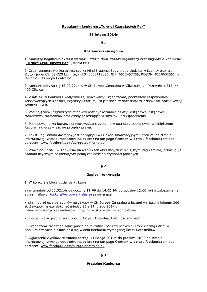 Regulamin konkursu „Turniej Czarujących Par” 16 lutego 2014r §1 Postanowienia ogólne 1. Niniejszy Regulamin określa warunki uczestnictwa, zasady organizacji oraz nagrody w konkursie „Turniej Czarujących Par” („Konkurs”). 2. Organizatorem Konkursu jest spółka Mind Progress Sp. z o.o. z siedzibą w Legnicy przy ul. Złotoryjskiej 69, 59-220 Legnica, (KRS: 0000419896, NIP: 6912497789, REGON: 021863259) na zlecenie CH Europa Centralna. 3. Konkurs odbywa się 16.02.2014 r. w CH Europa Centralna w Gliwicach, ul. Pszczyńska 315, 44400 Gliwice. 4. Z udziału w Konkursie wyłączeni są: pracownicy Organizatora, podmiotów bezpośrednio współtworzących Konkurs, najemcy Centrum, ich pracownicy oraz najbliżsi członkowie rodzin wyżej wymienionych. 5. Pod pojęciem „najbliższych członków rodziny” rozumieć należy: wstępnych, zstępnych, rodzeństwo, małżonków oraz osoby pozostające w stosunku przysposobienia. 6. Postępowanie konkursowe przeprowadzane zostanie w oparciu o postanowienia niniejszego Regulaminu oraz właściwe przepisy prawa. 7. Tekst Regulaminu dostępny jest do wglądu w Punkcie Informacyjnym Centrum, na stronie internetowej: www.europacentralna.eu oraz na fan page Centrum w portalu facebook.com pod adresem: www.facebook.com/europa.centralna.eu 8. Prawo do udziału w Konkursie na warunkach określonych w niniejszym Regulaminie, przysługuje osobom fizycznym posiadającym pełną zdolność do czynności prawnych. §2 Zapisy i rekrutacja 1. W konkursie biorą udział pary, które: a) w terminie od 11.02.14r od godziny 11:00 do 14.02.14r do godziny 12:00 wyślą zgłoszenie na adres mailowy: [email protected] zawierające: - skan lub zdjęcie paragonów na zakupy w CH Europa Centralna o łącznej wartości minimum 200 zł. Zakupów należy dokonać między 10 a 14 lutego 2014r. - dane zgłaszanych zawodników: imię, nazwisko, wiek i nr kontaktowy 2. Liczba miejsc jest ograniczona do 12 par. Decyduje kolejność zgłoszeń. 3. Organizator zastrzega sobie prawo do rekrutacji par rezerwowych, które wezmą udział w Konkursie w razie niestawienia się w dniu Konkursu wymaganej liczby uczestników. 3. Ogłoszenie wyników rekrutacji nastąpi 14 lutego 2014r. do godziny 14:00 na stronie internetowej: www.europacentralna.eu oraz na fan page Centrum w portalu facebook.com pod adresem: www.facebook.com/europa.centralna.eu. §3 Przebieg Konkursu 1. Wszystkie 12 par zakwalifikowanych do Konkursu ma obowiązek stawić się 16 lutego o godzinie 11:00 w CH Europa Centralna i zgłosić się do przedstawiciela Organizatora. Konkurs odbywa się w godzinach 12:00 – 19:00 na scenie w CH Europa Centralna w pobliżu sklepu Douglas. Każda z par ma obowiązek przedstawić Organizatorowi oryginały paragonów, o których mowa w § 2, Pkt.1a) 2. Każda z par przystępując do Konkursu ma już opracowaną swoją maksymalnie 3 minutową prezentację, którą przedstawi podczas Konkursu. W ramach prezentacji można się przebierać, śpiewać, tańczyć, wykonywać skecze, odtwarzać podkład muzyczny itp. W prezentacji mogą brać także udział rodzina i znajomi. 3. Konkurs rozgrywany jest na scenie w CH Europa Centralna przy wejściu B w systemie pucharowym i składa się z trzech rund, w których biorą udział odpowiednio: I runda – wszystkie 12 par Prezentacja 12 par uzupełniona wywiadami prowadzonymi przez prowadzącego Krzysztofa Ibisza II runda – 6 par wyłonionych przez jury Upinanie „sukni niespodzianki” na partnerce Konkurs “Było czy nie było” Dmuchanie Balonów III runda – 3 pary wyłonione przez jury Wiązanie Krawatów. Konkurs taneczny - walc, rock and roll, ABBA Konkurs Proste Pytania Uwaga – organizator zastrzega sobie prawo do przeprowadzenia konkursów dodatkowych. §4 Jury 1. Rywalizację par oceniać będzie trzyosobowe jury ustanowione przez Organizatora. 2. Od werdyktu jury nie ma odwołania. §5 Nagrody 1. Nagrodami w konkursie są: I miejsce – Wakacje Marzeń – bon o wartości 7200 zł do wykorzystania w biurze podróży Neckermann, ważny do końca 2014r. II Miejsce – Pakiet dla Zakochanych – bony o łącznej wartości 2000 zł do wykorzystania w wybranych sklepach CH Europa Centralna (Saturn 500zł, AlpenPark 250zł, Cozy Shoes 500zł, Home&U 250zł, Dalia 250zł i Yes 250zł) III Miejsce – Voucher do Victoria Day Spa o wartości 1000 zł §6 Wydanie nagród 1. Wydanie nagród nastąpi po zakończeniu „Turnieju Czarujących Par” 16.02.2014 r. w siedzibie Centrum Handlowego „Europa Centralna” w Gliwicach przy ul. Pszczyńskiej 315, 44-100 Gliwice. 2. Warunkiem odbioru nagrody jest osobiste stawiennictwo i okazanie stosownego dokumentu potwierdzającego tożsamość Zwycięzcy. W przypadku nieodebrania nagrody w ww. dniu – nagroda przechodzi na własność Organizatora. 3. Zwycięzcy nie mogą domagać się wymiany nagrody na inną nagrodę rzeczową lub na stanowiące jej ekwiwalent świadczenie pieniężne. 6. Nagrody w ramach niniejszego Konkursu, zostaną przekazane Zwycięzcom zgodnie z przepisami ustawy z dnia 26 lipca 1991 r. o podatku dochodowym od osób fizycznych (j. t.: Dz.U. z 1993r. Nr 90, poz. 416 z późn. zm.). §7 Postępowanie reklamacyjne 1. Każdemu Uczestnikowi Konkursu przysługuje prawo wniesienia pisemnej reklamacji nie później jednak niż do dnia 28.02.2014 roku. Reklamacje wniesione po upływie powyższego terminu nie będą rozpatrywane. 2. Reklamacje mogą być zgłaszane tylko i wyłącznie na piśmie do siedziby Organizatora się pod adresem: /mind progress/ group, ul. Tęczowa 7 | 53-601 Wrocław, z dopiskiem „Turniej Czarujących Par”, bądź też listem poleconym (w takim przypadku decyduje data stempla pocztowego). 3. Reklamacje zgłoszone drogą ustną, pocztą elektroniczną itp. nie będą rozpatrywane. 4. Reklamacja winna zawierać dokładne dane reklamującego, przyczynę reklamacji oraz żądanie jakiego domaga się reklamujący. 5. Osoba wnosząca reklamację z