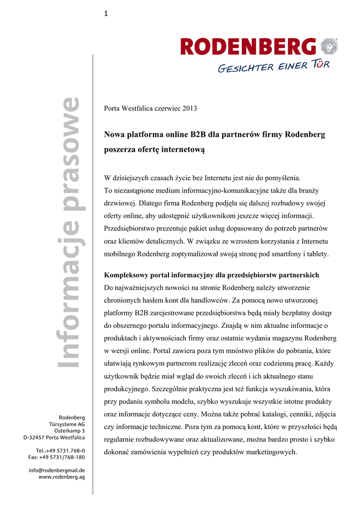 1 Porta Westfalica czerwiec 2013 Nowa platforma online B2B dla partnerów firmy Rodenberg poszerza ofertę internetową W dzisiejszych czasach życie bez Internetu jest nie do pomyślenia. To niezastąpione medium informacyjno-komunikacyjne także dla branży drzwiowej. Dlatego firma Rodenberg podjęła się dalszej rozbudowy swojej oferty online, aby udostępnić użytkownikom jeszcze więcej informacji. Przedsiębiorstwo prezentuje pakiet usług dopasowany do potrzeb partnerów oraz klientów detalicznych. W związku ze wzrostem korzystania z Internetu mobilnego Rodenberg zoptymalizował swoją stronę pod smartfony i tablety. Kompleksowy portal informacyjny dla przedsiębiorstw partnerskich Do najważniejszych nowości na stronie Rodenberg należy utworzenie chronionych hasłem kont dla handlowców. Za pomocą nowo utworzonej platformy B2B zarejestrowane przedsiębiorstwa będą miały bezpłatny dostęp do obszernego portalu informacyjnego. Znajdą w nim aktualne informacje o produktach i aktywnościach firmy oraz ostatnie wydania magazynu Rodenberg w wersji online. Portal zawiera poza tym mnóstwo plików do pobrania, które ułatwiają rynkowym partnerom realizację zleceń oraz codzienną pracę. Każdy użytkownik będzie miał wgląd do swoich zleceń i ich aktualnego stanu produkcyjnego. Szczególnie praktyczna jest też funkcja wyszukiwania, która przy podaniu symbolu modelu, szybko wyszukuje wszystkie istotne produkty Rodenberg Türsysteme AG Osterkamp 3 D-32457 Porta Westfalica Tel.:+49 5731.768-0 Fax: +49 5731/768-180 [email protected] www.rodenberg.ag oraz informacje dotyczące ceny. Można także pobrać katalogi, cenniki, zdjęcia czy informacje techniczne. Poza tym za pomocą kont, które w przyszłości będą regularnie rozbudowywane oraz aktualizowane, można bardzo prosto i szybko dokonać zamówienia wypełnień czy produktów marketingowych. Blatt 2 Neutralna strona internetowa optymalizuje prezentację produktów Już od lat Rodenberg oferuje swoim partnerom profesjonalne wsparcie przy prezentacji swoich produktów w Internecie. Integracja „neutralnej strony internetowej” we własną stronę internetową umożliwia klientom poszerzenie i uatrakcyjnienie swojej oferty internetowej. Droga do skutecznej prezentacji online z niedawno zmienioną optycznie i merytorycznie wersją jest teraz łatwiejsza. Zorientowana na klientów detalicznych, przejrzysta struktura „neutralnej strony drzwi” obejmuje produkty serii Nowoczesne, Klasyczne i Ekskluzywne. Nasi partnerzy mogą także korzystać z elektronicznych wersji katalogów za pomocą własnych stron internetowych. Nowo powstały konfigurator drzwi online Także dla klientów detalicznych nowa oferta serwisowa stanowi dużą pomoc w podejmowaniu decyzji oraz planowaniu wypełnienia. Korzystając z nowego konfiguratora drzwi, także zainteresowani inwestorzy budowlani mogą krok po kroku zaprojektować swoje wymarzone drzwi i umieścić je w przykładowej fasadzie. To proste w obsłudze i bezpłatne oprogramowanie demonstruje użytkownikom mnóstwo Rodenberg Türsysteme AG Osterkamp 3 D-32457 Porta Westfalica Tel.:+49 5731.768-0 Fax: +49 5731/768-180 [email protected] www.rodenberg.ag propozycji modeli z aktualnego katalogu Premium. Dzięki kombinacjom różnych kolorów RAL, oklein, szkieł ornamentowych i ozdobnych oraz pochwytów zewnętrznych, za pomocą niewielu kliknięć myszką można stworzyć liczne warianty modeli. Po zakończeniu konfiguracji jej wynik można Blatt 3 zapisać lub wydrukować. Nowy serwis online dostępny jest od zaraz zarówno na stronie internetowej Rodenberg jak i „ neutralnej stronie internetowej”. Obszerna aktualizacja aplikacji „Drzwi“ W związku ze wzrostem korzystania z mobilnych urządzeń multimedialnych Rodenberg przystosował do nich swoją aplikację „Drzwi“. Posiadacz iPhone, iPad, Smartphone lub Tablet-PC z systemem Android, może samodzielnie zaplanować swoje nowe drzwi korzystając z praktycznej aplikacji i za pomocą telefonu komórkowego lub tabletu ocenić, jak prezentują się one w naszym własnym wejściu do domu. Bezpłatny program został zoptymalizowany. Dostępna jest jego obszerna aktualizacja. Optycznie zmodernizowana aplikacja oferuje 80 modeli w niezliczonych kombinacjach poprzez zastosowanie kolorów RAL, oklein, szkieł ornamentowych oraz ozdobnych. Po wyborze modelu, użytkownik może za pomocą linku przejść bezpośrednio do odpowiedniej strony w katalogu online. Rodenberg Türsysteme AG Osterkamp 3 D-32457 Porta Westfalica Tel.:+49 5731.768-0 Fax: +49 5731/768-180 [email protected] www.rodenberg.ag