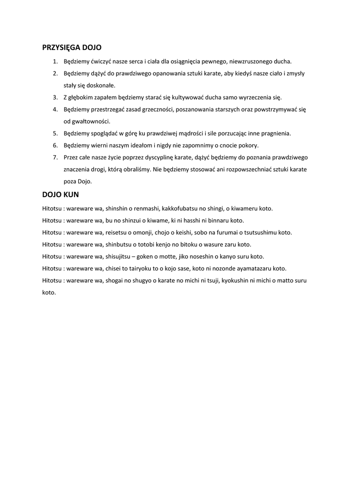 PRZYSIĘGA DOJO 1. Będziemy ćwiczyć nasze serca i ciała dla osiągnięcia pewnego, niewzruszonego ducha. 2. Będziemy dążyć do prawdziwego opanowania sztuki karate, aby kiedyś nasze ciało i zmysły stały się doskonałe. 3. Z głębokim zapałem będziemy starać się kultywować ducha samo wyrzeczenia się. 4. Będziemy przestrzegać zasad grzeczności, poszanowania starszych oraz powstrzymywać się od gwałtowności. 5. Będziemy spoglądać w górę ku prawdziwej mądrości i sile porzucając inne pragnienia. 6. Będziemy wierni naszym ideałom i nigdy nie zapomnimy o cnocie pokory. 7. Przez całe nasze życie poprzez dyscyplinę karate, dążyć będziemy do poznania prawdziwego znaczenia drogi, którą obraliśmy. Nie będziemy stosować ani rozpowszechniać sztuki karate poza Dojo. DOJO KUN Hitotsu : wareware wa, shinshin o renmashi, kakkofubatsu no shingi, o kiwameru koto. Hitotsu : wareware wa, bu no shinzui o kiwame, ki ni hasshi ni binnaru koto. Hitotsu : wareware wa, reisetsu o omonji, chojo o keishi, sobo na furumai o tsutsushimu koto. Hitotsu : wareware wa, shinbutsu o totobi kenjo no bitoku o wasure zaru koto. Hitotsu : wareware wa, shisujitsu – goken o motte, jiko noseshin o kanyo suru koto. Hitotsu : wareware wa, chisei to tairyoku to o kojo sase, koto ni nozonde ayamatazaru koto. Hitotsu : wareware wa, shogai no shugyo o karate no michi ni tsuji, kyokushin ni michi o matto suru koto.