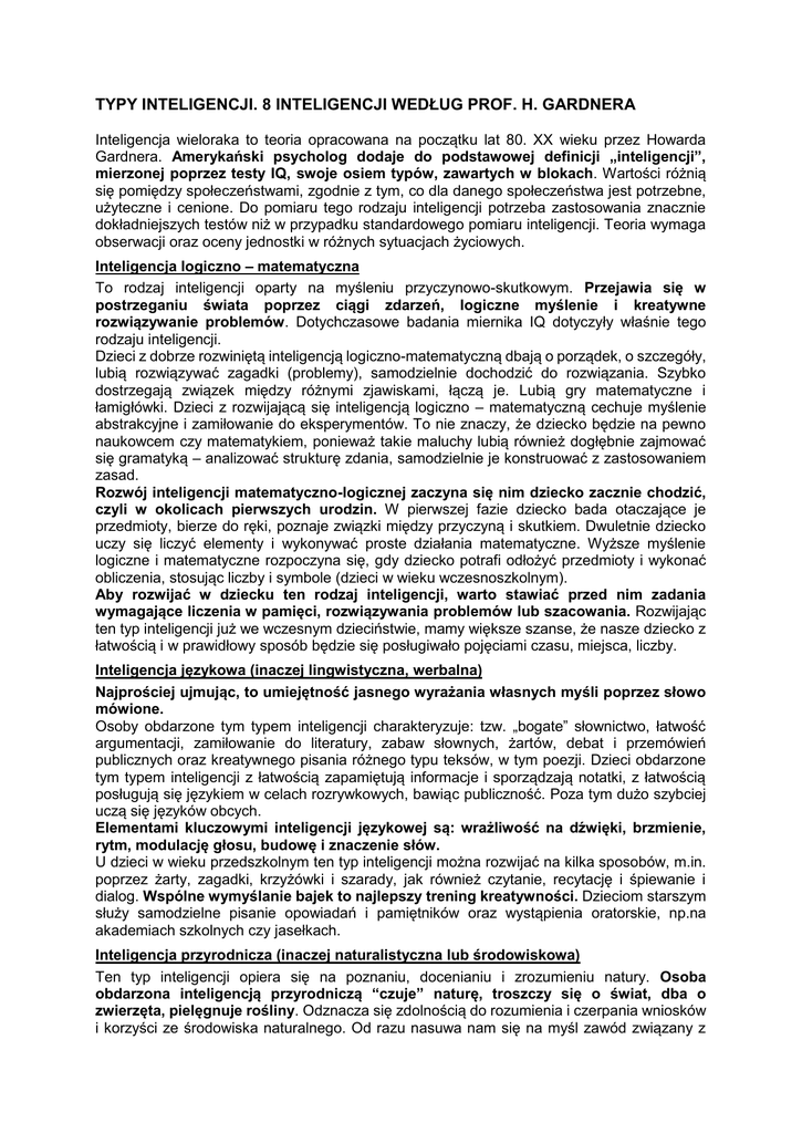 TYPY INTELIGENCJI. 8 INTELIGENCJI WEDŁUG PROF. H. GARDNERA Inteligencja wieloraka to teoria opracowana na początku lat 80. XX wieku przez Howarda Gardnera. Amerykański psycholog dodaje do podstawowej definicji „inteligencji”, mierzonej poprzez testy IQ, swoje osiem typów, zawartych w blokach. Wartości różnią się pomiędzy społeczeństwami, zgodnie z tym, co dla danego społeczeństwa jest potrzebne, użyteczne i cenione. Do pomiaru tego rodzaju inteligencji potrzeba zastosowania znacznie dokładniejszych testów niż w przypadku standardowego pomiaru inteligencji. Teoria wymaga obserwacji oraz oceny jednostki w różnych sytuacjach życiowych. Inteligencja logiczno – matematyczna To rodzaj inteligencji oparty na myśleniu przyczynowo-skutkowym. Przejawia się w postrzeganiu świata poprzez ciągi zdarzeń, logiczne myślenie i kreatywne rozwiązywanie problemów. Dotychczasowe badania miernika IQ dotyczyły właśnie tego rodzaju inteligencji. Dzieci z dobrze rozwiniętą inteligencją logiczno-matematyczną dbają o porządek, o szczegóły, lubią rozwiązywać zagadki (problemy), samodzielnie dochodzić do rozwiązania. Szybko dostrzegają związek między różnymi zjawiskami, łączą je. Lubią gry matematyczne i łamigłówki. Dzieci z rozwijającą się inteligencją logiczno – matematyczną cechuje myślenie abstrakcyjne i zamiłowanie do eksperymentów. To nie znaczy, że dziecko będzie na pewno naukowcem czy matematykiem, ponieważ takie maluchy lubią również dogłębnie zajmować się gramatyką – analizować strukturę zdania, samodzielnie je konstruować z zastosowaniem zasad. Rozwój inteligencji matematyczno-logicznej zaczyna się nim dziecko zacznie chodzić, czyli w okolicach pierwszych urodzin. W pierwszej fazie dziecko bada otaczające je przedmioty, bierze do ręki, poznaje związki między przyczyną i skutkiem. Dwuletnie dziecko uczy się liczyć elementy i wykonywać proste działania matematyczne. Wyższe myślenie logiczne i matematyczne rozpoczyna się, gdy dziecko potrafi odłożyć przedmioty i wykonać obliczenia, stosując liczby i symbole (dzieci w wieku wczesnoszkolnym). Aby rozwijać w dziecku ten rodzaj inteligencji, warto stawiać przed nim zadania wymagające liczenia w pamięci, rozwiązywania problemów lub szacowania. Rozwijając ten typ inteligencji już we wczesnym dzieciństwie, mamy większe szanse, że nasze dziecko z łatwością i w prawidłowy sposób będzie się posługiwało pojęciami czasu, miejsca, liczby. Inteligencja językowa (inaczej lingwistyczna, werbalna) Najprościej ujmując, to umiejętność jasnego wyrażania własnych myśli poprzez słowo mówione. Osoby obdarzone tym typem inteligencji charakteryzuje: tzw. „bogate” słownictwo, łatwość argumentacji, zamiłowanie do literatury, zabaw słownych, żartów, debat i przemówień publicznych oraz kreatywnego pisania różnego typu teksów, w tym poezji. Dzieci obdarzone tym typem inteligencji z łatwością zapamiętują informacje i sporządzają notatki, z łatwością posługują się językiem w celach rozrywkowych, bawiąc publiczność. Poza tym dużo szybciej uczą się języków obcych. Elementami kluczowymi inteligencji językowej są: wrażliwość na dźwięki, brzmienie, rytm, modulację głosu, budowę i znaczenie słów. U dzieci w wieku przedszkolnym ten typ inteligencji można rozwijać na kilka sposobów, m.in. poprzez żarty, zagadki, krzyżówki i szarady, jak również czytanie, recytację i śpiewanie i dialog. Wspólne wymyślanie bajek to najlepszy trening kreatywności. Dzieciom starszym służy samodzielne pisanie opowiadań i pamiętników oraz wystąpienia oratorskie, np.na akademiach szkolnych czy jasełkach. Inteligencja przyrodnicza (inaczej naturalistyczna lub środowiskowa) Ten typ inteligencji opiera się na poznaniu, docenianiu i zrozumieniu natury. Osoba obdarzona inteligencją przyrodniczą “czuje” naturę, troszczy się o świat, dba o zwierzęta, pielęgnuje rośliny. Odznacza się zdolnością do rozumienia i czerpania wniosków i korzyści ze środowiska naturalnego. Od razu nasuwa nam się na myśl zawód związany z przyrodą: botanik, weterynarz czy rolnik. Dzieci z dobrze rozwiniętą inteligencją przyrodniczą świetnie radzą sobie w klasyfikacji różnych przedmiotów w hierarchie (stopniują rzeczy ważniejsze i mniej ważne), dostrzeganiu wzorców funkcjonujących w naturze. Dzieci – przyrodnicy aktywnie spędzają czas na świeżym powietrzu. Lubią zbierać kwiaty i patyki, kolekcjonować kamienie i muszelki, mogą godzinami obserwować mrówki, motyle i pszczoły, uwielbiają opiekować się zwierzętami. Wspomaganie inteligencji przyrodniczej jest nieco bardziej pracochłonne, niż w wypadku innych jej typów. Warto bawić się z dzieckiem w zabawę pod tytułem Szybka Grządka. Do wykonania tytułowej grządki potrzebny jest tylko sznurek. Należy objaśnić dziecku, czym jest grządka i jak dokonuje się obserwacji. Kolejny krok to stworzenie ze sznurka kwadratu (pokażmy dziecku jak związać końce sznurka, aby powstał odpowiedni kształt). Pozwól dziecku wybrać miejsce realizacji zadania (może to być trawnik, a nawet chodnik przy domu czy ogród przedszkolny). Montujemy w wybranym miejscu nasz kwadrat, który na potrzeby zabawy staje się grządką. W swoim notatniku dziecko zapisuje wszystko, co dostrzeże, co znajdzie na wyznaczonej grządce – kamyki, robaki, rośliny, nasiona. Jeżeli nie potrafi pisać, może schematycznie narysować (choć w wypadku przedszkolaków to trudniejsze zadanie, ponieważ ich schematyczny rysunek będzie zapewne bardzo, ale to bardzo staranny). Kolejny etap polega na opracowaniu mapy swojej grządki. Można także stworzyć zielnik, robić zdjęcia. Inteligencja muzyczna (inaczej słuchowa lub rytmiczna) To rozumienie świata poprzez dźwięki. Osoby obdarzone inteligencją muzyczną mają tzw. „słuch muzyczny”, czyli są mocno uwrażliwi
