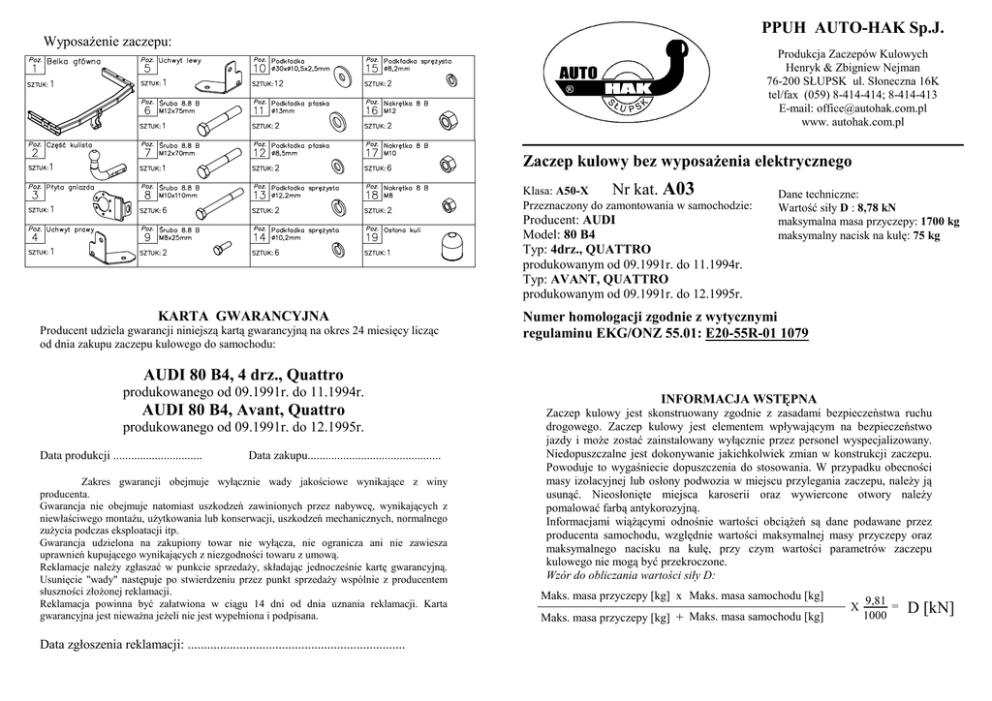 PPUH AUTO-HAK Sp.J. WyposaŜenie zaczepu: Produkcja Zaczepów Kulowych Henryk & Zbigniew Nejman 76-200 SŁUPSK ul. Słoneczna 16K tel/fax (059) 8-414-414; 8-414-413 E-mail: [email protected] www. autohak.com.pl Zaczep kulowy bez wyposaŜenia elektrycznego A03 Klasa: A50-X Nr kat. Przeznaczony do zamontowania w samochodzie: Producent: AUDI Model: 80 B4 Typ: 4drz., QUATTRO produkowanym od 09.1991r. do 11.1994r. Typ: AVANT, QUATTRO produkowanym od 09.1991r. do 12.1995r. KARTA GWARANCYJNA Producent udziela gwarancji niniejszą kartą gwarancyjną na okres 24 miesięcy licząc od dnia zakupu zaczepu kulowego do samochodu: Dane techniczne: Wartość siły D : 8,78 kN maksymalna masa przyczepy: 1700 kg maksymalny nacisk na kulę: 75 kg Numer homologacji zgodnie z wytycznymi regulaminu EKG/ONZ 55.01: E20-55R-01 1079 AUDI 80 B4, 4 drz., Quattro produkowanego od 09.1991r. do 11.1994r. AUDI 80 B4, Avant, Quattro produkowanego od 09.1991r. do 12.1995r. Data produkcji .............................. Data zakupu............................................. Zakres gwarancji obejmuje wyłącznie wady jakościowe wynikające z winy producenta. Gwarancja nie obejmuje natomiast uszkodzeń zawinionych przez nabywcę, wynikających z niewłaściwego montaŜu, uŜytkowania lub konserwacji, uszkodzeń mechanicznych, normalnego zuŜycia podczas eksploatacji itp. Gwarancja udzielona na zakupiony towar nie wyłącza, nie ogranicza ani nie zawiesza uprawnień kupującego wynikających z niezgodności towaru z umową. Reklamacje naleŜy zgłaszać w punkcie sprzedaŜy, składając jednocześnie kartę gwarancyjną. Usunięcie "wady" następuje po stwierdzeniu przez punkt sprzedaŜy wspólnie z producentem słuszności złoŜonej reklamacji. Reklamacja powinna być załatwiona w ciągu 14 dni od dnia uznania reklamacji. Karta gwarancyjna jest niewaŜna jeŜeli nie jest wypełniona i podpisana. Data zgłoszenia reklamacji: ................................................................... INFORMACJA WSTĘPNA Zaczep kulowy jest skonstruowany zgodnie z zasadami bezpieczeństwa ruchu drogowego. Zaczep kulowy jest elementem wpływającym na bezpieczeństwo jazdy i moŜe zostać zainstalowany wyłącznie przez personel wyspecjalizowany. Niedopuszczalne jest dokonywanie jakichkolwiek zmian w konstrukcji zaczepu. Powoduje to wygaśniecie dopuszczenia do stosowania. W przypadku obecności masy izolacyjnej lub osłony podwozia w miejscu przylegania zaczepu, naleŜy ją usunąć. Nieosłonięte miejsca karoserii oraz wywiercone otwory naleŜy pomalować farbą antykorozyjną. Informacjami wiąŜącymi odnośnie wartości obciąŜeń są dane podawane przez producenta samochodu, względnie wartości maksymalnej masy przyczepy oraz maksymalnego nacisku na kulę, przy czym wartości parametrów zaczepu kulowego nie mogą być przekroczone. Wzór do obliczania wartości siły D: Maks. masa przyczepy [kg] x Maks. masa samochodu [kg] Maks. masa przyczepy [kg] + Maks. masa samochodu [kg] X 9,81 = 1000 D [kN] INSTRUKCJA montaŜu i eksploatacji zaczepu kulowego Oznaczenie zacisku wg ISO PN 1 L 2 + 3 31 4 R 5 58R 6 54 7 58L Kolejność czynności przy montaŜu 8 Łączenie przewodów 10 Do świateł kierunku jazdy lewych Tylne światła przeciwmgłowe Do masy pojazdu Do świateł kierunku jazdy prawych Do świateł pozycyjnych prawych Do świateł hamowania Do świateł pozycyjnych lewych 9 4 10 A 8 1 9 10 7 5 10 10 19 6 1. W celu zamontowania zaczepu naleŜy zdemontować zderzak a następnie - od zderzaka odkręcić wsporniki mocujące (nie będą ponownie montowane) - odciąć trzy wsporniki (patrz rysunek 3) - w dolnej krawędzi zderzaka, w jego osi, wyciąć fragment 50x60mm 2. Poszerzyć wejście podłuŜnic w samochodzie wypiłowując fragment jak pokazano na rysunku 2. 3. Poprzez otwory zaczepu (poz. A) przykręcić uchwyty mocujące (poz. 4 i 5) śrubami M8x25mm (poz. 9). 4. Do tak przygotowanego zaczepu przykręcić zderzak fabrycznymi śrubami pozostałymi po odkręceniu wsporników mocujących. 5. Belkę główną zaczepu (poz. 1) wraz ze zderzakiem wsunąć w tunele podłuŜnic tak aby otwory zaczepu pokryły się z fabrycznie przygotowanymi otworami i skręcić od wnętrza bagaŜnika śrubami M10x110mm (poz. 8) jak pokazano na rysunku 1. 6. Dokręcić wszystkie śruby z momentem, jak pokazano w tabeli. 7. Przykręcić część kulistą (poz. 2) wraz z blachą pod gniazdo (poz. 3) śrubami M12x75mm (poz. 6) oraz M12x70mm (poz. 7) z wyposaŜenia. 8. Podłączyć przewody z gniazdka 7 – bieg. do instalacji elektrycznej zgodnie z instrukcją fabryczną samochodu (zaleca się wykonanie w ASO). 9. Uzupełnić ewentualne ubytki powłoki malarskiej zaczepu powstałe w trakcie montaŜu. L Rys. 1 3 2 A Rys. 2 Zaczep kulowy przeznaczony jest do zamontowania w samochodach: AUDI 80 B4, 4 drz., Quattro, produkowanym od 09.1991r. do 11.1994r., AUDI 80 B4, Avant, Quattro, produkowanym od 09.1991r. do 12.1995r., nr katalogowy A03 i słuŜy do ciągnięcia przyczep o masie całkowitej do 1700 kg i nacisku na kulę max 75 kg. Zalecany moment skręcający dla śrub i nakrętek 8,8: M6 - 11 Nm M8 - 25 Nm M10 - 50 Nm M12 - 87 Nm M14 - 138 Nm M16 - 210 Nm UWAGA Po zamontowaniu zaczepu kulowego naleŜy uzyskać wpis w dowodzie rejestracyjnym pojazdu na „stacji kontroli pojazdów” właściwej dla miejsca zamieszkania. Samochód powinien być wyposaŜony w : -kierunkowskazy boczne -lusterka boczne o rozstawie co najmniej szerokości przyczepy Sprawdzać śruby mocujące zaczepu kulowego po około 1 000 km przebiegu eksploatacji. Kula zaczepu musi być utrzymana w czystości i konserwowana smarem stałym. Rys. 3 P