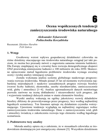 6 Ocena współczesnych tendencji zanieczyszczenia środowiska naturalnego Aleksander Szkarowski Politechnika Koszalińska Recenzent: Zdzisław Harabin PAN Zabrze 1. Wstęp Gwałtowny wzrost wpływu gospodarczej działalności człowieka na róŜne dziedziny otaczającego nas środowiska naturalnego osiągnął juŜ taki poziom, Ŝe moŜna bez przesady mówić o zagroŜeniu samemu istnieniu ludzkości. Dla Europy znajdującej się w czwartej fazie rozwoju demograficznego eksperci ONZ przewidują zmniejszenie ludności o 100 milionów do roku 2050. Skuteczne opracowanie metod łagodzenia problemów środowiska wymaga uwaŜnej oceny i ścisłej analizy istniejącej sytuacji. Została wykonana analiza systemu globalnego naukowego prognozowania rozwoju środowiska. Minęło ponad 25 lat od momentu wytworzenia najbardziej miarodajnych i naukowo uzasadnionych prognoz rozwoju biosfery (wzrost liczby ludności, ekonomika, zasoby nieodnawialne, zanieczyszczenie wód, gleby i atmosfery) [1÷4]. Analiza zgromadzonych danych monitoringu pozwala zarówno na ocenę dokładności i niezawodności tych prognoz, jak i wyjawienie tendencji dalszych zmian w stanie elementów biosfery. Wyniki analizy wskazują na ogólny jakościowy rozwój składników biosfery zbliŜony do przewidywanego przez prognozy, lecz według najbardziej łagodnych scenariuszy. Ten fenomen opisuje się działaniem czynnika wstrzymującego. Ujawnione tendencje wyglądają na najbardziej zagraŜające wobec zanieczyszczania środowiska naturalnego. Dane o zanieczyszczeniu wód, gleb i atmosfery świadczą o zakończeniu rozwoju tego elementu według łagodnego scenariusza. 2. Podstawowe tezy analizy Metoda analizy opiera się o załoŜenie, Ŝe w stosunkach człowieka ze środowiskiem dominującym jest energetyczny element [5]. Wszystkim dziedzinom Aleksander Szkarowski działalności ludzkości towarzyszy rosnące zuŜycie energii i powstanie olbrzymiej ilości odpadów i bocznych produktów nie podlegających procesowi samodegradacji. Przerabianie odpadów znów potrzebuje energii, a wydobyciu paliwa i produkowaniu energii znów towarzyszą odpady i inne czynniki wpływu na pogorszenie stanu środowiska. Stwierdzono, Ŝe ostatnie dziesięciolecie było okresem działania swego rodzaju wstrzymującego czynnika w zjawiskach zanieczyszczenia środowiska. Zdaniem autora taki rozwój w znacznej mierze został wyznaczony przez nieuzasadnione inwestycji, oraz wydatki energii i materiałów na przedsięwzięcia ekologiczne. Właśnie naduŜycie energii spełnia na obecnym etapie rolę hamulca nieco zwalniającego negatywne tendencje. W wyniku powstał efekt „ściśniętej spręŜyny”, gdyŜ zakłócenia w bilansie ekologicznym zostały tylko czasowo powstrzymane. Osłabienie wpływu łagodzących czynników spowoduje przejście ilościowych wskaźników stanu środowiska do ekstensywnego stadium, które moŜe mieć katastroficzny charakter i wielokrotnie przekroczy nawet najbardziej pesymistyczne prognozy. 3. Model czynnikaz wstrzymującego Matematycznie działanie czynnika sprowadzi się do następującego modelu. Przewidywana wartość dowolnego wskaźniku stanu środowiska składa się z jego intensywnej i ekstensywnej części: Ppr = Peks + Pint (1) Ekstensywny składnik, jako najbardziej moŜliwy do przewidzenia, do aktualnej wartości rozpatrywanego wskaźnika wchodzi o wartości przybliŜonej do przewidywanej. Składnik intensywny zaś ulega mocnemu wpływu wstrzymującego czynnika Φ: Pakt = Peks + 1 + Φ n Pint (2) ( ) Obliczenia ilościowe zostały wykonane dla okresu 35÷40 lat od roku 1975, gdy zaczęła działać większość z miarodajnych prognoz, co daje 20-letni okres od momentu teraźniejszego. Wartość faktora wstrzymującego wynosi: Φ = A + B1T + B2T 2 + B3T 3 + B4T 4 + B5T 5 , (3) gdzie: T – czas od początku periodu (od 1975 r.), lat. 138 Środkowo-Pomorskie Towarzystwo Naukowe Ochrony Środowiska Ocena współczesnych tendencji zanieczyszczenia środowiska naturalnego Współczynniki wielomianu (w kolejności wzrostu) charakteryzują: 1. Moralny składnik wstrzymania, który najbardziej wyraźnie przejawia się w działalności społecznych ekologicznych organizacji, ale jest elementem zachowania się kaŜdej osoby odpowiednio do jej kulturalno-intelektualnego poziomu. 2. Sprawność zuŜycia energii w dziedzinie ochrony środowiska. 3. Czynnik ekonomiczny, definiujący dopuszczalny ze względów ekonomicznych poziom inwestycji na ekologię (w porównaniu z grzywnami za zanieczyszczenie środowiska). Czynnik łączy w sobie równieŜ poziom prawa ekologicznego. 4. Naturalne dąŜenie kaŜdego gatunku biologicznego do przeŜycia. 5. Wskaźnik miarodajności prognozy (prawidłowość oceny poprzedniego okresu i stopień uzasadnienia dalszego przewidywania). Tabela 1. Współczynniki wielomianu (3) według ewentualnych wersji kryzysu ekologicznego Table 1. Coefficients of polynomial (3) according to possible versions of ecological crisis Współczynniki wielomianu A B1 B2 B3 B4 B5 „Łagodny” scenariusz 2,1·10-4 1,012·10-1 −1,452·10-3 −2,122·10-4 1,102·10-5 −1,636·10-7 „Średni” scenariusz −6,1·10-5 1,015·10-1 −1,451·10-3 −2,243·10-4 1,212·10-5 −1,892·10-7 „Surowy” scenariusz −5,8·10-4 1,067·10-1 −2,801·10-3 −1,171·10-4 9,116·10-6 −1,687·10-7 Uzyskane wartości współczynników dają prawdopodobny obraz zmiany faktora wstrzymania według trzech wariantów cięŜkości przebiegu przewidywanego kryzysu ekologicznego (tabl. 1). Jednoznacznie dodatnimi czyli wstrzymującymi w modelu są tylko moralny faktor odpowiedzialności przed naturą i społeczeństwem B1 oraz czysto biologiczny faktor przeŜycia B4. NajpotęŜniejszym czynnikiem wzrostu zanieczyszczenia środowiska jest ekonomiczny faktor B3: wydatki na ekologię zawsze są sprzeczne z zasadą efektywności inwestycji. Definiujące znaczenie w przeciwdziałaniu czynników wzrostu i wstrzymania naleŜy właś