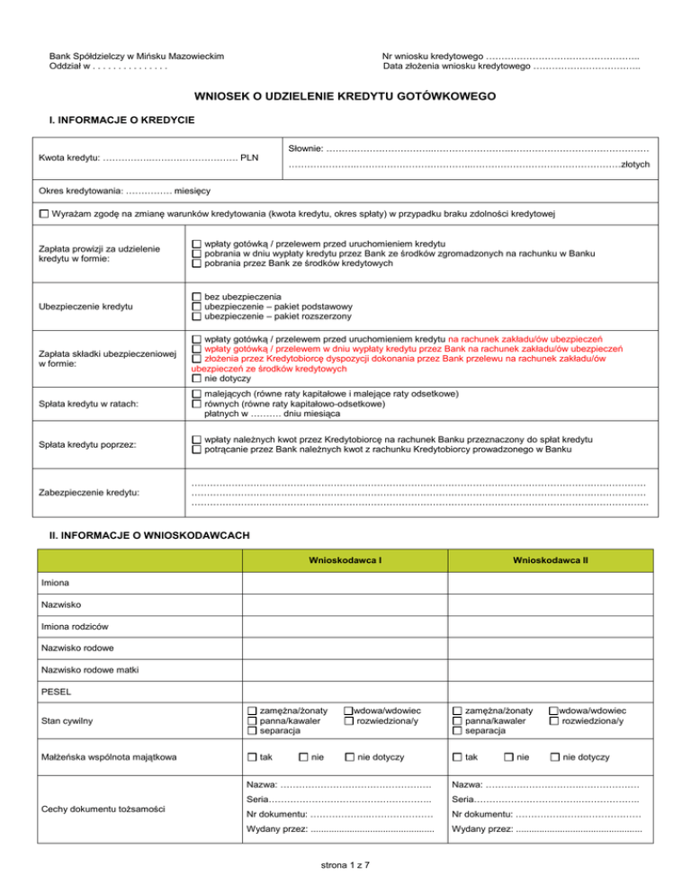 Wniosek o kredyt gotówkowy - Bank Spółdzielczy w Mińsku