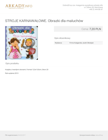 Dobra28 sp zoo. księgarnia wysyłkowa arkady.info ul. Dobra 28, Warszawa +48 22 444 86 97 STROJE KARNAWAŁOWE. Obrazki dla maluchów Cena: 7,20 PLN Opis słownikowy Wydawca Firma Księgarska Jacek Olesiejuk Opis produktu Książka z twardymi stronami, Format 12,5x13,5cm, Stron 20 Rok wydania 2013 Plik wygenerowano: 04-03-2017 Powered by TCPDF (www.tcpdf.org) Oprogramowanie sklepu: AptusShop