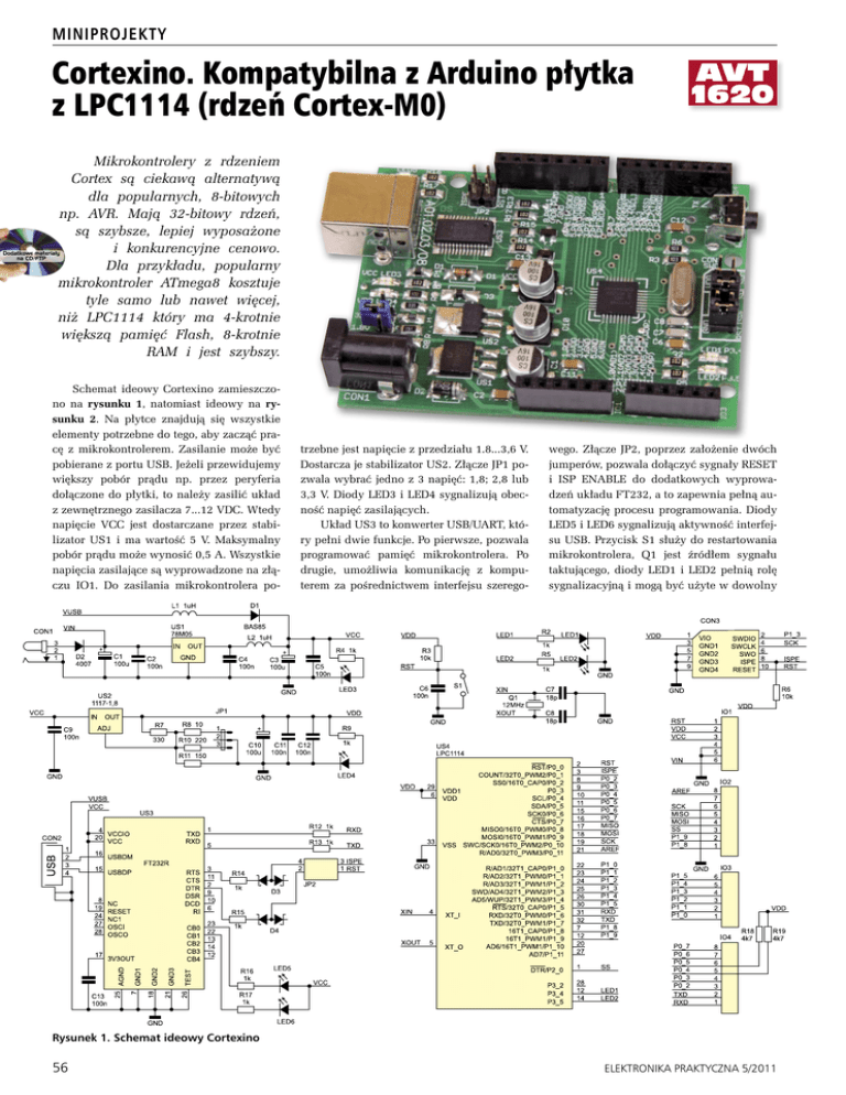 MINIPROJEKTY Cortexino. Kompatybilna z Arduino płytka z LPC1114 (rdzeń Cortex-M0) AVT 1620 Mikrokontrolery z rdzeniem Cortex są ciekawą alternatywą dla popularnych, 8-bitowych np. AVR. Mają 32-bitowy rdzeń, są szybsze, lepiej wyposażone i konkurencyjne cenowo. Dla przykładu, popularny mikrokontroler ATmega8 kosztuje tyle samo lub nawet więcej, niż LPC1114 który ma 4-krotnie większą pamięć Flash, 8-krotnie RAM i jest szybszy. Dodatkowe materiały na CD/FTP Schemat ideowy Cortexino zamieszczono na rysunku 1, natomiast ideowy na rysunku 2. Na płytce znajdują się wszystkie elementy potrzebne do tego, aby zacząć pracę z mikrokontrolerem. Zasilanie może być pobierane z portu USB. Jeżeli przewidujemy większy pobór prądu np. przez peryferia dołączone do płytki, to należy zasilić układ z zewnętrznego zasilacza 7...12 VDC. Wtedy napięcie VCC jest dostarczane przez stabilizator US1 i ma wartość 5 V. Maksymalny pobór prądu może wynosić 0,5 A. Wszystkie napięcia zasilające są wyprowadzone na złączu IO1. Do zasilania mikrokontrolera po- trzebne jest napięcie z przedziału 1.8...3,6 V. Dostarcza je stabilizator US2. Złącze JP1 pozwala wybrać jedno z 3 napięć: 1,8; 2,8 lub 3,3 V. Diody LED3 i LED4 sygnalizują obecność napięć zasilających. Układ US3 to konwerter USB/UART, który pełni dwie funkcje. Po pierwsze, pozwala programować pamięć mikrokontrolera. Po drugie, umożliwia komunikację z komputerem za pośrednictwem interfejsu szerego- wego. Złącze JP2, poprzez założenie dwóch jumperów, pozwala dołączyć sygnały RESET i ISP ENABLE do dodatkowych wyprowadzeń układu FT232, a to zapewnia pełną automatyzację procesu programowania. Diody LED5 i LED6 sygnalizują aktywność interfejsu USB. Przycisk S1 służy do restartowania mikrokontrolera, Q1 jest źródłem sygnału taktującego, diody LED1 i LED2 pełnią rolę sygnalizacyjną i mogą być użyte w dowolny Rysunek 1. Schemat ideowy Cortexino 56 ELEKTRONIKA PRAKTYCZNA 5/2011 MINIPROJEKTY AVT-1620 w ofercie AVT: AVT-1620A – płytka drukowana AVT-1620B – płytka drukowana + elementy Dodatkowe materiały na CD/FTP: ftp://ep.com.pl, user: 12147, pass: 2e7u6a2a • wzory płytek PCB • karty katalogowe i noty aplikacyjne elementów oznaczonych w Wykazie elementów kolorem czerwonym Projekty pokrewne na CD/FTP: AVT-5272 AVT-5263 AVT-2875 AVT-971 AVT-939 Rysunek 6. Podstawowe parametry programu Flash Magic Rysunek 2. Schemat montażowy Cortexino sposób. Porty mikrokontrolera dołączono do złącz IO2, IO3 i IO4. Złącze CON3 umożliwia dołączenie zewnętrznego programatora/ debuggera z interfejsem SWD. Rozmieszczenie gniazd jest kompatybilne z Arduino Delimeanove Board co pozwala na użycie tych samych modułów rozszerzających. Nóżki PORT0_4 i PORT0_5 są także doprowadze- AVT-926 AVT-920 AVT-3505 AVT-3500 AVT-992 AVT-2500 AVT-2250 eMeSPek Rysunek 3. Kopiowanie numeru seryjnego do Schowka niami I2C i pracują jako wyjścia open drain, więc zostały wyposażone w zewnętrzne rezystory podciągające. Środowisko programistyczne Rysunek 4. Okno z numerem seryjnym Rysunek 5. Wprowadzenie kodu aktywującego ELEKTRONIKA PRAKTYCZNA 5/2011 Przygotowanie kompletnego środowiska spro- Arduino (EP 01/2011) CoolPCB – Zestaw uruchomieniowy CPLD (EP 11/2010) LogicMaster – płytka prototypowa dla CPLD (EdW 8/2008) Zestaw uruchomieniowy USB z PIC18F4550 (EP 2-3/2007) Zestaw startowy dla mikrokontekstów ST7FLITE2x (EP 7-8/2006) Zestaw startowy dla PsoC (EP 4/2006) Zestaw startowy z MSP430F413 (EP 2-3/2006) Płytka testowa do kursu C (EdW 1/2006) Płytka testowa do kursu BASCOM AVR (EdW 10/2002) Zestaw uruchomieniowy dla AVR i 51 (EP 1-2/2001) Płytka testowa do kursu BASCOM 8051 (EdW 3/2000) Mikrokomputer edukacyjny z 8051 (EdW 8/1997) Komputerek z mikrokontrolerem MSP430F1232 (EP 4/2008) Wykaz elementów: R2, R4, R5, R9, R12...R17: 1 kV R3, R6: 10 kV R7: 330 kV R8: 10 V R10: 220 V R11: 150 V R18, R19: 4,7 V C1, C3, C10: 100 mF/16 V (SMD „C”) C2, C4...C6, C9, C11...C13: 100 nF (SMD) C7, C8: 18 pF (SMD) L1, L2: dławik 0 mH (SMD) D1: BAS85 D2: 1N4007 (SMD) D3, D4: BAR43 LED1...LED6: LED SMD US1: 78M05 US2: LM1117-1.8 US3: FT232R US4: LPC1114 HQFN33/301 S1: mikroswitch kątowy Q1: kwarc 12 MHz JP1: goldpin 1×3 JP2: goldpin 2×2 Zworki: 3 szt. IO1, IO3: gniazdo goldpin 1×6 IO2, IO4: gniazdo goldpin 1×8 CON1: GN DC2.1/5.5 kątowe CON2: USB B kątowe CON3: goldpin 2×5 wadza się do zainstalowania dwóch programów. Pierwszy z nich to LPCXpresso - zintegrowane środowisko programistycz- Rysunek 7. Zaawansowane parametry programu Flash Magic 57 Na CD: karty katalogowe i noty aplikacyjne elementów oznaczonych w wykazie elementów kolorem czerwonym (wymienione artykuły są w całości dostępne na CD) MINIPROJEKTY ne dla mikrokontrolerów LPC na bazie Eclipse. Wersja instalacyjna po zalogowaniu jest dostępna na stronie http://lpcxpresso. code-red-tech.com/LPCXpresso/ w zakładce „Download”. Drugi program, to Flash Magic – narzędzie do programowania pamięci mikrokontrolera, także poprzez interfejs UART z wykorzystaniem bootloadera. Wersja instalacyjna dostępna jest na stronie http://www. flashmagictool.com/. Po zainstalowaniu obu programów uruchamiamy LPCXpresso, który należy zarejestrować. Rejestracja jest bezpłatna, aby ją wykonać należy w zakładce „Help” wybrać „Product activation” i „Create Serial number and Activate...”. Pojawi się okno, w którym zostanie wyświetlony numer seryjny. Zaznaczamy „Copy Serial Number to clipboard” 58 i klikamy „OK” (rysunek 3). Zostanie otworzona strona code-red-tech.com gdzie musimy się zalogować, następnie w zakładce „My Registrations” w polu „Enter serial number here” wkleić wygenerowany numer seryjny (rysunek 4). Kod aktywacyjny zostanie wysłany na naszą skrzynkę e-mailową, kopiujemy go i wklejamy w zakładce „Help”, „Product activation” i „Enter Activation Code” (rys