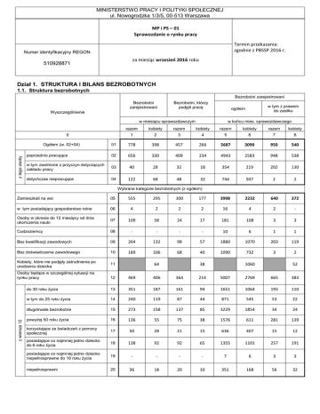 MINISTERSTWO PRACY I POLITYKI SPOŁECZNEJ ul. Nowogrodzka 1/3/5, 00-513 Warszawa MP i PS – 01 Sprawozdanie o rynku pracy Termin przekazania: zgodnie z PBSSP 2016 r. Numer identyfikacyjny REGON za miesiąc wrzesień 2016 roku 510928871 Dział 1. STRUKTURA I BILANS BEZROBOTNYCH 1.1. Struktura bezrobotnych Bezrobotni zarejestrowani Bezrobotni zarejestrowani Bezrobotni, którzy podjęli pracę w miesiącu sprawozdawczym w końcu mies. sprawozdawczego razem kobiety razem kobiety razem kobiety razem kobiety 1 2 3 4 5 6 7 8 01 778 398 457 266 5687 3090 950 540 poprzednio pracujące 02 656 330 409 234 4943 2583 948 538 w tym zwolnione z przyczyn dotyczących zakładu pracy 03 40 28 32 18 354 219 202 130 dotychczas niepracujące 04 122 68 48 32 744 507 2 2 0 Ogółem (w. 02+04) z tego osoby w tym z prawem do zasiłku ogółem Wyszczególnienie Wybrane kategorie bezrobotnych (z ogółem) Zamieszkali na wsi 05 555 295 300 177 3998 2232 640 372 w tym posiadający gospodarstwo rolne 06 4 2 2 2 16 4 2 - Osoby w okresie do 12 miesięcy od dnia ukończenia nauki 07 109 58 24 17 181 108 3 3 Cudzoziemcy 08 - - - - 10 6 1 1 Bez kwalifikacji zawodowych 09 264 132 98 57 1880 1070 203 119 Bez doświadczenia zawodowego 10 189 106 68 40 1090 732 3 2 Kobiety, które nie podjęły zatrudnienia po urodzeniu dziecka 11 z wiersza 12 Osoby będące w szczególnej sytuacji na rynku pracy 64 38 1060 52 12 469 406 364 214 5007 2769 665 383 do 30 roku życia 13 351 187 161 94 1651 1064 193 110 w tym do 25 roku życia 14 240 119 87 44 871 545 53 22 długotrwale bezrobotne 15 273 158 137 85 3229 1854 34 24 powyżej 50 roku życia 16 136 55 75 38 1576 611 281 139 korzystające ze świadczeń z pomocy społecznej 17 50 28 21 15 636 407 15 12 posiadające co najmniej jedno dziecko do 6 roku życia 18 138 92 92 65 1355 1101 257 191 posiadające co najmniej jedno dziecko niepełnosprawne do 18 roku życia 19 - - - - 7 6 3 3 niepełnosprawni 20 36 18 20 10 351 168 56 32 1.2. Bilans bezrobotnych Wyszczególnienie Ogółem 0 Kobiety Z ogółem zamieszkali na wsi Z ogółem z prawem do zasiłku razem kobiety razem kobiety 1 2 3 4 5 6 21 5713 3101 3977 2215 1036 583 Bezrobotni zarejestrowani w miesiącu sprawozdawczym (w. 23+24) 22 778 398 555 295 131 75 po raz pierwszy 23 189 94 137 70 30 19 po raz kolejny 24 589 304 418 225 101 56 po pracach interwencyjnych 25 po robotach publicznych 26 10 3 8 2 3 2 po stażu 27 72 55 49 40 1 1 po odbyciu przygotowania zawodowego dorosłych 28 - - - - - - po szkoleniu 29 6 1 5 1 2 - po pracach społecznie użytecznych 30 6 2 3 1 31 804 409 534 278 32 457 266 300 177 33 234 6 264 9 155 5 z wiersza 22 z tego Bezrobotni według stanu w końcu miesiąca poprzedzającego sprawozdanie Osoby wyłączone z ewidencji bezrobotnych w miesiącu sprawozdawczym (w.32+49+51+53+54+56 do 65) podjęcia pracy w miesiącu sprawozdawczym (w. 33+36) podjęcie działalności gospodarczej 34 404 13 pracy sezonowej 35 - - - - 36 53 32 36 22 prac interwencyjnych 37 robót publicznych 38 16 2 13 1 12 2 9 1 podjęcia działalności gospodarczej 39 10 7 7 5 w tym w ramach bonu na zasiedlenie 40 - - - - 41 1 1 1 1 42 9 4 5 2 podjęcia pracy w ramach bonu zatrudnieniowego 43 - - - - podjęcia pracy w ramach świadczenia aktywizacyjnego 44 - - - - podjęcia pracy w ramach grantu na telepracę 45 - - - - 46 - - - - 47 - - - - 48 15 6 9 4 rozpoczęcia szkolenia 49 35 2 24 2 w tym w ramach bonu szkoleniowego 50 1 - 1 - rozpoczęcia stażu 51 31 24 22 18 w tym w ramach bonu stażowego 52 - - - - rozpoczęcia przygotowania zawodowego dorosłych 53 - - - - rozpoczęcia prac społecznie użytecznych 54 7 3 4 1 w tym w ramach PAI 55 - - - - skierowania do agencji zatrudnienia w ramach zlecania działań aktywizacyjnych 56 - - - - odmowy bez uzasadnionej przyczyny przyjęcia propozycji odpowiedniej pracy lub innej formy pomocy, w tym w ramach PAI 57 20 8 14 7 odmowy ustalenia profilu pomocy 58 niepotwierdzenia gotowości do pracy 59 dobrowolnej rezygnacji ze statusu bezrobotnego 60 189 17 70 7 130 14 48 6 podjęcia nauki 61 1 1 1 1 osiągnięcia wieku emerytalnego 62 - - - - nabycia praw emerytalnych lub rentowych 63 7 4 4 2 nabycia praw do świadczenia przedemerytalnego 64 6 4 2 1 innych 65 34 20 19 15 66 5687 3090 3998 2232 67 919 569 701 444 w tym niesubsydiowanej z tego z przyczyn z tego z tego subsydiowanej (w.37+38+39+41 do 48) podjęcia pracy w ramach refundacji kosztów zatrudnienia bezrobotnego podjęcia pracy poza miejscem zamieszkania w ramach bonu na zasiedlenie podjęcia pracy w ramach refundacji składek na ubezpieczenia społeczne podjęcia pracy w ramach dofinansowania wynagrodzenia za zatrudnienie skierowanego bezrobotnego powyżej 50 roku życia inne Bezrobotni według stanu w końcu miesiąca sprawozdawczego (w.21+22-31) w tym zarejestrowani po raz pierwszy 1.3. Bilans wybranych kategorii bezrobotnych, będących w szczególnej sytuacji na rynku pracy Do 30 roku życia w tym do 25 roku życia Powyżej 50 roku życia Długotrwale bezrobotni razem kobiety razem kobiety razem kobiety razem kobiety 1 2 3 4 5 6 7 8 Wyszczególnienie 0 68 1609 1047 823 521 1571 616 3235 1842 Bezrobotni zarejestrowani w miesiącu sprawozdawczym (w.70+71) 69 351 187 240 119 136 55 273 158 po raz pierwszy 70 138 69 115 55 13 5 po raz kolejny 71 213 118 125 64 123 50 273 158 po pracach interwencyjnych 72 - - - - - - - - po robotach publicznych 73 - - - - 7 2 1 - po stażu 74 47 32 32 19 6 6 24 20 po odbyciu przygotowania zawodowego dorosłych 75 po szkoleniu 76 4 1 1 1 1 - 2 - po pracach społecznie użytecznych 77 - - - - 3 - 5 1 78 300 164 183 91 131 60 279 146 79 161 94 87 44 75 38 137 85 80 132 78 72 39 69 35 126 77 podjęcie działalności gospodarczej 81 pracy sezonowej 82 83 1 29 1 16 15 5 4 6 1 3 3 11 1 8 prac interwencyjnych 84 2 2 1 1 4 3 1 1 robót publicznych 85 1 1 1 1 1 - - - podjęcia działalności gospodarczej 86 4 4 1 1 1 - 6 4 w tym w ramach bonu na zasiedlenie 87 - - - - - - podjęcia pracy w ramach refundacji kosztów zatr