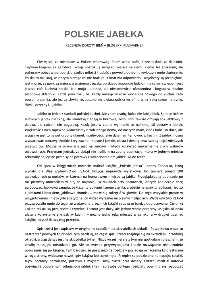 POLSKIE JABŁKA RECENZJA DOROTY BIEŃ – BLOGERKI KULINARNEJ Cieszę się, że mieszkam w Polsce. Naprawdę. Znam wiele osób, które tęsknią za dalekimi, ciepłymi krajami, za egzotyką i wciąż poszukują swojego miejsca na ziemi. Kiedyś też szukałam, ale półroczny pobyt w europejskiej stolicy miłości i radość z powrotu do domu wyleczyły mnie skutecznie. Polska to taki kraj, w którym niczego mi nie brakuje. Klimat ma odpowiedni, krajobrazy są przepiękne, jest morze, są góry, są jeziora, a znajomość języka polskiego imponuje ludziom na całym świecie. I jest jeszcze coś: kuchnia polska. Nie moja ulubiona, ale niesamowicie różnorodna i bogata w lokalne sezonowe składniki. Każda pora roku, ba, każdy miesiąc w roku wnosi coś nowego do kuchni. Lato powoli przemija, ale już za chwilę rozpocznie się piękna polska jesień, a wraz z nią sezon na dynię, śliwki, orzechy i… jabłka. Jabłko to jeden z symboli polskiej kuchni. Nie znam osoby, która nie lubi jabłek. Są tacy, którzy surowych jabłek nie tkną, ale szarlotkę zjadają w hurtowej ilości. Inni zawsze omijają sok jabłkowy z daleka, ale cydrem nie pogardzą. Każdy jest w stanie wymienić co najmniej 10 potraw z jabłek. Większość z nich zapewne wynieśliśmy z rodzinnego domu, od naszych mam, cioć i babć. To dużo, ale wciąż nie jest to nawet drobny ułamek możliwości, jakie daje nam ten owoc w kuchni. Z jabłek można wyczarować potrawy słodkie i wytrawne, mięsne i jarskie, ciasta i desery oraz szereg najróżniejszych przetworów. Można je oczywiście jeść na surowo i wtedy korzystać maksymalnie z ich walorów zdrowotnych. Przyznam jednak, że dotąd nie trafiłam na żadną publikację, która w jednym miejscu zebrałaby najlepsze przepisy na potrawy z wykorzystaniem jabłek. Aż do teraz. Od lipca w księgarniach możecie znaleźć książkę „Polskie jabłka” Joanny Tołłoczko, którą wydało dla Was wydawnictwo REA-SJ. Pozycja naprawdę wyjątkowa, bo zawiera ponad 100 sprawdzonych przepisów, w których na honorowym miejscu są jabłka. Przeglądając ją pobieżnie po raz pierwszy umieściłam w niej co najmniej 10 zakładek przy potrawach, których koniecznie chcę spróbować. Jabłkowa sangria, bakłażan z jabłkami i serem z grilla, arabskie naleśniki z jabłkami, risotto z jabłkami i boczkiem, jabłkowe tiramisu… może się zakręcić w głowie. Do tego wszystkie proste w przygotowaniu i niezwykle apetyczne, co widać wyraźnie na pięknych zdjęciach. Wydawnictwo REA-SJ przyzwyczaiło mnie do tego, że wydawane przez nich książki są zawsze bardzo dopracowane. Czcionka i układ tekstu są przejrzyste i czytelne. Format jest duży, ale jednocześnie poręczny. Miękka okładka ułatwia korzystanie z książki w kuchni – można jedną ręką mieszać w garnku, a w drugiej trzymać książkę i czytać dalszy ciąg przepisu. Spis treści jest zapisany w oryginalny sposób – na skrzydełkach okładki. Początkowo może to nastręczać pewnych trudności, tym bardziej, że część spisu treści znajduje się na skrzydełku przedniej okładki, a ciąg dalszy jest na skrzydełku tylnej. Nigdy wcześniej się z tym nie spotkałam i przyznam, że chwilę mi zajęło odszukanie go. Ale to kwestia przyzwyczajenia i takie rozwiązanie nie utrudnia poruszania się po książce. Tym bardziej, że poszczególne rozdziały posiadają oznaczenia kolorystyczne w rogu strony, widoczne nawet, gdy książka jest zamknięta. Przepisy są podzielone na napoje, sałatki, zupy, potrawy bezmięsne, potrawy z mięsem, sosy, ciasta oraz desery. Ostatni rozdział autorka poświęciła popularnym odmianom jabłek i tak naprawdę od tego rozdziału powinno się rozpocząć przygodę z przepisami na jabłkowe dania. Jest w nim zawarta solidna dawka praktycznej wiedzy na temat różnych odmian jabłek. Jeśli kiedykolwiek zastanawialiście się, czy do przetworów lepsze będą ligole czy antonówki, to wszystkie wątpliwości zostaną rozwiane. Jeśli lubicie książki kucharskie, ale w swoich zbiorach chcecie mieć tylko takie, z których naprawdę będziecie korzystać, to „Polskie jabłka” Joanny Tołłoczko na pewno Was nie zawiodą. Nie musicie się obawiać, że traficie w niej na obco brzmiące lub trudne do dostania składniki. Wszystkie przepisy opierają się na produktach dostępnych w każdym lokalnym sklepie z warzywami, a główny bohater, czyli jabłko, właśnie dumnie wkracza na targowe stragany, więc tego na pewno Wam nie zabraknie. Gorąco polecam.