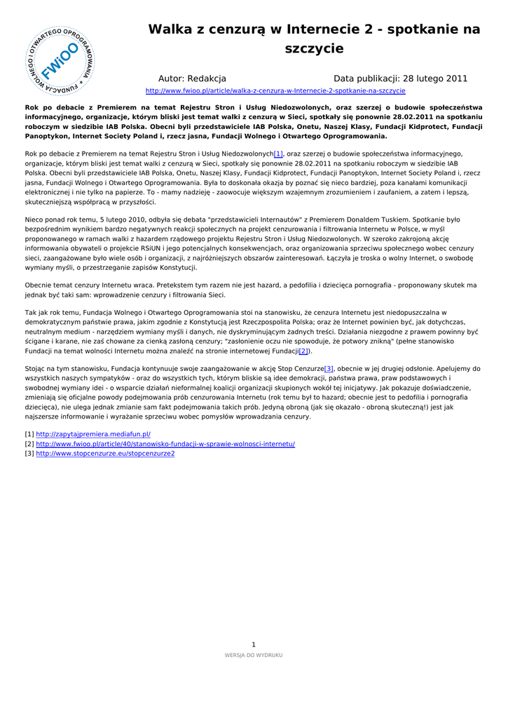 Walka z cenzurą w Internecie 2 - spotkanie na szczycie Autor: Redakcja Data publikacji: 28 lutego 2011 http://www.fwioo.pl/article/walka-z-cenzura-w-Internecie-2-spotkanie-na-szczycie Rok po debacie z Premierem na temat Rejestru Stron i Usług Niedozwolonych, oraz szerzej o budowie społeczeństwa informacyjnego, organizacje, którym bliski jest temat walki z cenzurą w Sieci, spotkały się ponownie 28.02.2011 na spotkaniu roboczym w siedzibie IAB Polska. Obecni byli przedstawiciele IAB Polska, Onetu, Naszej Klasy, Fundacji Kidprotect, Fundacji Panoptykon, Internet Society Poland i, rzecz jasna, Fundacji Wolnego i Otwartego Oprogramowania. Rok po debacie z Premierem na temat Rejestru Stron i Usług Niedozwolonych[1], oraz szerzej o budowie społeczeństwa informacyjnego, organizacje, którym bliski jest temat walki z cenzurą w Sieci, spotkały się ponownie 28.02.2011 na spotkaniu roboczym w siedzibie IAB Polska. Obecni byli przedstawiciele IAB Polska, Onetu, Naszej Klasy, Fundacji Kidprotect, Fundacji Panoptykon, Internet Society Poland i, rzecz jasna, Fundacji Wolnego i Otwartego Oprogramowania. Była to doskonała okazja by poznać się nieco bardziej, poza kanałami komunikacji elektronicznej i nie tylko na papierze. To - mamy nadzieję - zaowocuje większym wzajemnym zrozumieniem i zaufaniem, a zatem i lepszą, skuteczniejszą współpracą w przyszłości. Nieco ponad rok temu, 5 lutego 2010, odbyła się debata "przedstawicieli Internautów" z Premierem Donaldem Tuskiem. Spotkanie było bezpośrednim wynikiem bardzo negatywnych reakcji społecznych na projekt cenzurowania i filtrowania Internetu w Polsce, w myśl proponowanego w ramach walki z hazardem rządowego projektu Rejestru Stron i Usług Niedozwolonych. W szeroko zakrojoną akcję informowania obywateli o projekcie RSiUN i jego potencjalnych konsekwencjach, oraz organizowania sprzeciwu społecznego wobec cenzury sieci, zaangażowane było wiele osób i organizacji, z najróżniejszych obszarów zainteresowań. Łączyła je troska o wolny Internet, o swobodę wymiany myśli, o przestrzeganie zapisów Konstytucji. Obecnie temat cenzury Internetu wraca. Pretekstem tym razem nie jest hazard, a pedofilia i dziecięca pornografia - proponowany skutek ma jednak być taki sam: wprowadzenie cenzury i filtrowania Sieci. Tak jak rok temu, Fundacja Wolnego i Otwartego Oprogramowania stoi na stanowisku, że cenzura Internetu jest niedopuszczalna w demokratycznym państwie prawa, jakim zgodnie z Konstytucją jest Rzeczpospolita Polska; oraz że Internet powinien być, jak dotychczas, neutralnym medium - narzędziem wymiany myśli i danych, nie dyskryminującym żadnych treści. Działania niezgodne z prawem powinny być ścigane i karane, nie zaś chowane za cienką zasłoną cenzury; "zasłonienie oczu nie spowoduje, że potwory znikną" (pełne stanowisko Fundacji na temat wolności Internetu można znaleźć na stronie internetowej Fundacji[2]). Stojąc na tym stanowisku, Fundacja kontynuuje swoje zaangażowanie w akcję Stop Cenzurze[3], obecnie w jej drugiej odsłonie. Apelujemy do wszystkich naszych sympatyków - oraz do wszystkich tych, którym bliskie są idee demokracji, państwa prawa, praw podstawowych i swobodnej wymiany idei - o wsparcie działań nieformalnej koalicji organizacji skupionych wokół tej inicjatywy. Jak pokazuje doświadczenie, zmieniają się oficjalne powody podejmowania prób cenzurowania Internetu (rok temu był to hazard; obecnie jest to pedofilia i pornografia dziecięca), nie ulega jednak zmianie sam fakt podejmowania takich prób. Jedyną obroną (jak się okazało - obroną skuteczną!) jest jak najszersze informowanie i wyrażanie sprzeciwu wobec pomysłów wprowadzania cenzury. [1] http://zapytajpremiera.mediafun.pl/ [2] http://www.fwioo.pl/article/40/stanowisko-fundacji-w-sprawie-wolnosci-internetu/ [3] http://www.stopcenzurze.eu/stopcenzurze2 1 WERSJA DO WYDRUKU