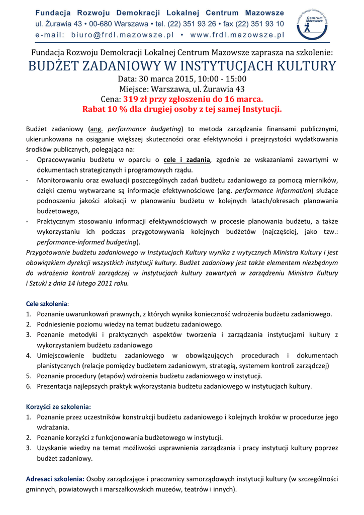 Fundacja Rozwoju Demokracji Lokalnej Centrum Mazowsze zaprasza na szkolenie: BUDŻET ZADANIOWY W INSTYTUCJACH KULTURY Data: 30 marca 2015, 10:00 - 15:00 Miejsce: Warszawa, ul. Żurawia 43 Cena: 319 zł przy zgłoszeniu do 16 marca. Rabat 10 % dla drugiej osoby z tej samej Instytucji. Budżet zadaniowy (ang. performance budgeting) to metoda zarządzania finansami publicznymi, ukierunkowana na osiąganie większej skuteczności oraz efektywności i przejrzystości wydatkowania środków publicznych, polegająca na: - Opracowywaniu budżetu w oparciu o cele i zadania, zgodnie ze wskazaniami zawartymi w dokumentach strategicznych i programowych rządu. - Monitorowaniu oraz ewaluacji poszczególnych zadań budżetu zadaniowego za pomocą mierników, dzięki czemu wytwarzane są informacje efektywnościowe (ang. performance information) służące podnoszeniu jakości alokacji w planowaniu budżetu w kolejnych latach/okresach planowania budżetowego, - Praktycznym stosowaniu informacji efektywnościowych w procesie planowania budżetu, a także wykorzystaniu ich podczas przygotowywania kolejnych budżetów (najczęściej, jako tzw.: performance-informed budgeting). Przygotowanie budżetu zadaniowego w Instytucjach Kultury wynika z wytycznych Ministra Kultury i jest obowiązkiem dyrekcji wszystkich instytucji kultury. Budżet zadaniowy jest także elementem niezbędnym do wdrożenia kontroli zarządczej w instytucjach kultury zawartych w zarządzeniu Ministra Kultury i Sztuki z dnia 14 lutego 2011 roku. Cele szkolenia: 1. Poznanie uwarunkowań prawnych, z których wynika konieczność wdrożenia budżetu zadaniowego. 2. Podniesienie poziomu wiedzy na temat budżetu zadaniowego. 3. Poznanie metodyki i praktycznych aspektów tworzenia i zarządzania instytucjami kultury z wykorzystaniem budżetu zadaniowego 4. Umiejscowienie budżetu zadaniowego w obowiązujących procedurach i dokumentach planistycznych (relacje pomiędzy budżetem zadaniowym, strategią, systemem kontroli zarządczej) 5. Poznanie procedury (etapów) wdrożenia budżetu zadaniowego w instytucji. 6. Prezentacja najlepszych praktyk wykorzystania budżetu zadaniowego w instytucjach kultury. Korzyści ze szkolenia: 1. Poznanie przez uczestników konstrukcji budżetu zadaniowego i kolejnych kroków w procedurze jego wdrażania. 2. Poznanie korzyści z funkcjonowania budżetowego w instytucji. 3. Uzyskanie wiedzy na temat możliwości usprawnienia zarządzania i pracy instytucji kultury poprzez budżet zadaniowy. Adresaci szkolenia: Osoby zarządzające i pracownicy samorządowych instytucji kultury (w szczególności gminnych, powiatowych i marszałkowskich muzeów, teatrów i innych). Szkolenie w pierwszej kolejności skierowane jest do menadżerów kultury oraz osób zarządzających finansami w instytucjach kultury. Trener 1: Konsultant, Ekspert w zakresie finansów oraz rynku energetycznego i teleinformatycznego. Realizował liczne projekty związane z efektywnością działania podmiotów sektora finansów publicznych. Od 2004 roku działa w zakresie doradztwa biznesowego – specjalizuje się w tworzeniu biznes planów, analiz finansowych i strategicznych oraz projektach związanych z funduszami UE. Posiada wieloletnie doświadczenie we współpracy z JST, jednostkami administracji publicznej oraz instytucjami nauki i kultury. Wykładowca akademicki, autor opracowań i publikacji z dziedziny innowacyjności, strategii i finansów. Magister Zarządzania i Marketingu SGH w Warszawie, MBA (Szkoła Biznesu PW, przy udziale LBS, HEC Paris, NHH Bergen). Trener 2: Ekonomistka, trener i coach, prowadzi własną firmę doradczą. Zawodowo specjalizuje się w zarządzaniu, marketingu kultury, zarządzaniu projektami, zarządzaniu strategicznym, zarządzaniu zmianą. Jest ekspertem w zakresie zarządzaniu projektami współfinansowanymi ze środków UE. W latach 2005-2010 wraz z zespołem przygotowała Ośrodek Przetwarzania Informacji do roli Instytucji Wdrażającej programy operacyjne UE (IP II) i zarządzała pionem Wdrażania Funduszy. Była dyrektorem zarządzającym Muzeum Łazienki Królewskie oraz doradcą dyrektora Muzeum Historycznego m.st. Warszawy. Absolwentka Katedry Samorządu Terytorialnego i Gospodarki Lokalnej Szkoły Głównej Handlowej. Program szkolenia: 1. Wprowadzenie – co to jest budżet zadaniowy, dlaczego warto go przygotować, wymagania prawne w tym zakresie– prezentacja - 15 minut 2. Model budżetu zadaniowego – z czego się składa i co prezentuje budżet zadaniowy, podstawowe pojęcia i definicje – prezentacja i ćwiczenie praktyczne – 45 minut 3. Konstrukcja budżetu zadaniowego – jak stworzyć dobry budżet zadaniowy w instytucji kultury, definicja zadań i celów, zaangażowanie pracowników, sposób pracy, szacowanie kosztów, budowanie budżetów poszczególnych działów i budżetu całej instytucji – prezentacja i ćwiczenie praktyczne – 120 minut 4. Przerwa – 15 minut 5. Wdrożenie budżetu zadaniowego w instytucji kultury – narzędzia i procedury umożliwiające wdrożenie i monitorowanie budżetu zadaniowego w instytucji kultury, proces wdrożenia – zatwierdzenie budżetu przez władze instytucji, praktyczne zastosowanie budżetu w działalności instytucji – prezentacja i ćwiczenie praktyczne – 60 minut 6. Lunch – 45 minut 7. Ćwiczenie praktyczne – wspólne opracowanie zarysu budżetu zadaniowego w wybranej instytucji kultury – na przykładzie zgłoszonym przez uczestników lub przygotowanym przez prowadzącego – 120 minut. ZGŁOSZENIE BUDŻET ZADANIOWY W INSTYTUCJACH KULTURY Data: 30 marca 2015, 10:00 - 15:00 Miejsce: Warszawa, ul. Żurawia 43 Cena: 319 zł przy zgłoszeniu do 16 marca. Rabat 10 % dla drugiej osoby z tej samej Instytucji. Instytucja (dane do faktury): ................................................................................................ Adres: .............................................................................................