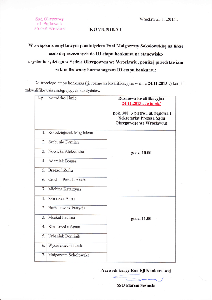 asystenta sędziego w Sądzie Okręgowym we Wrocławiu, poniżej przedstawiam